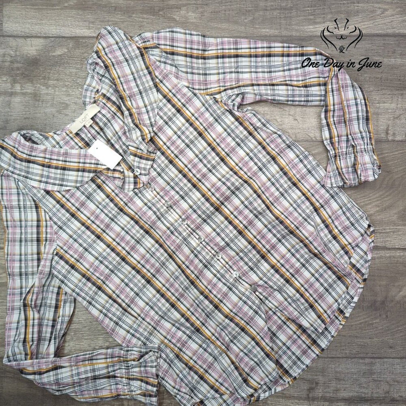 In colors that twirl like a merry-go-round, this Loft button-down's the best top to be found! With cotton, some rayon, and a touch of surprise, it's new with its tags and a treat for your eyes!
