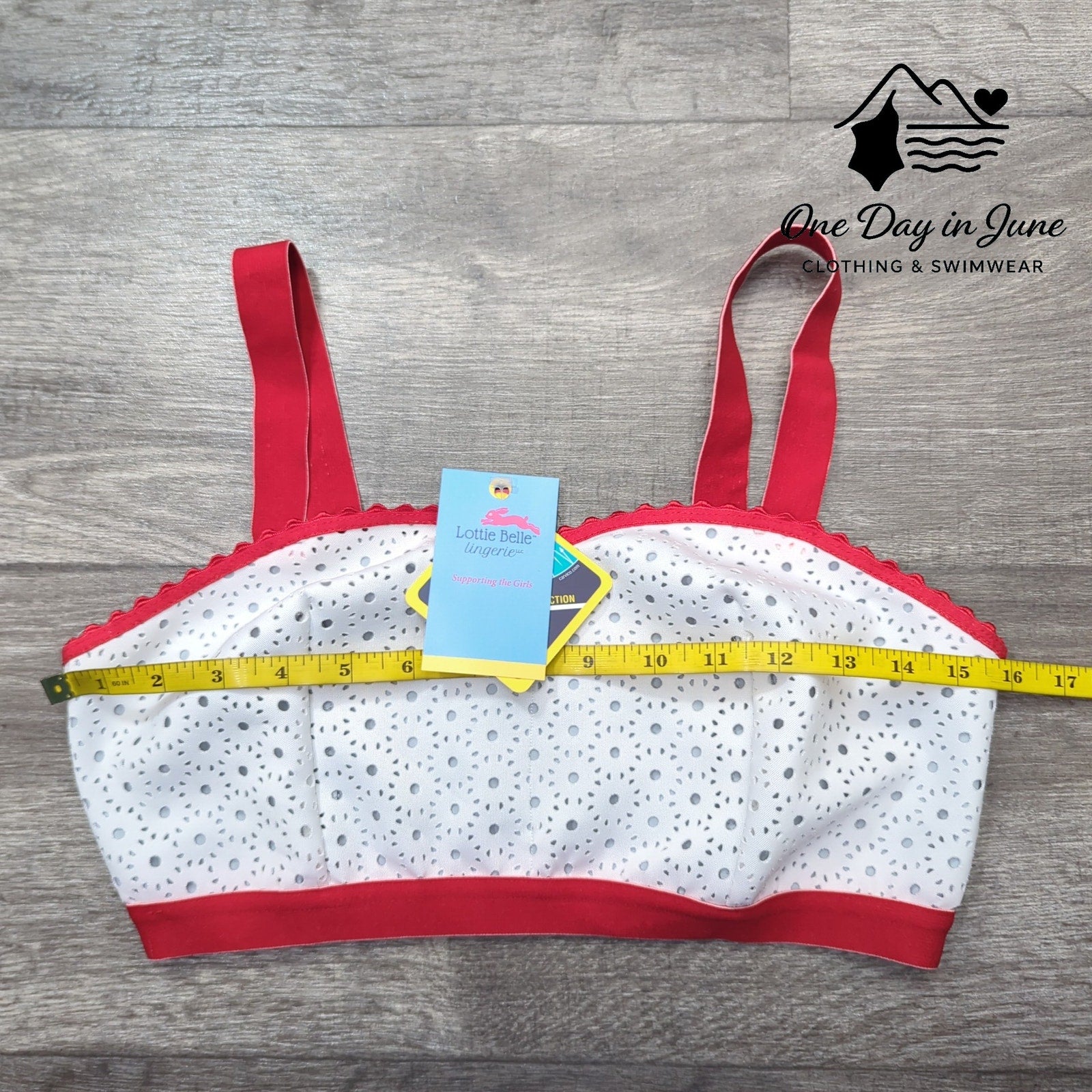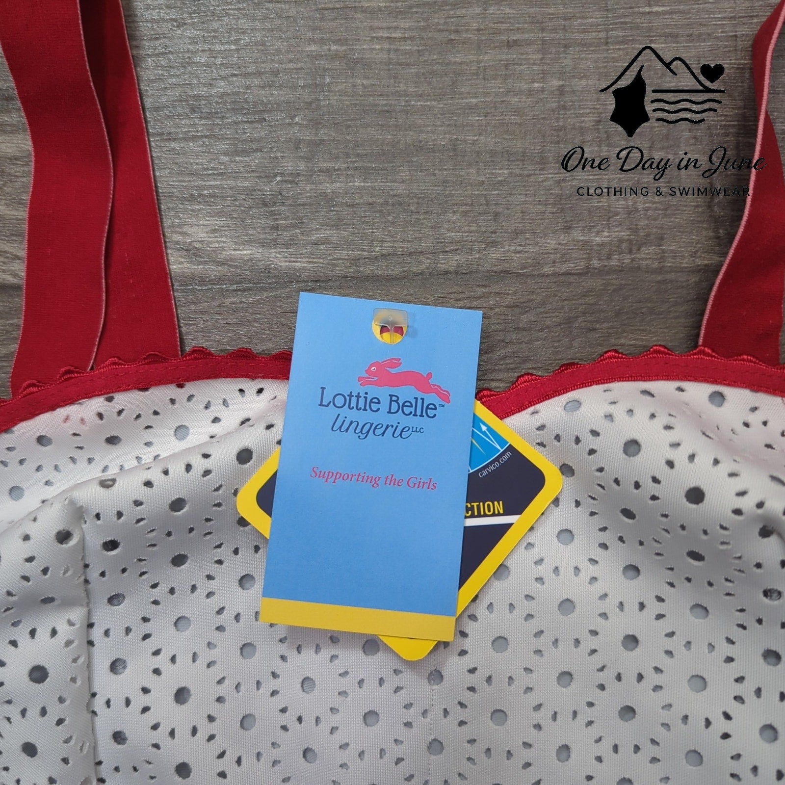 With stripes of white, grey, and red so neat, this Lottie Belle top can't be beat! Splash and frolic without any fear, this brand new bikini top brings summer cheer.