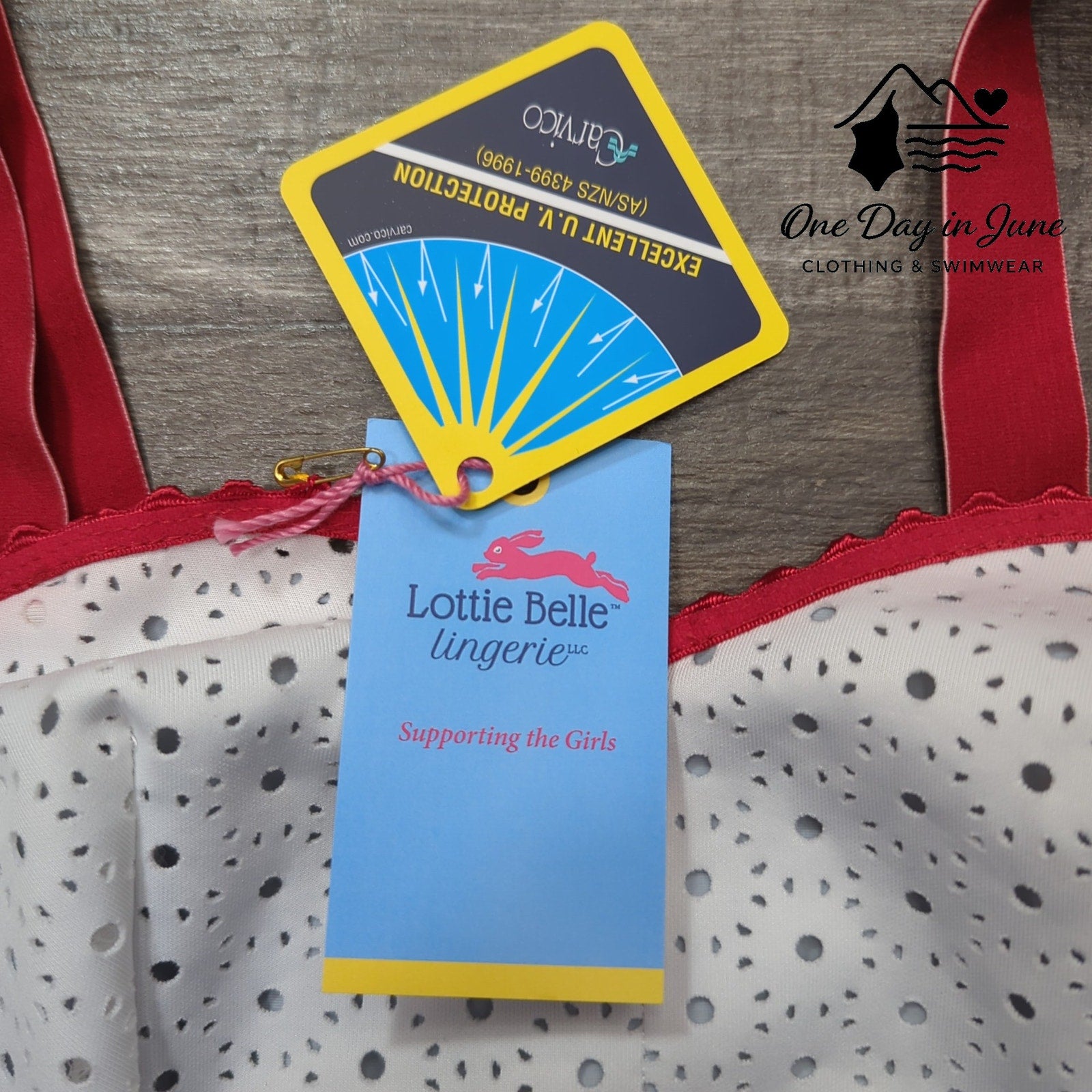 This enchanting Lottie Belle bikini top in a charming medley of white, grey, and red hues promises to elevate one's seaside ensemble with remarkable elegance. Crafted from a most excellent blend of polyester and elastane, it offers both comfort and durability, making it a delightful companion for afternoons spent in pleasant conversation by the shore or in quiet contemplation upon the sand.