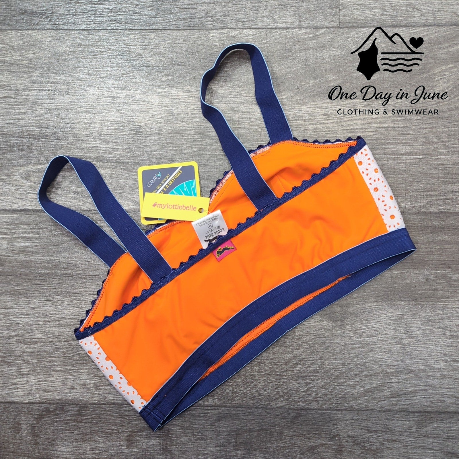 A most charming companion for seaside promenades, this Lottie Belle bikini top in white, blue, and orange hues will surely catch the eye of discerning bathers. The fabric, a delightful blend of polyester and elastane, offers both comfort and elegance for the modern lady who wishes to indulge in the pleasures of swimming without sacrificing style.