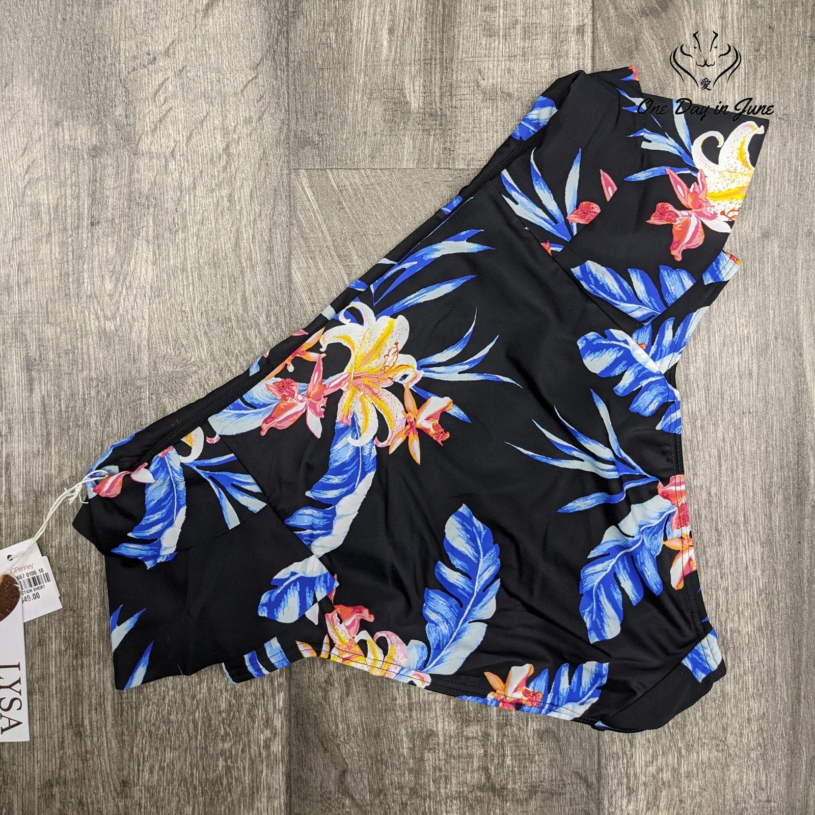 Ebony waves of ruffled fabric cascade gracefully across this alluring bikini bottom from Lysa. A perfect marriage of elegance and whimsy, this piece whispers of leisurely afternoons by crystalline pools and moonlit beach walks.