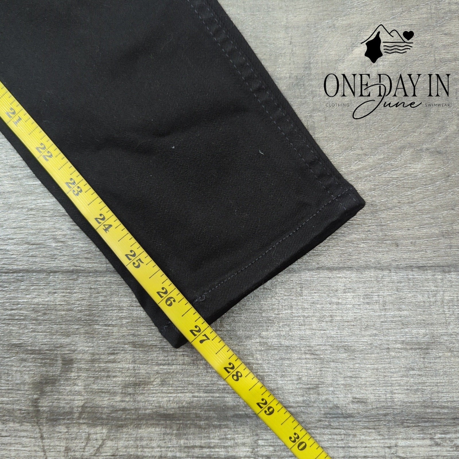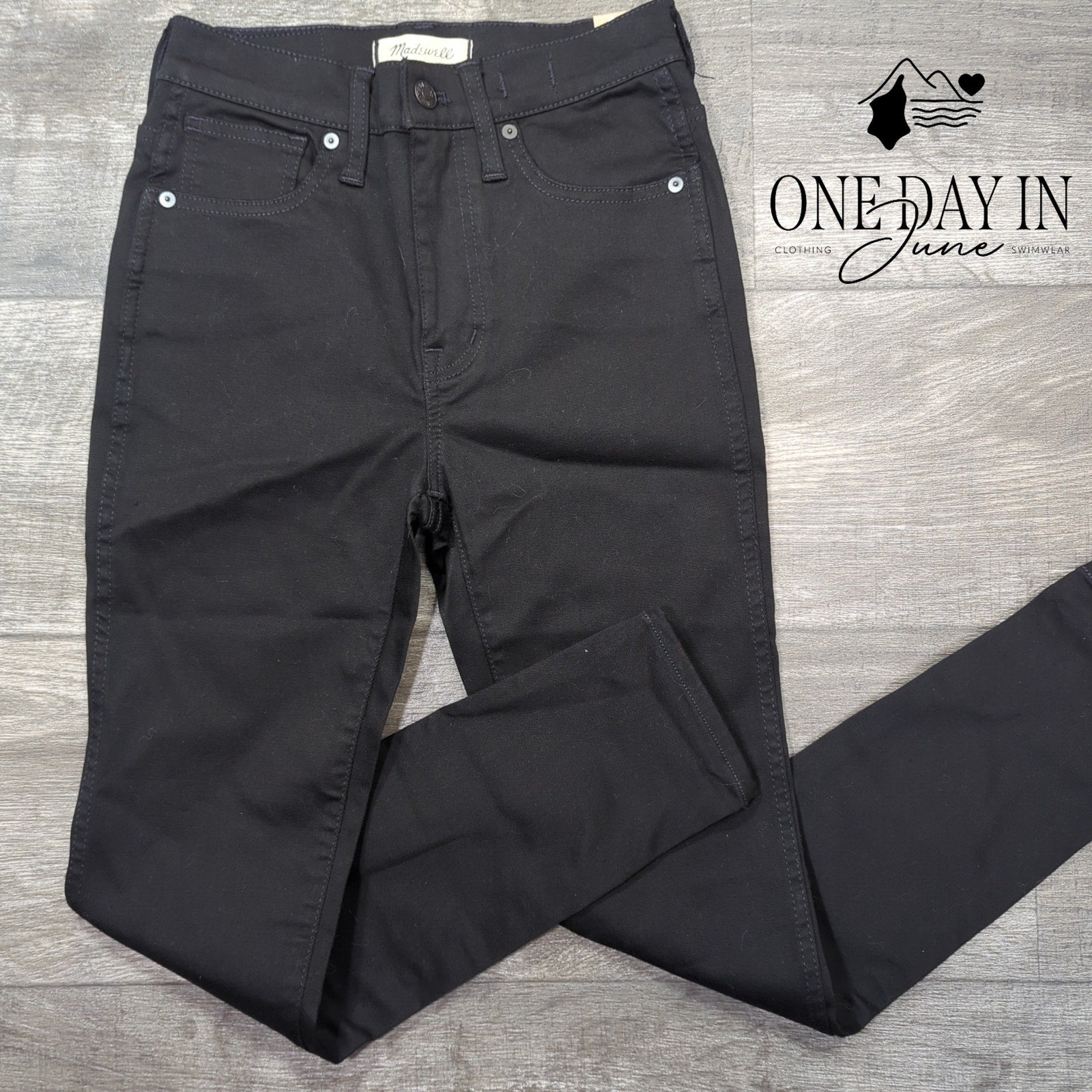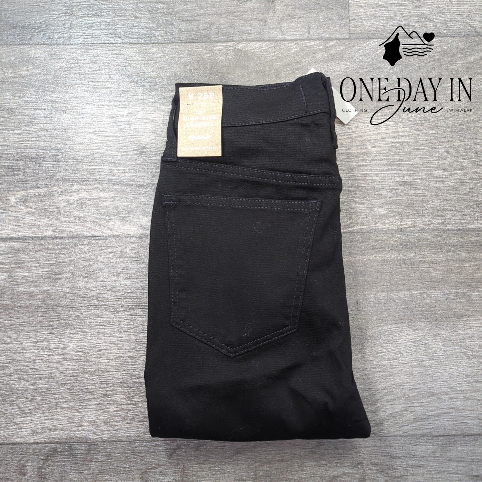 These sleek black skinny jeans will make you feel fine, with a high-rise fit that's simply divine! Made by Madewell with cotton and stretch so neat, they'll hug your curves from waist to feet!