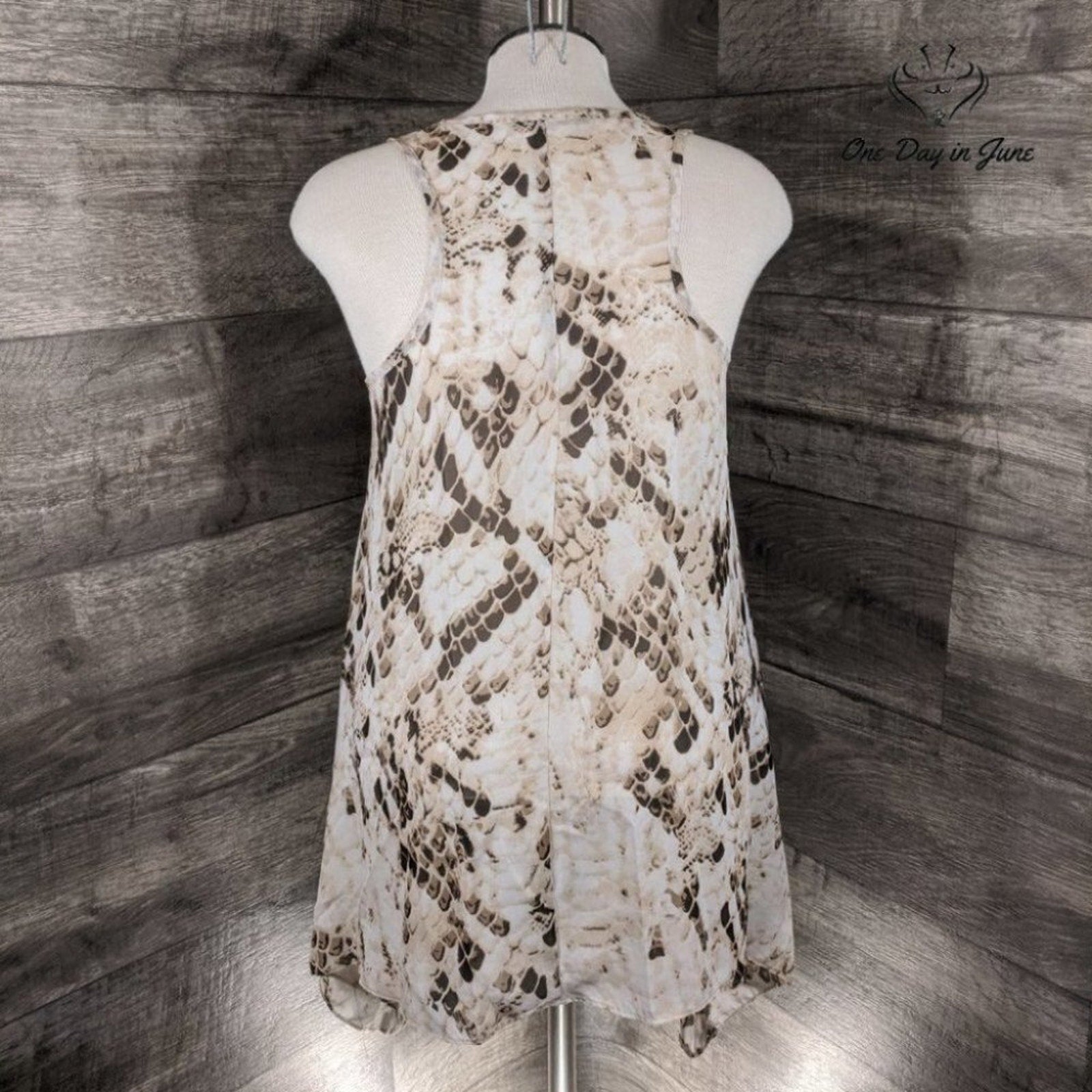 A whisper of polyester floats like champagne bubbles, this sleeveless Madison Paige creation captures summer's golden languor with its brown and tan hues. Sheer as a debutante's promise, it drapes with that careless grace worn by women who understand the art of understatement. Gently loved, it awaits its next chapter among sun-drenched afternoons and twilight soirées.