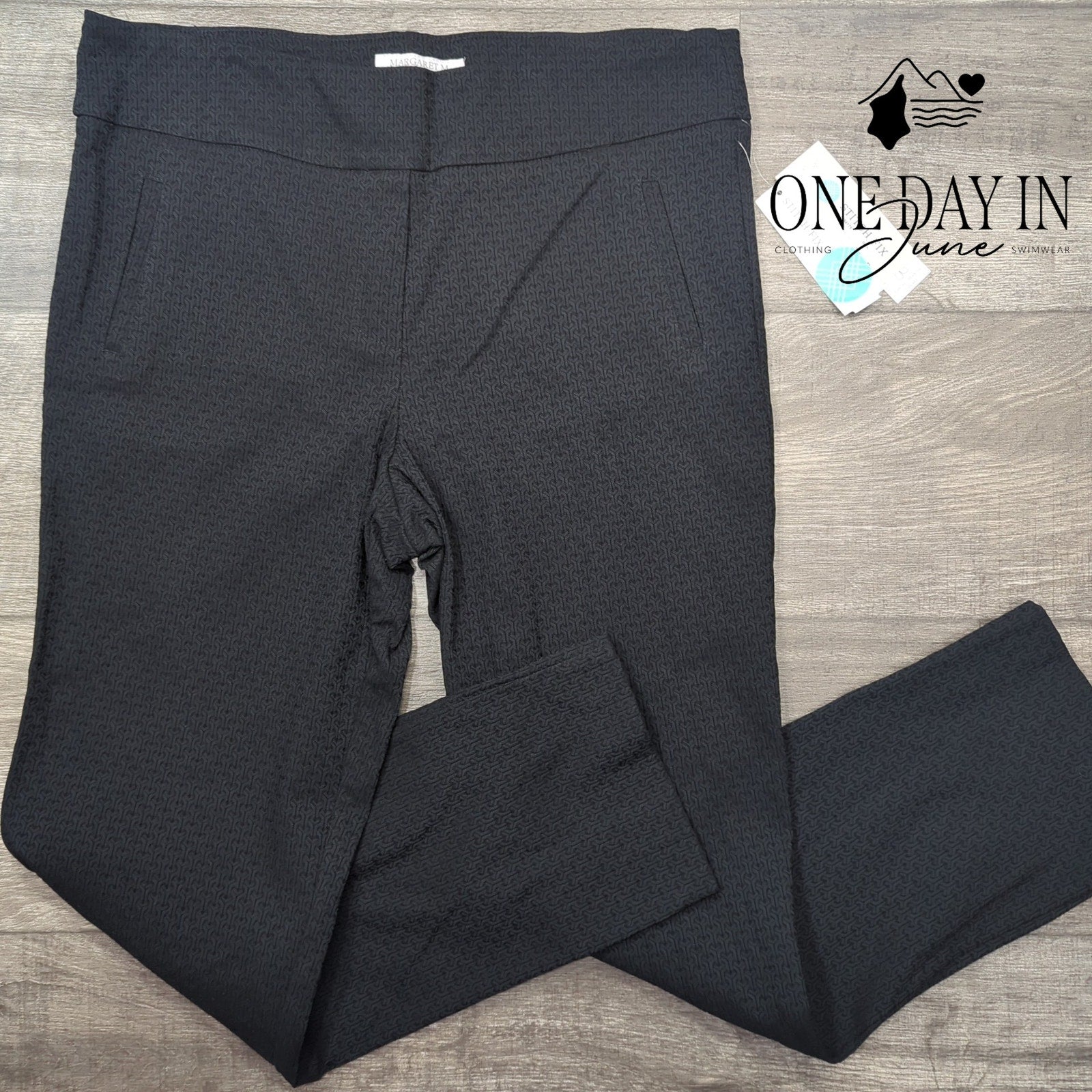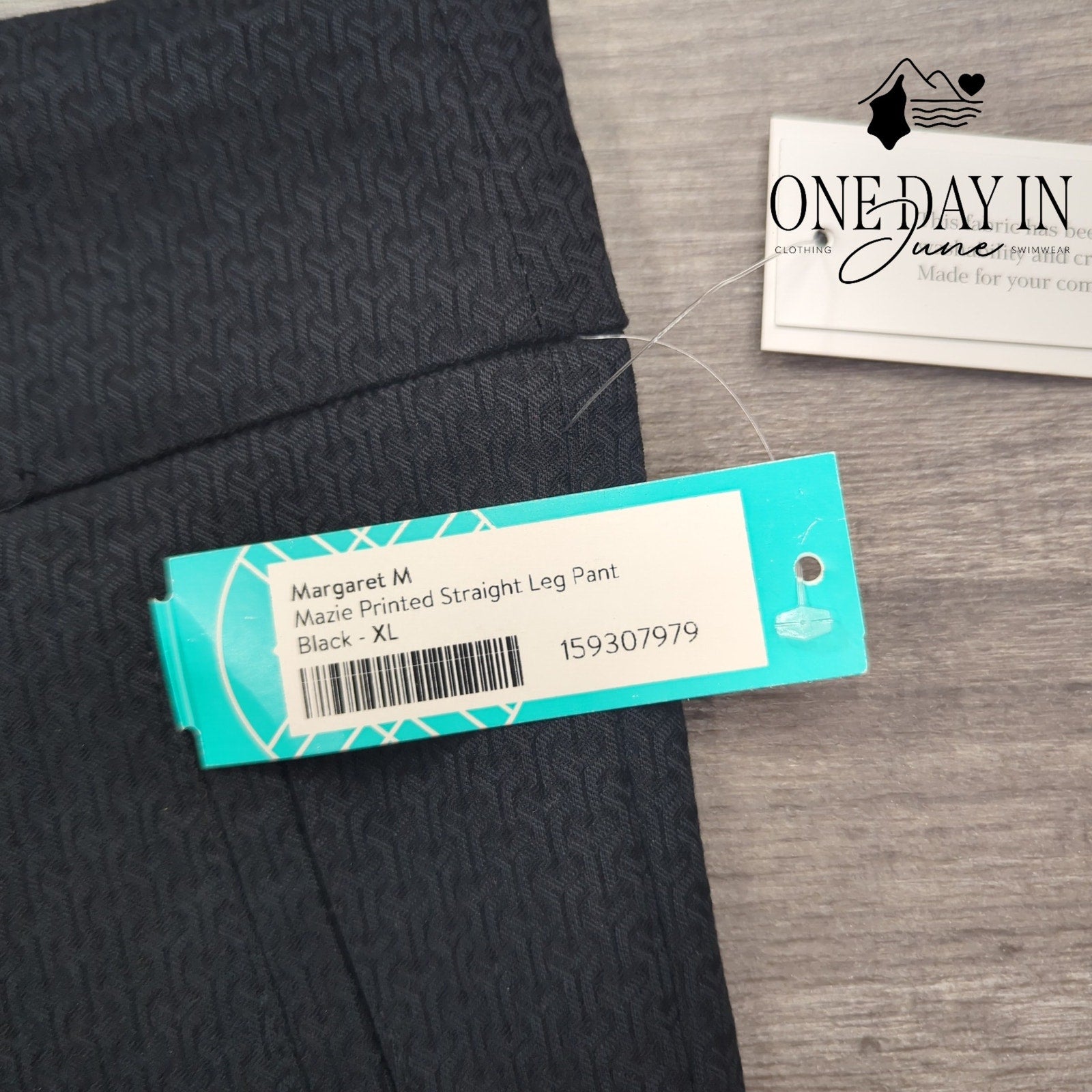These Margaret M straight leg pants in elegant black present a most agreeable silhouette for the discerning lady. The Mazie print adds a touch of refined charm to the classic design, while the thoughtfully blended fabric ensures both comfort and grace in every movement. A delightful addition to any lady's wardrobe, these pants promise to serve with distinction on both ordinary and more elevated occasions.