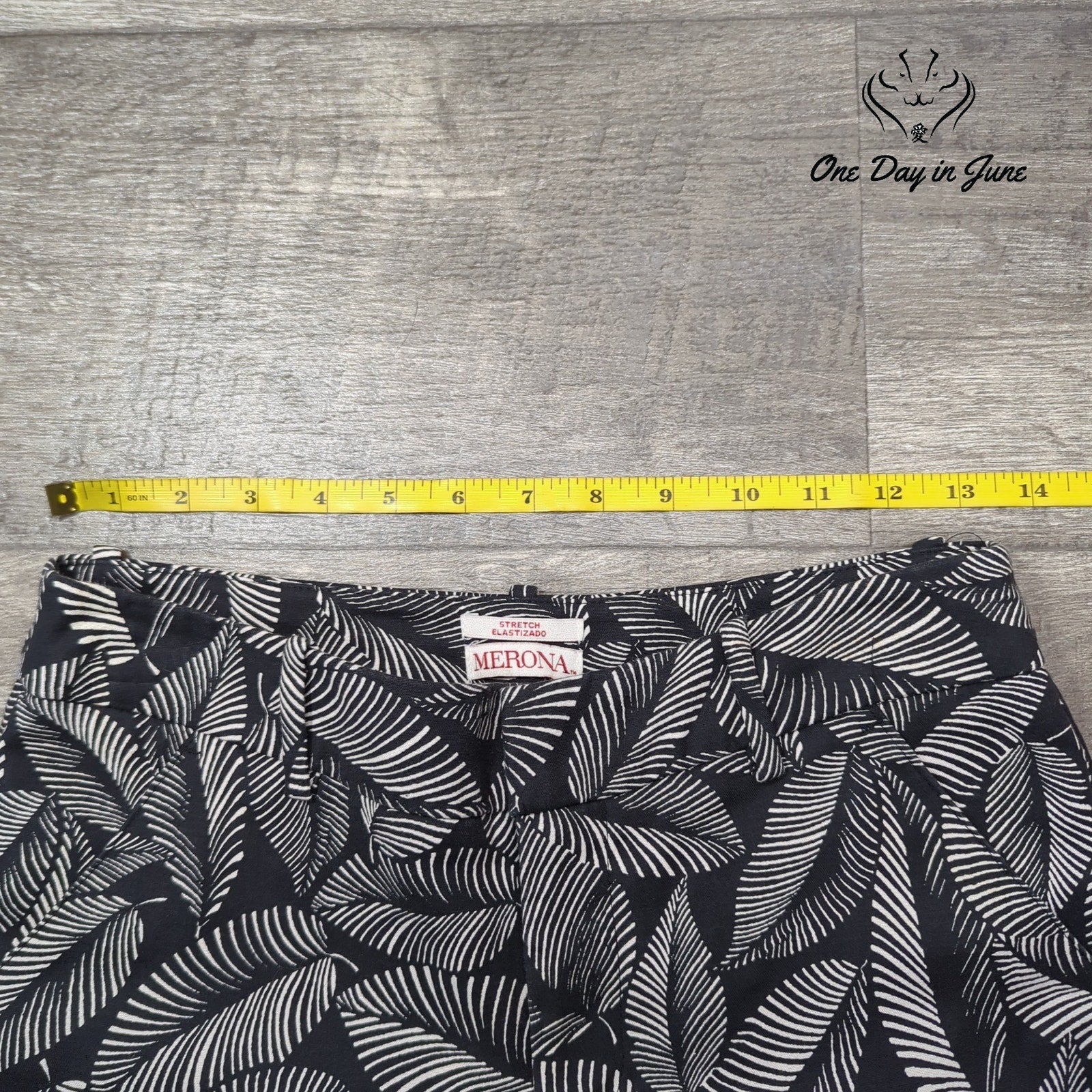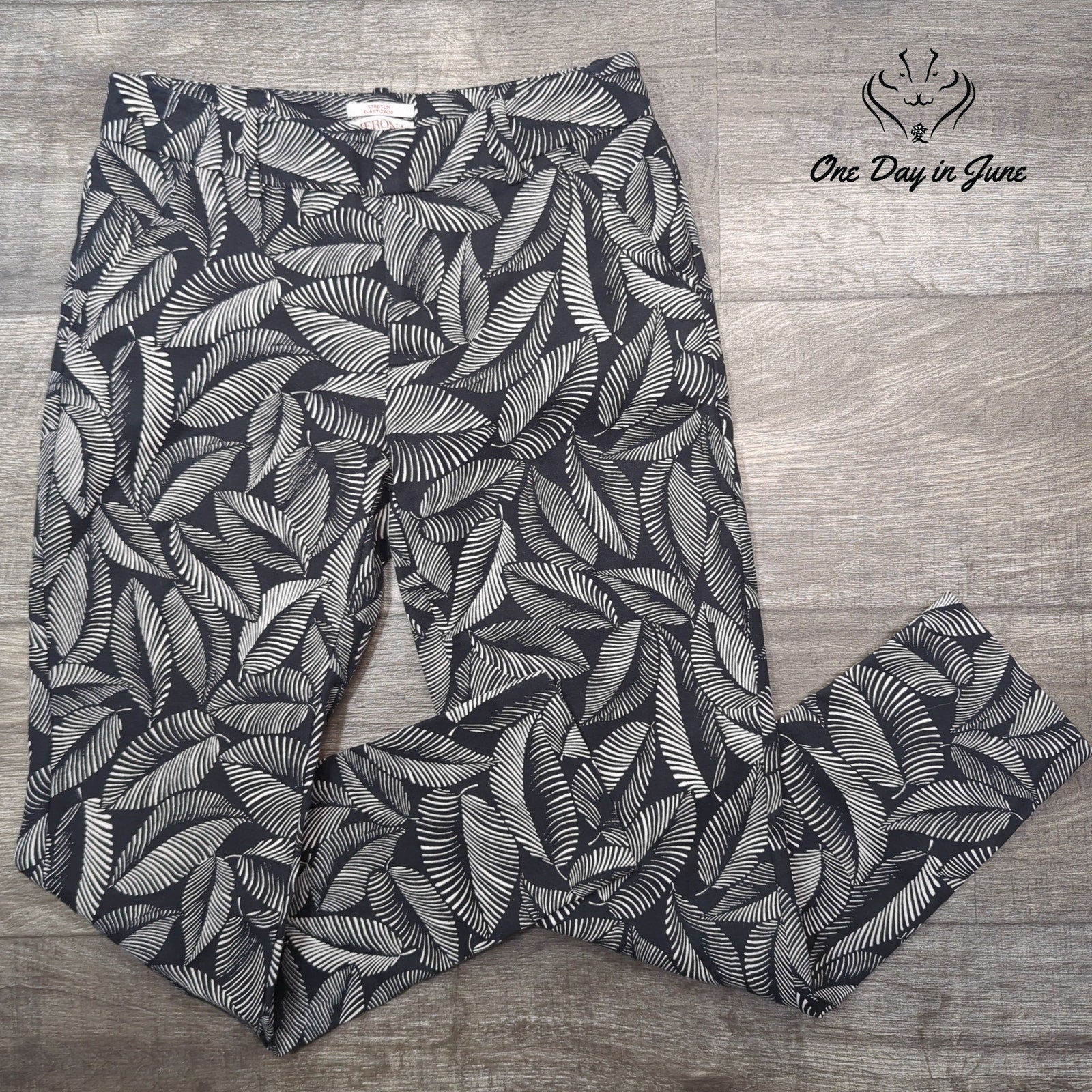 The stark black fabric erupts into a twisted jungle fever dream of tropical leaves dancing across these ankle-length beauties like a midnight garden gone completely savage in the darkness. The cotton-spandex blend wraps around you with the sort of comfort that makes you question whether you've somehow slipped into an alternate dimension where pants have achieved consciousness and chosen you as their rightful owner - and they're just gently used enough to have developed their own beautiful character, like a well-worn paperback that's seen things you wouldn't believe.