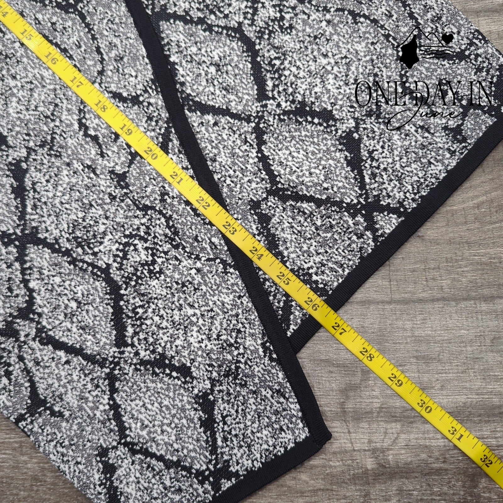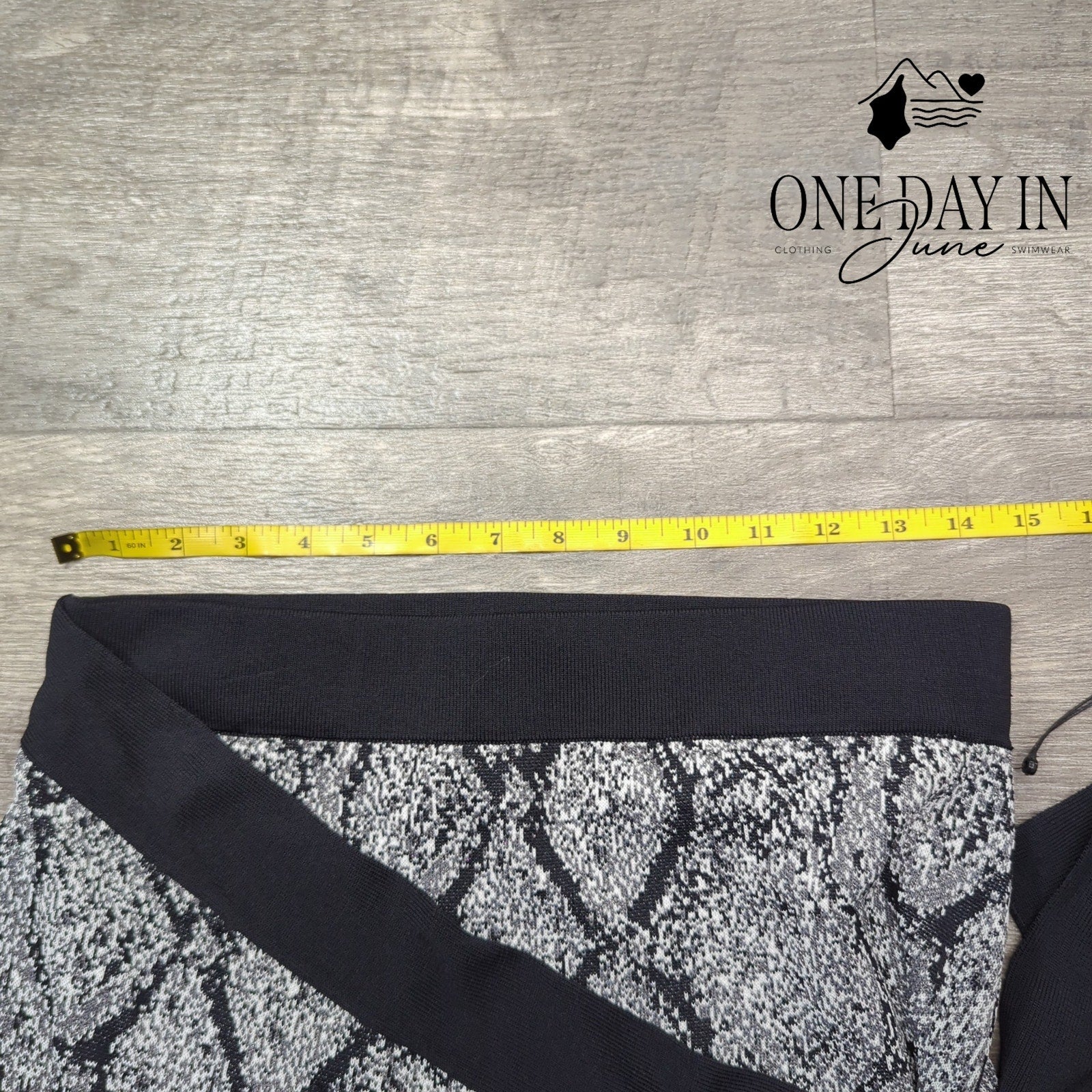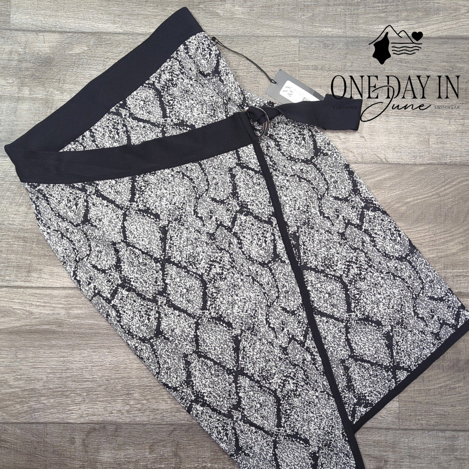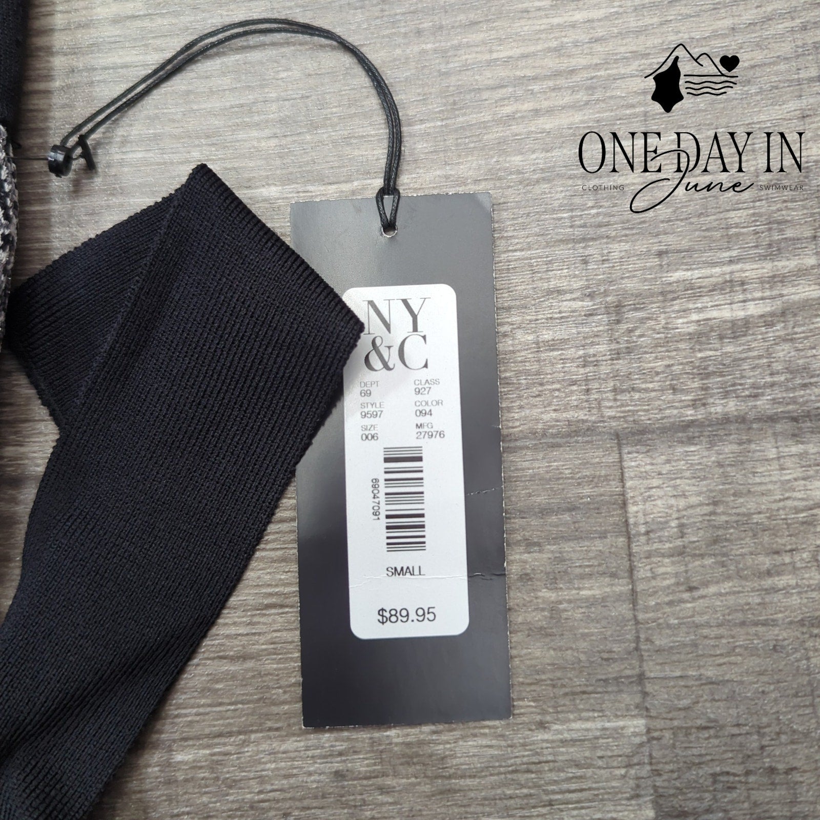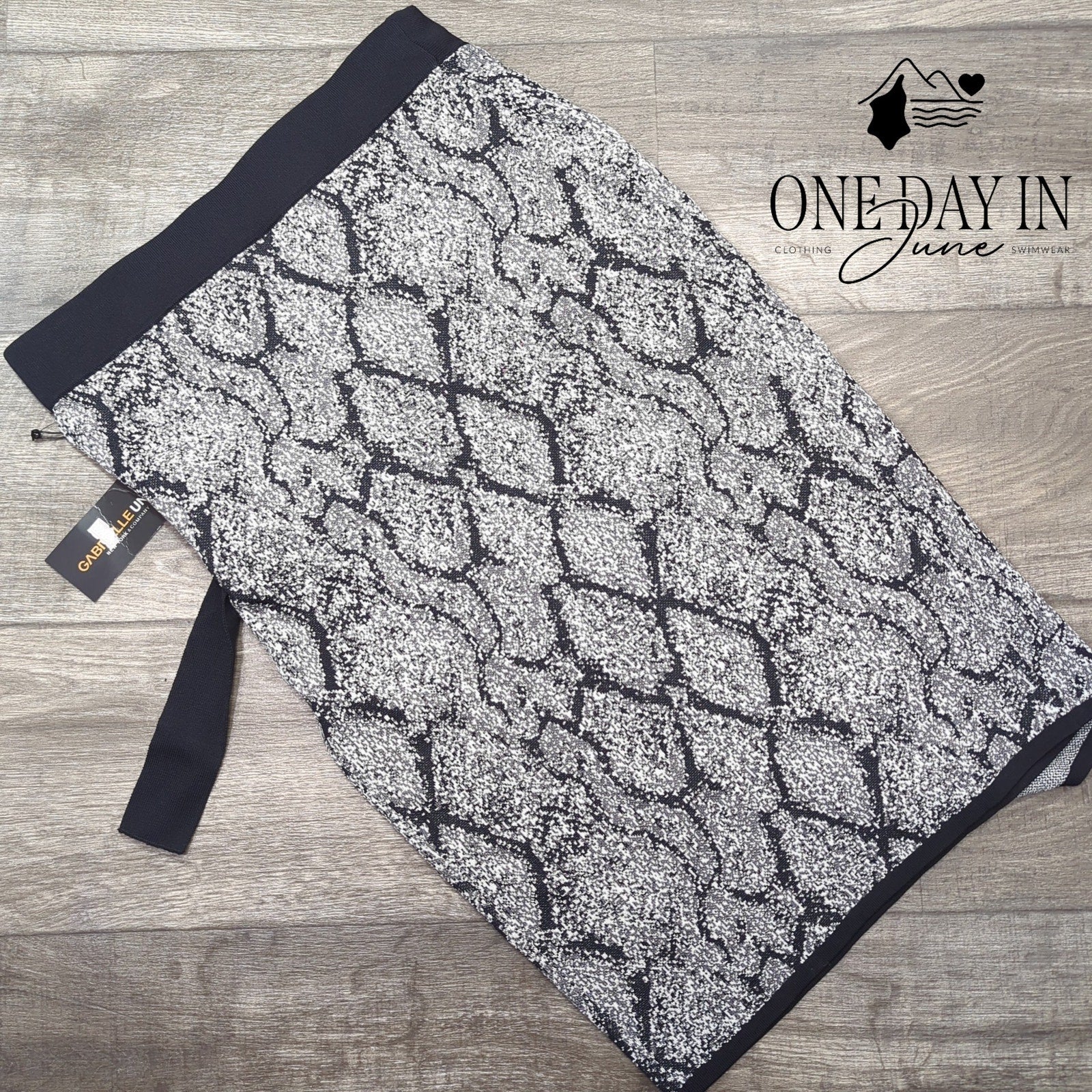 A most elegant wrap pencil skirt from the distinguished New York & Company collection, crafted in a timeless black and white palette that speaks to both sophistication and versatility. The flattering silhouette promises to complement any lady's figure with the utmost grace, while the refined blend of rayon, nylon, and polyester ensures both comfort and durability for the discerning wearer. This charming piece arrives in pristine condition, never worn and ready to grace the wardrobe of any woman of taste.