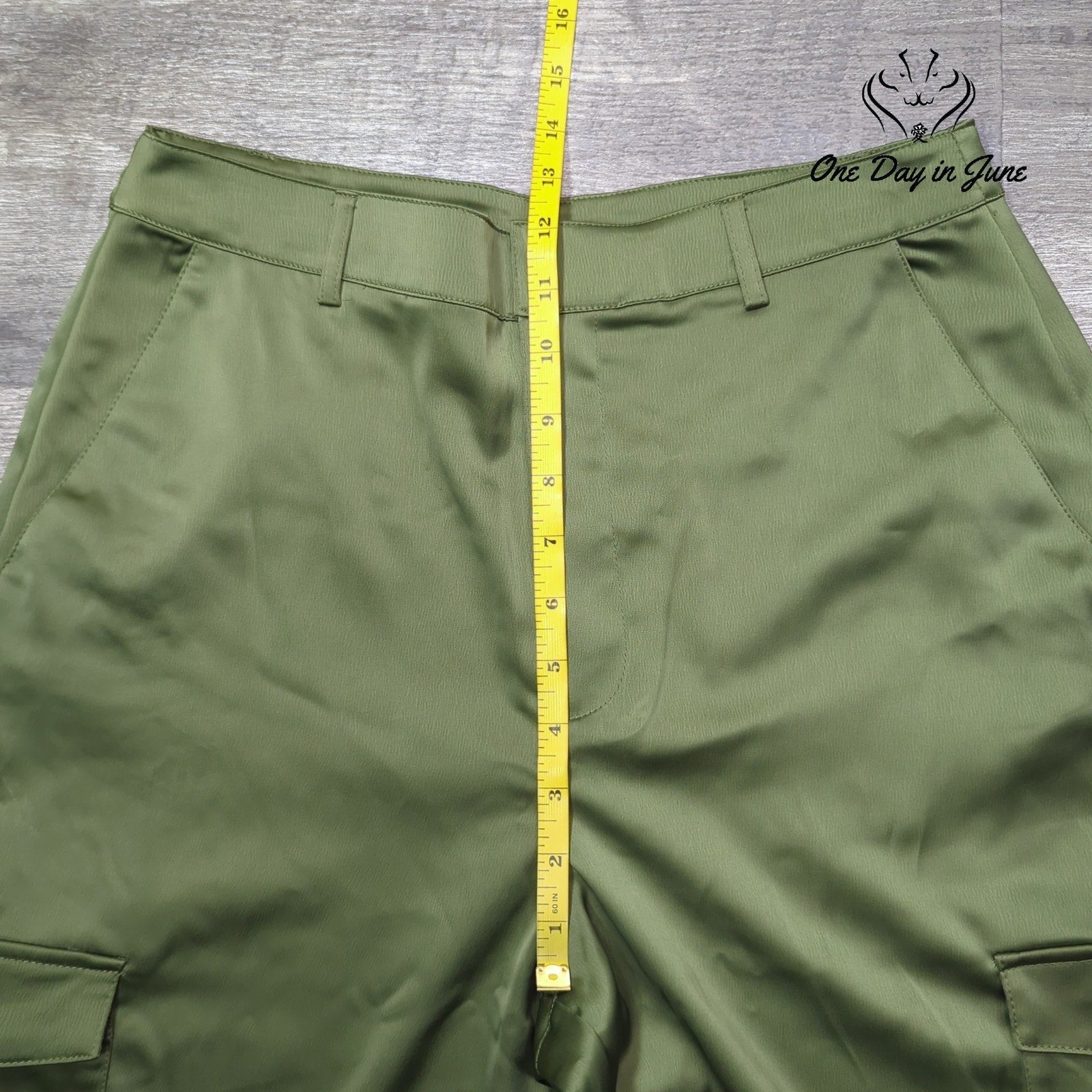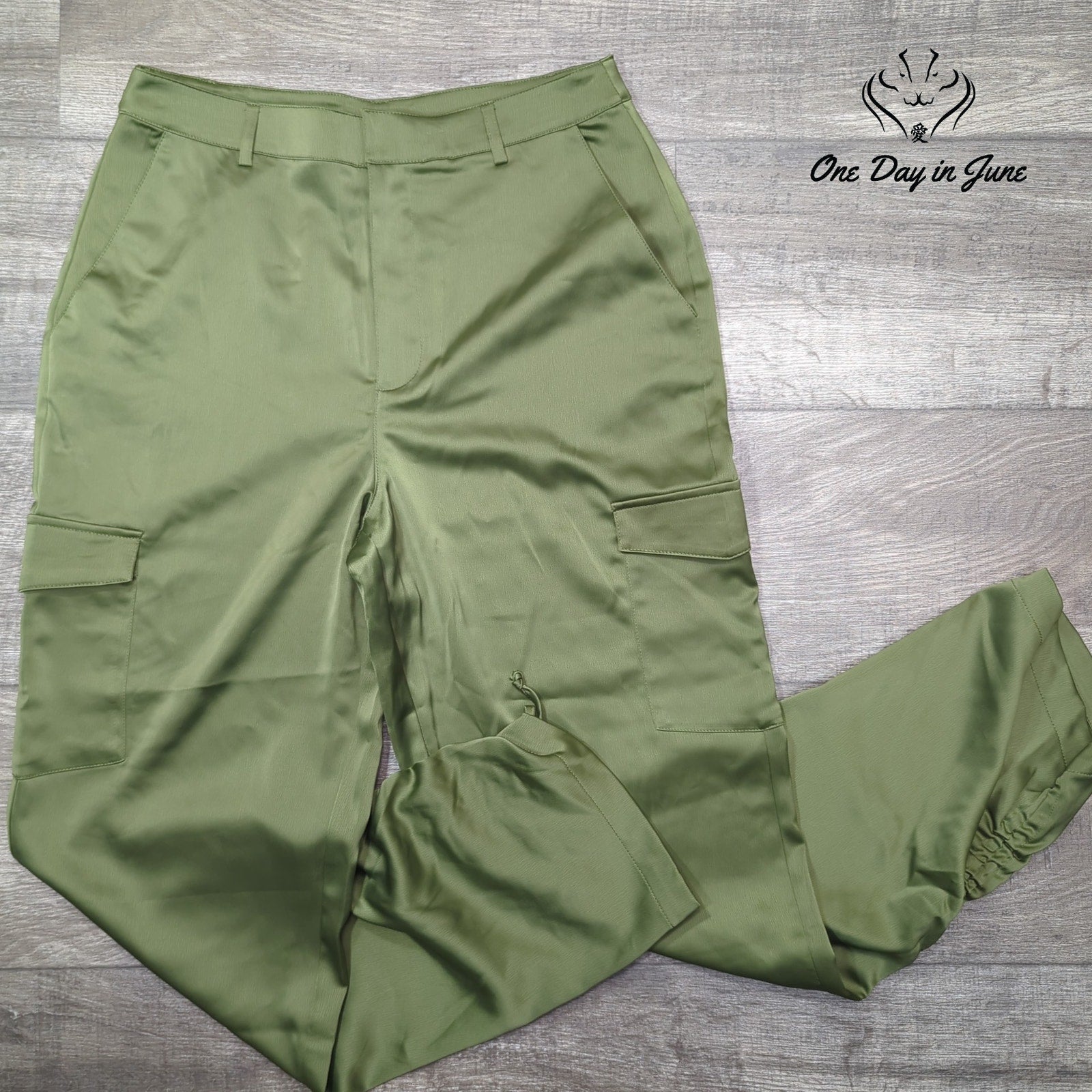 These charming cargo-style pants, crafted by the esteemed Nicole Miller, boast a most becoming ruched leg design. Their verdant hue is sure to enliven any ensemble, while the polyester and spandex blend promises both comfort and elegance for the discerning wearer.
