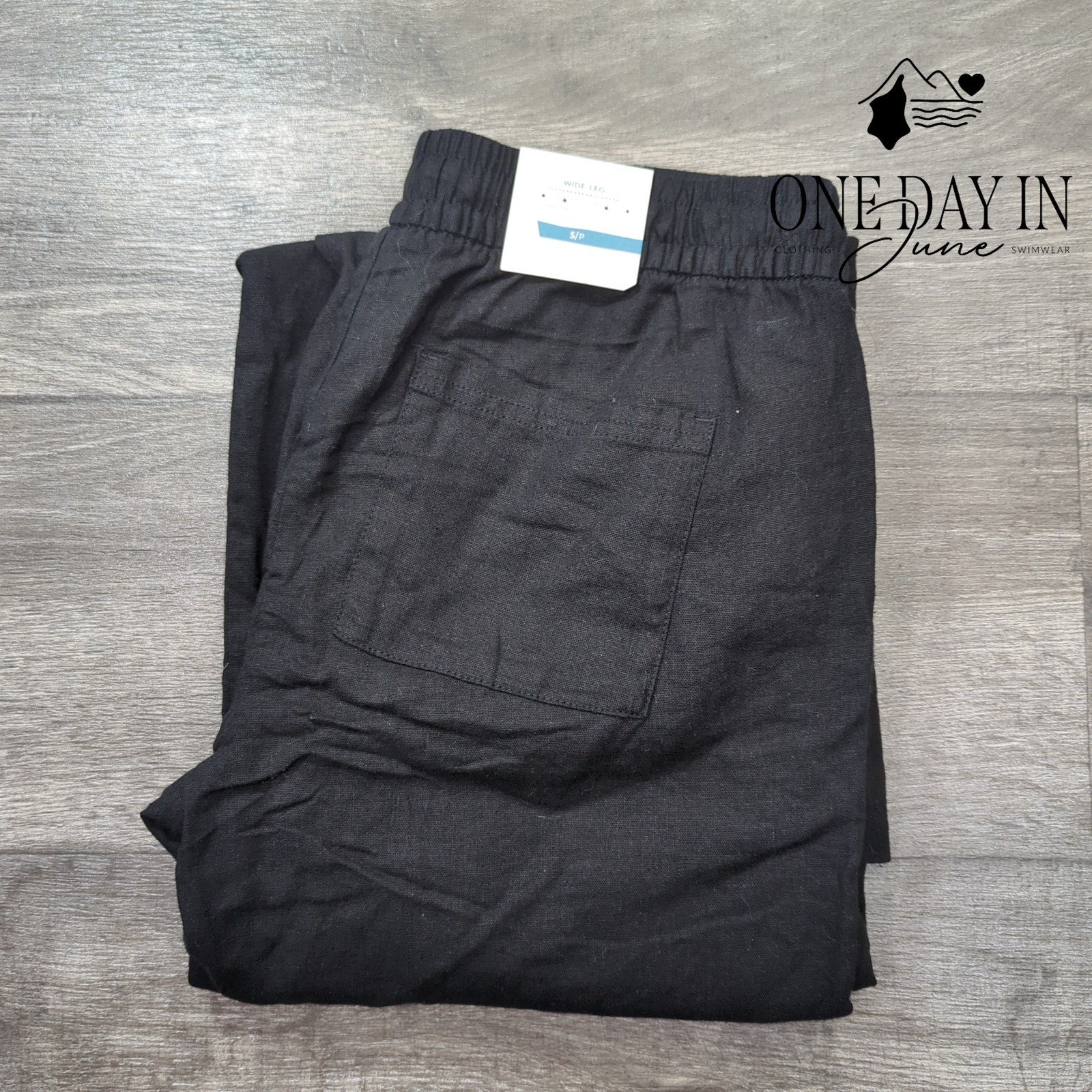 A most elegant pair of wide leg pants in the deepest black, fashioned from a harmonious blend of linen and rayon that promises both comfort and genteel breathability. The drawstring waist offers a most agreeable accommodation to one's figure, whilst the flowing silhouette lends an air of effortless sophistication to any lady's wardrobe. These trousers arrive in pristine condition, never worn, and are certain to prove themselves a versatile companion for both morning calls and afternoon promenades.