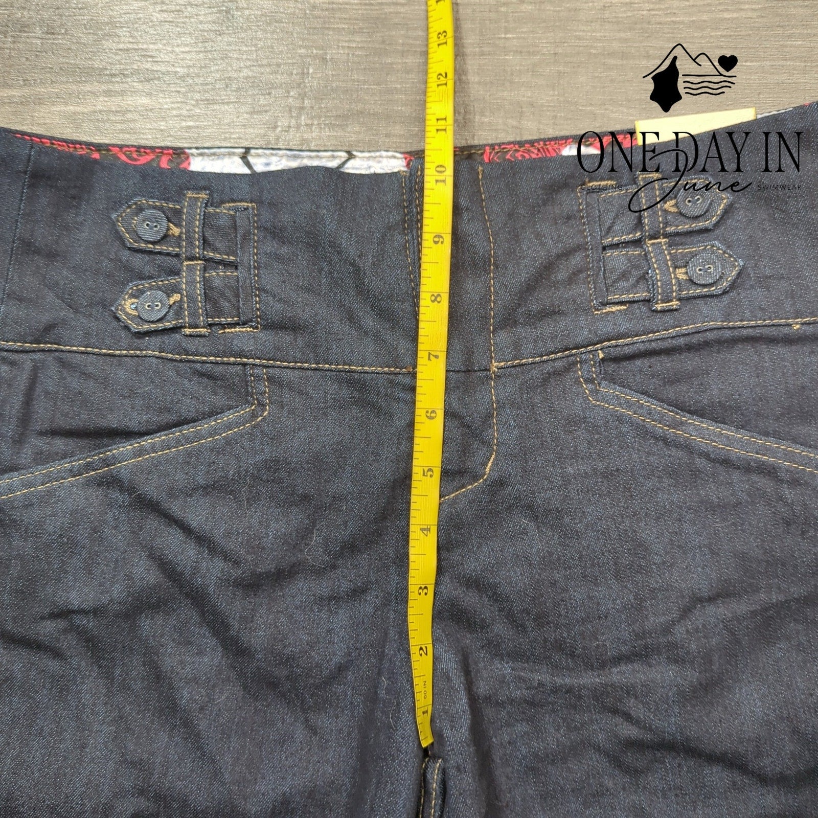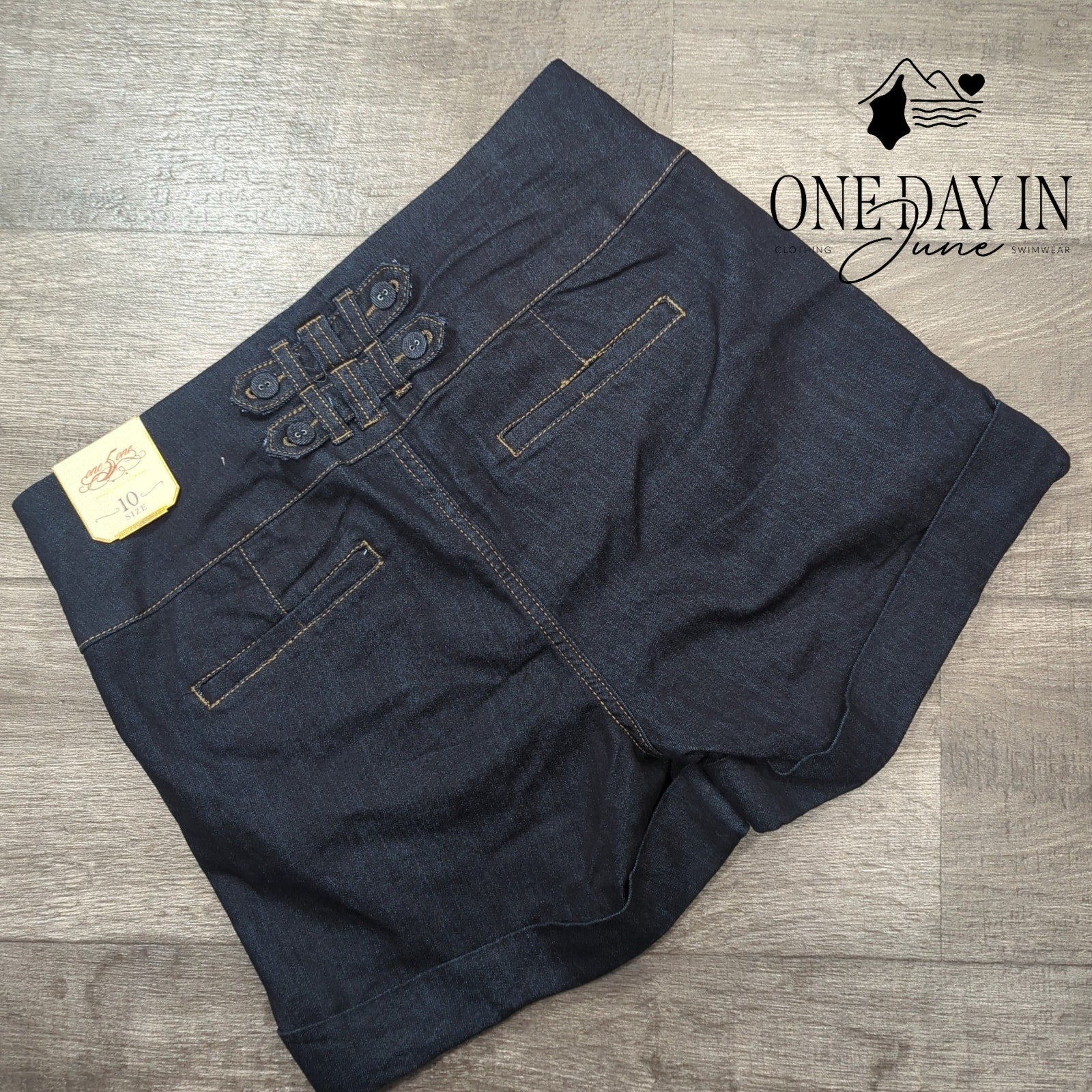 A most agreeable pair of high waist denim shorts in a becoming shade of blue, crafted by One5One with excellent attention to detail. The composition of cotton, polyester, and spandex ensures both comfort and a flattering silhouette that would suit any lady's summer pursuits. New with tags and ready to accompany you on all manner of pleasant excursions.
