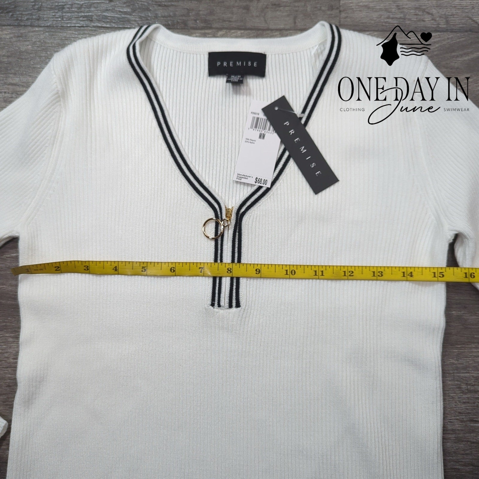The ribbed texture on this quarter-zip sweater hits you like a freight train of comfort, all wrapped up in pristine white fabric that screams sophistication while whispering rebellion. Premise knew what they were doing when they threw together this rayon-nylon blend—it's the kind of long-sleeved armor you need when the world gets too weird and you just want to look good doing absolutely nothing. Fresh tags still attached, never worn, ready to accompany you on whatever strange journey lies ahead.