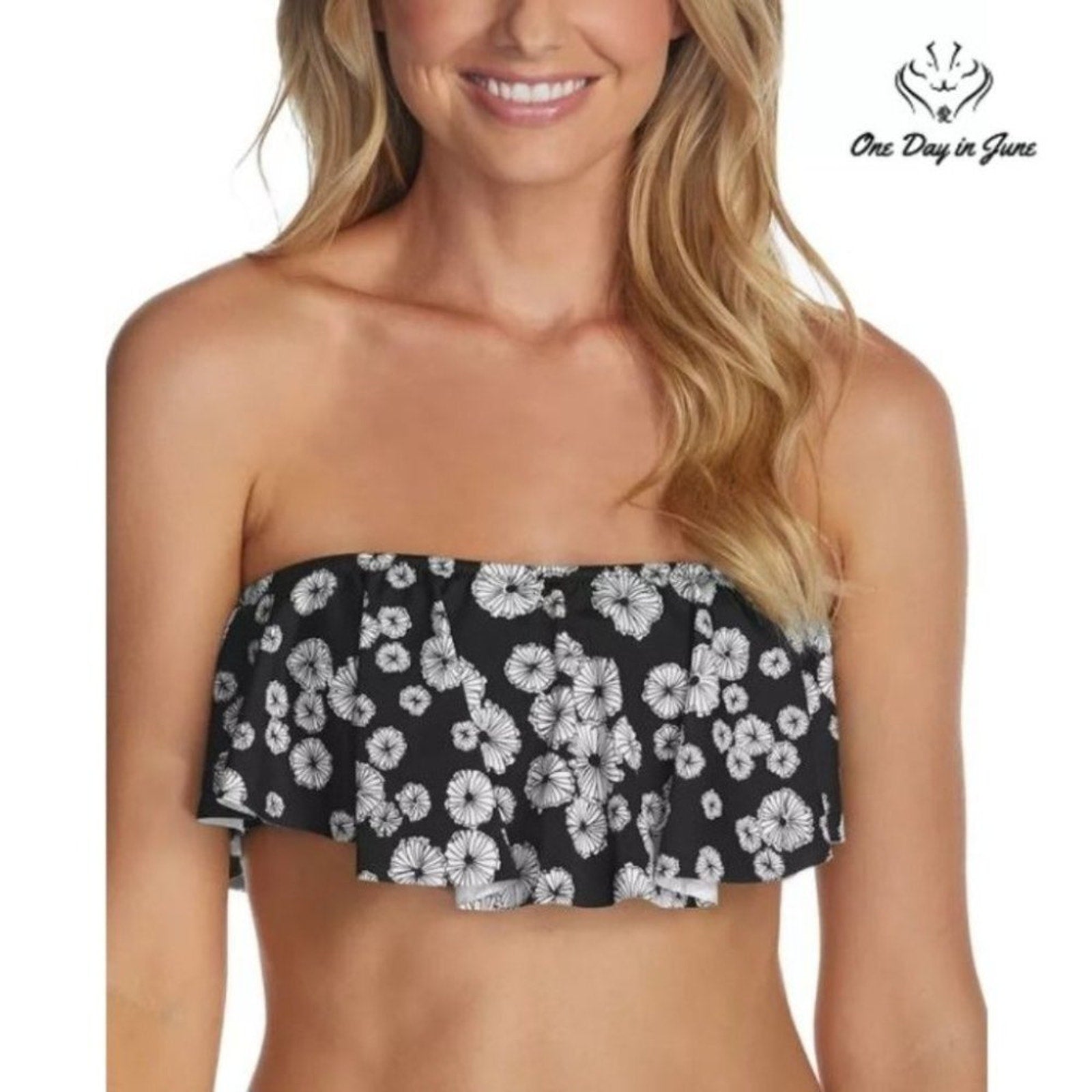 A whimsical bandeau in black and white delight, with flouncy frills that dance in sweet summer light. This Raisins bikini top's a splendid sight to see, perfect for beach days or poolside glee!