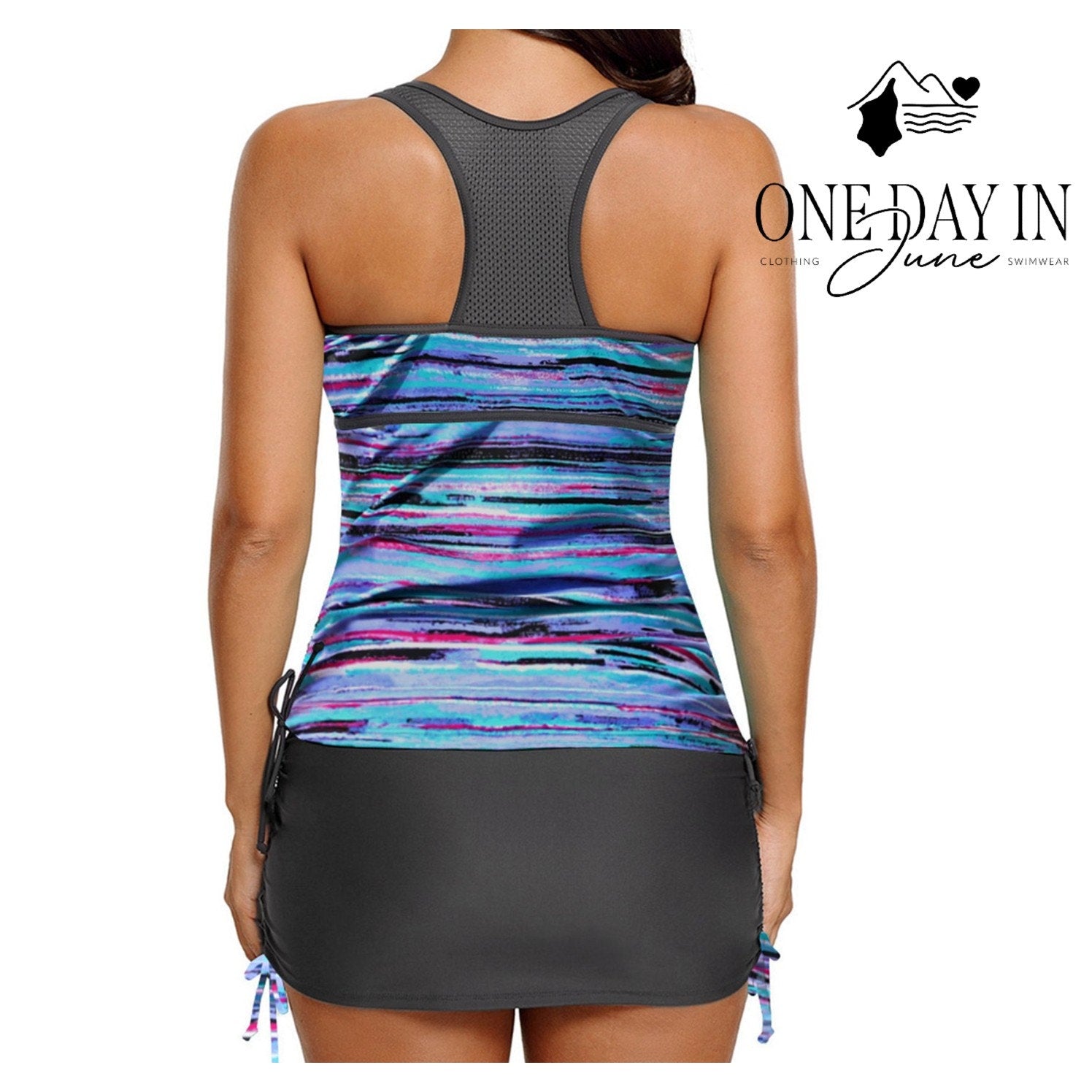 Behold this most charming skirted racerback tankini, fashioned in a delightful grey and blue that would flatter any lady of discerning taste. The elegant design combines the comfort of a racerback silhouette with the modest coverage of a skirted bottom, proving most suitable for seaside adventures or country house pool parties. Crafted from a delightful blend of polyester and spandex, this Rekita creation promises both style and comfort for the modern lady's aquatic pursuits.