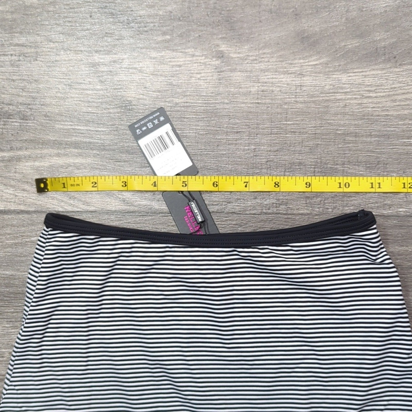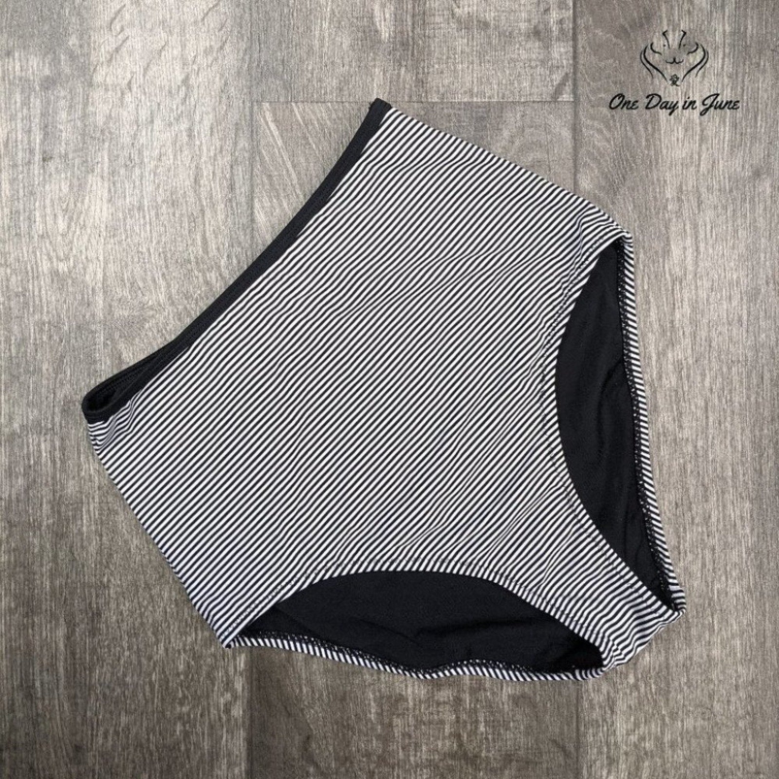 A most elegant bikini bottom in a striking monochromatic pattern of black and white, perfect for the discerning lady who wishes to cut a fashionable figure at the seaside. The high-cut silhouette offers a particularly flattering line, while the supple blend of polyester and spandex ensures both comfort and a becoming fit.