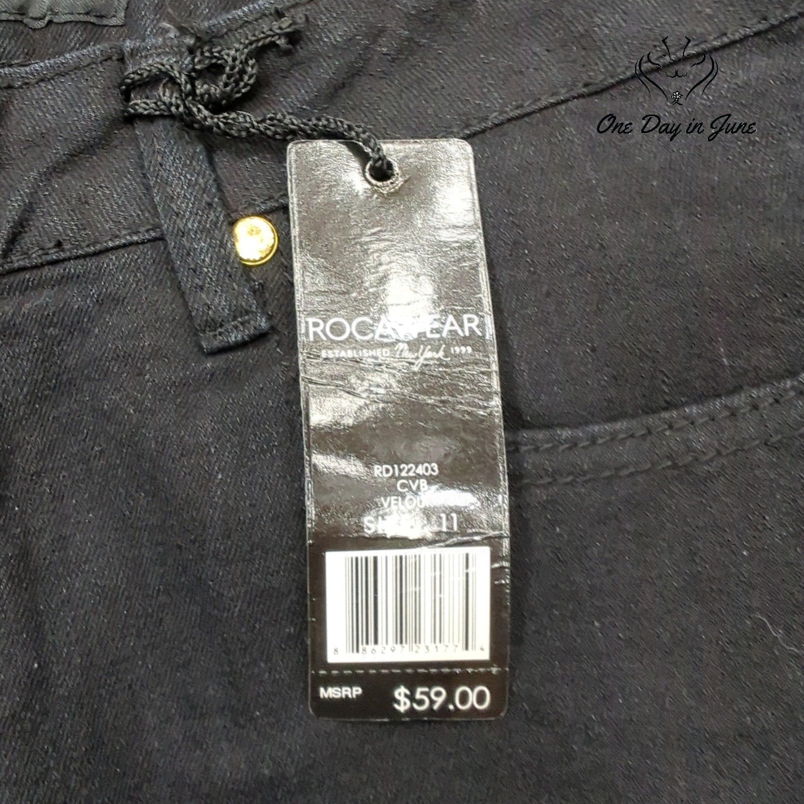 These elegant black straight-leg jeans from the esteemed house of Rocawear are crafted with the finest cotton and a touch of spandex for the most becoming fit a young lady could desire. The pristine condition of these never-worn garments ensures that the wearer shall make a most fashionable entrance into any drawing room or social gathering.