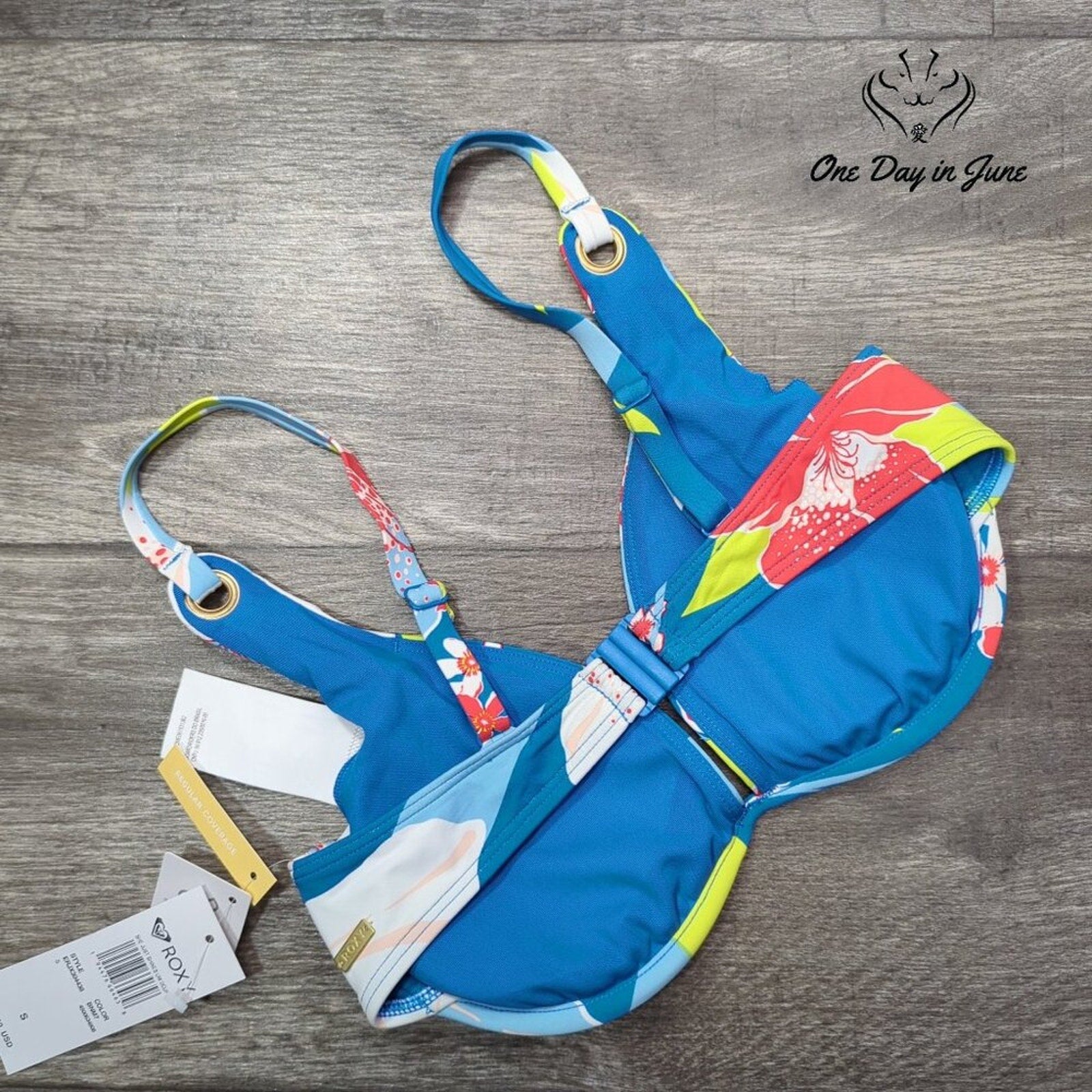 In seas of blue, it gleams so bright, a Roxy bikini top that's just right. Brand new with tags, it's the D cup dream, perfect for making a summer splash beam.