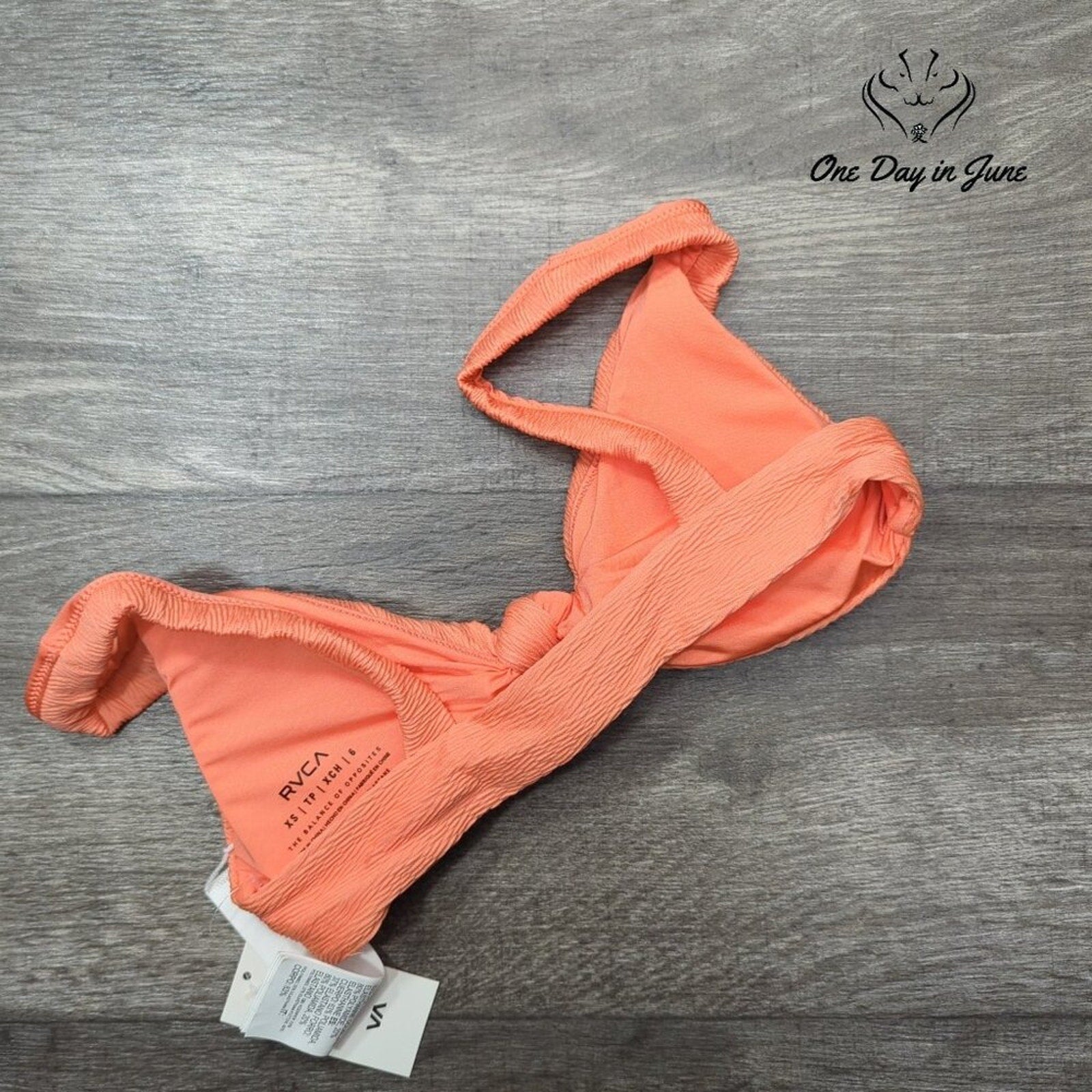 Ah, the RVCA Jolla Tie Front Bikini Top in a blazing sun-kissed orange—new with tags, untouched by the ravages of salt and soul-crushing reality. Crafted from a mystical blend of polyester and elastane, this gem screams of wild nights and days lost in the waves, designed for those who dare to ride the chaos.