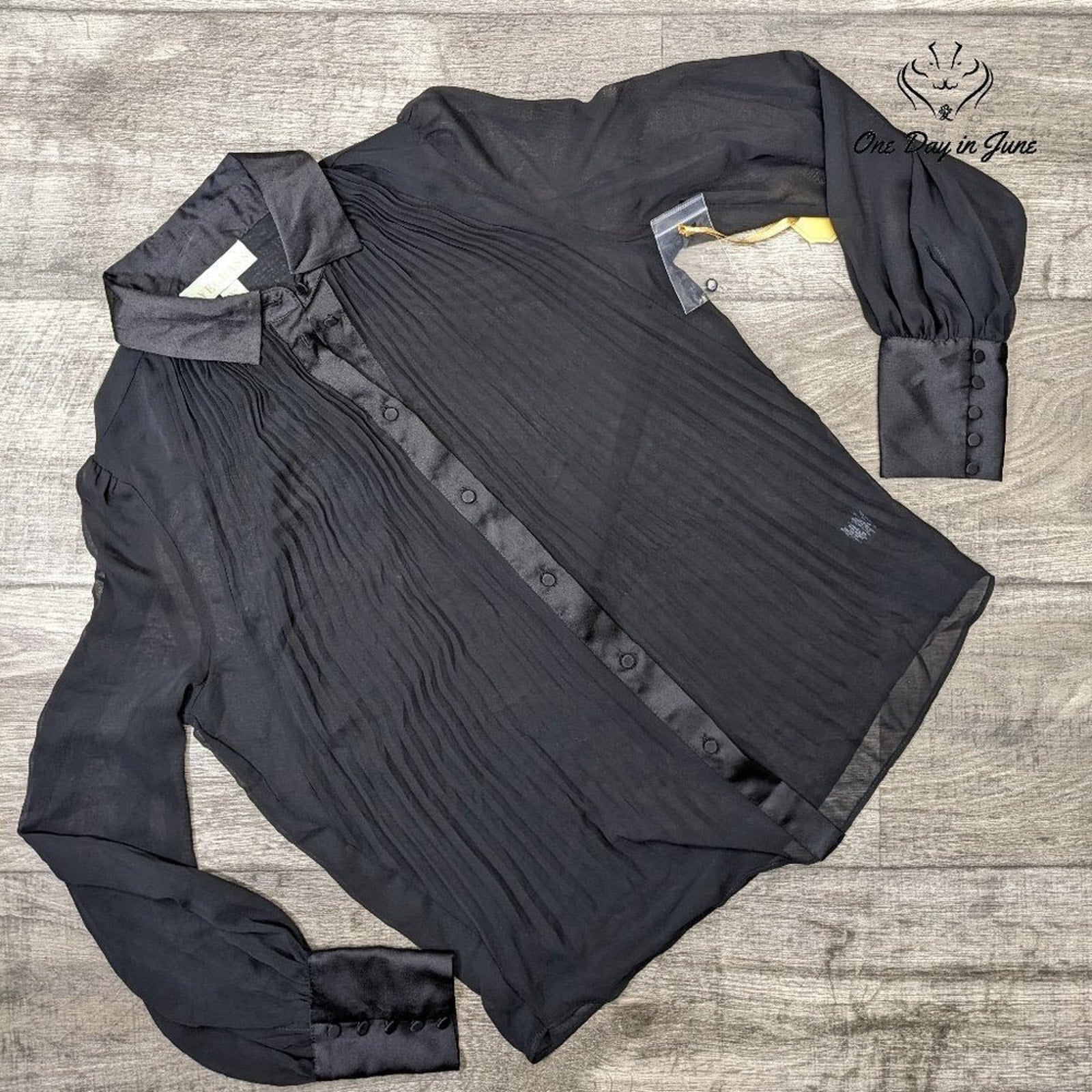 This Ryegrass blouse is an unspoiled thing, black as a moonless night. Crafted with sheer polyester, it drapes the body, shaping itself to your form like a second shadow. New, with tags untouched, it waits for a woman of taste and discernment.