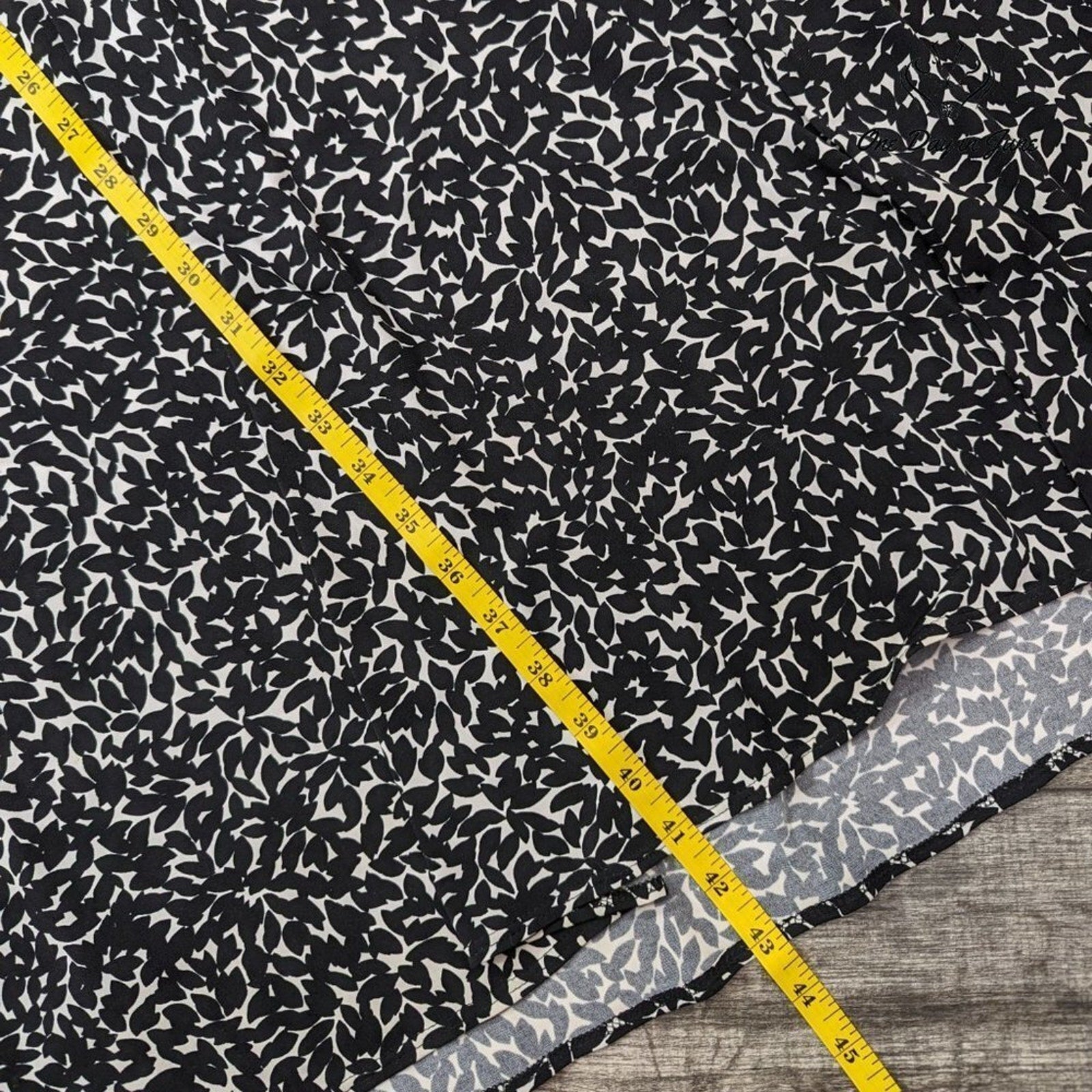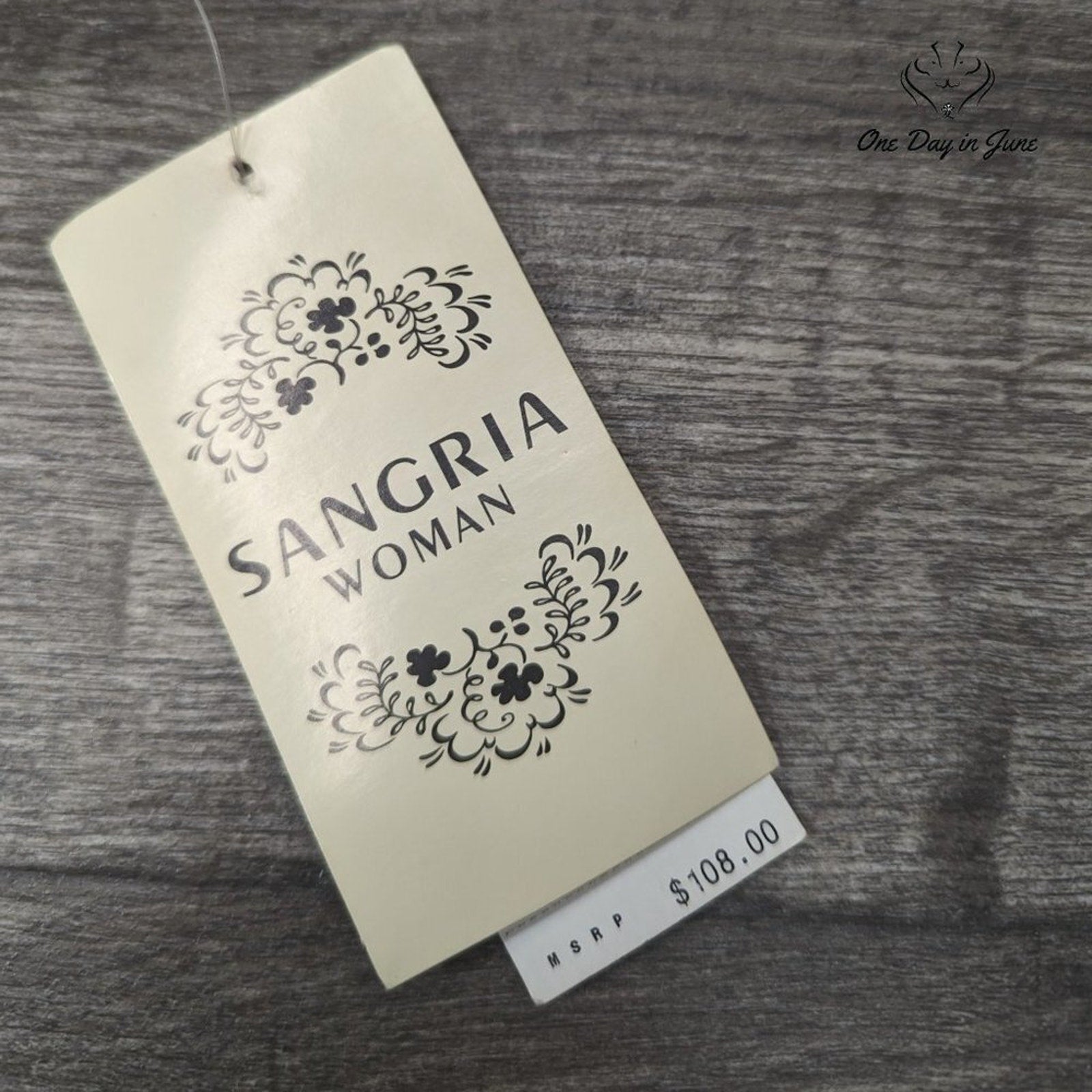 A Sangria dress, new and eager to be worn. It boasts a V-neck and 3/4 sleeves, colored in stark black and white. Made from a forgiving blend of polyester and spandex, it stands ready to adapt to the curves of its new owner.
