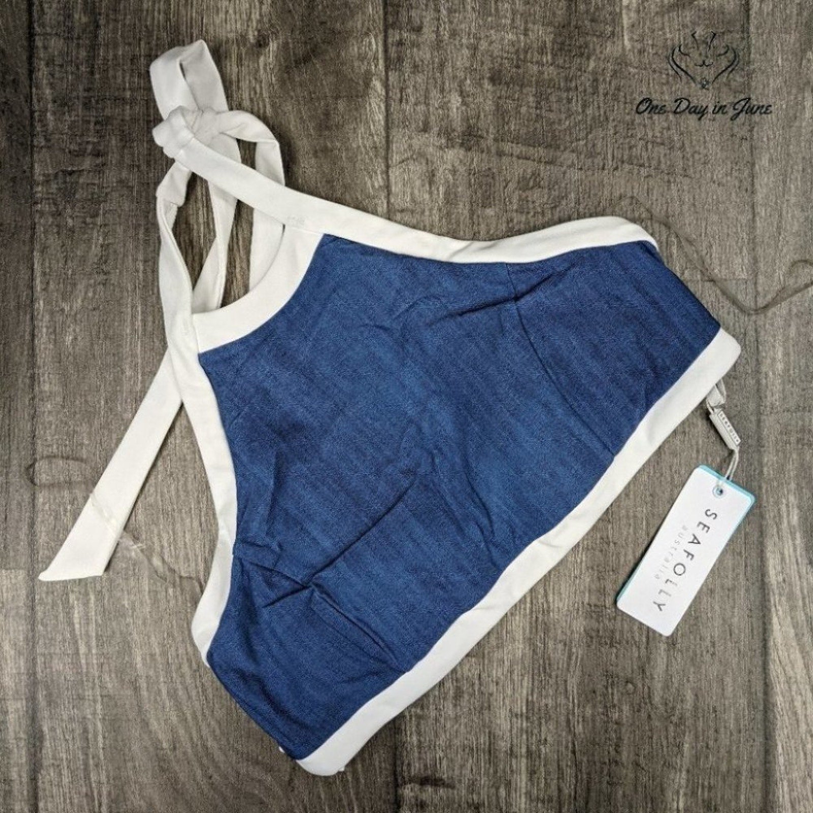The waves of azure fabric crash against the shores of your torso, a pulsating rhythm of style and aquatic allure. This SeaFolly halter bikini top isn't just clothing, it's a ticket to a wild ride through the sun-drenched beaches of your mind, where inhibitions melt away like ice cubes in a glass of warm whiskey. Strap yourself in for a journey to the outer limits of fashion and comfort, where the only rule is there are no rules.