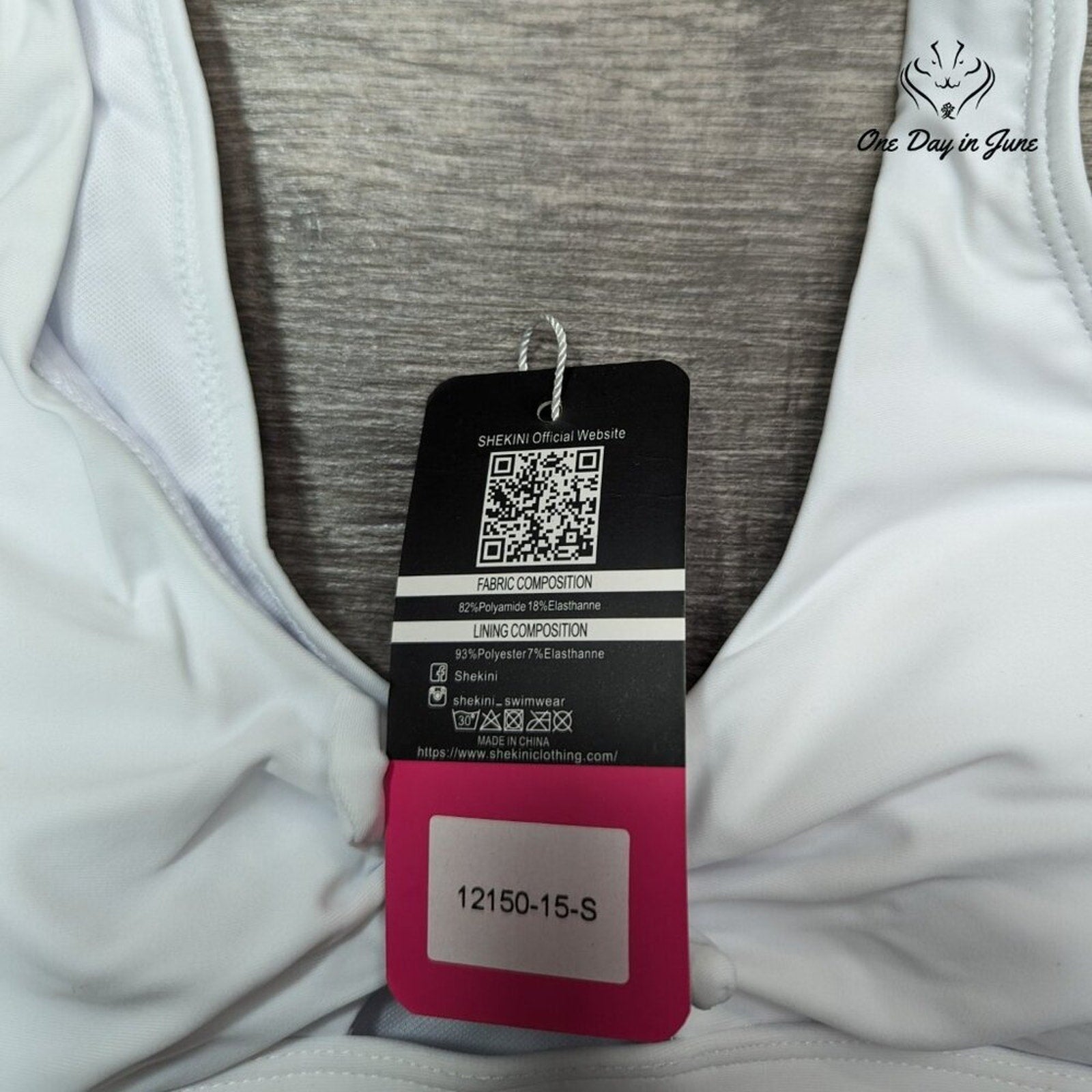 A most charming white bikini from Shekini, featuring an elegant keyhole detail that would delight any lady of discerning taste for seaside pursuits. The garment arrives in pristine condition with tags attached, fashioned from a pleasing blend of materials that promise both comfort and proper form. One could scarcely imagine a more fetching choice for bathing costume this season.
