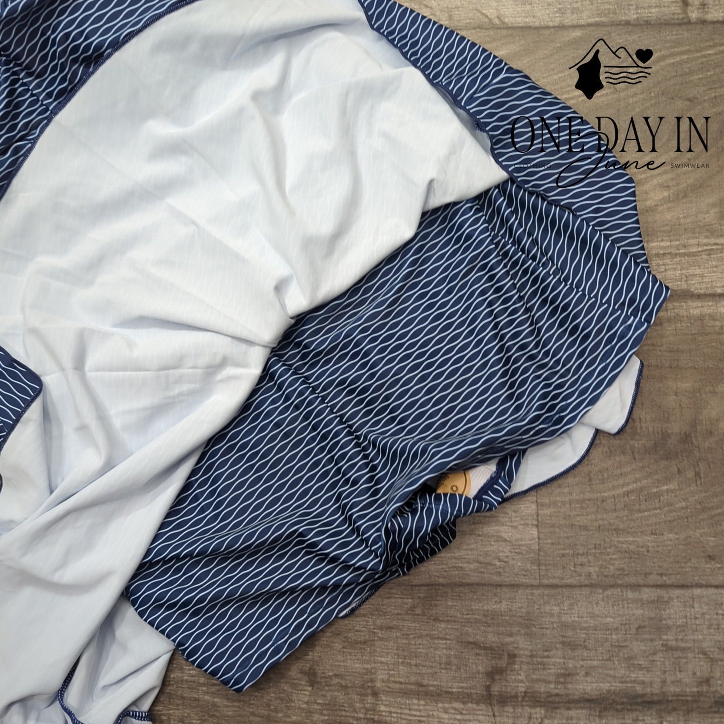 This splendid blue swimdress will make you feel like a queen, with boyshorts beneath for comfort so keen! One magnificent piece that's stretchy and new, perfect for swimming and lounging too!