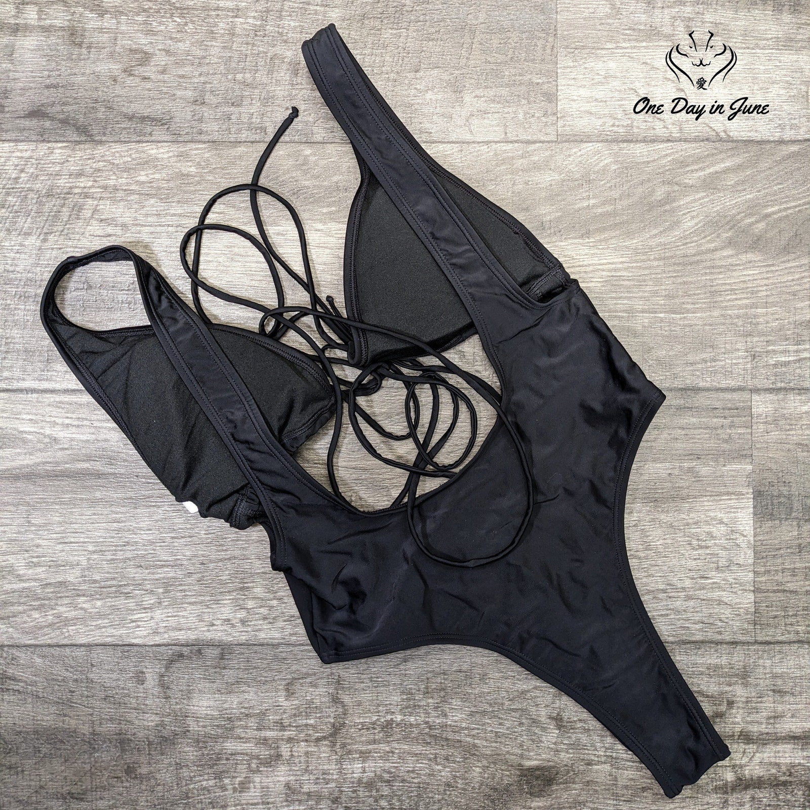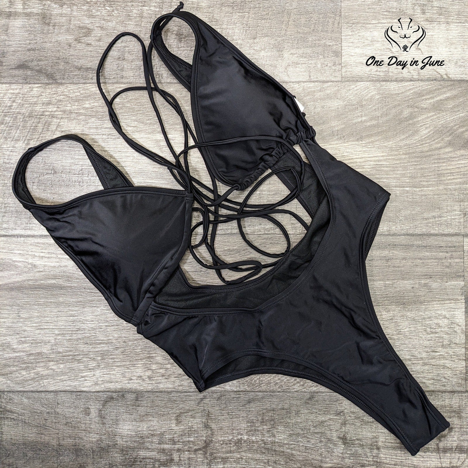 Strange and sultry creature of the deep, this black strappy number writhes like a midnight mamba through the chlorinated chaos of any poolside gathering. The strategic cutouts create a savage geometry across the torso that would make Salvador Dali weep with joy, while the nylon-spandex fusion clings to the body like a second skin crafted by some demented fashion deity who clearly understands the raw power of aquatic seduction.