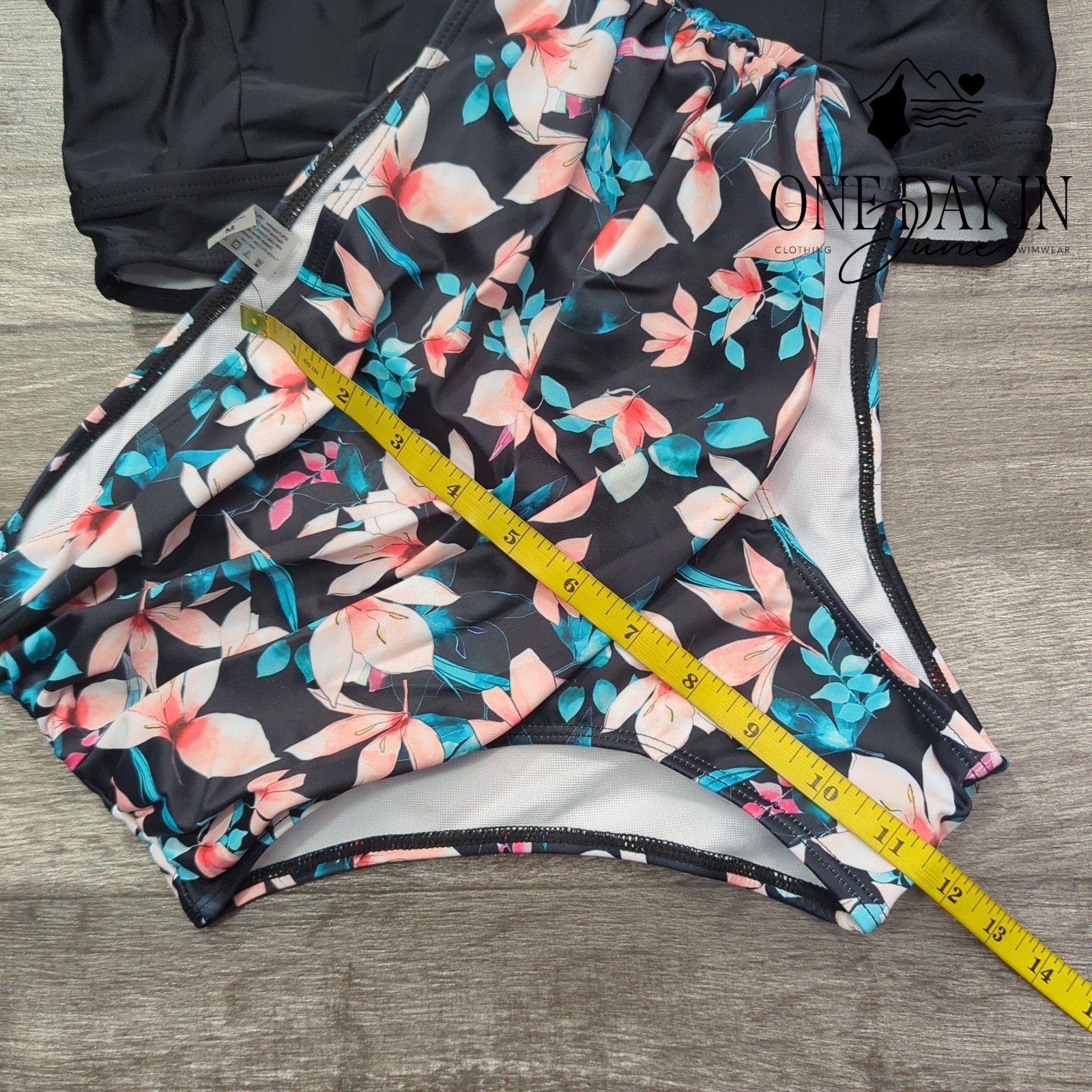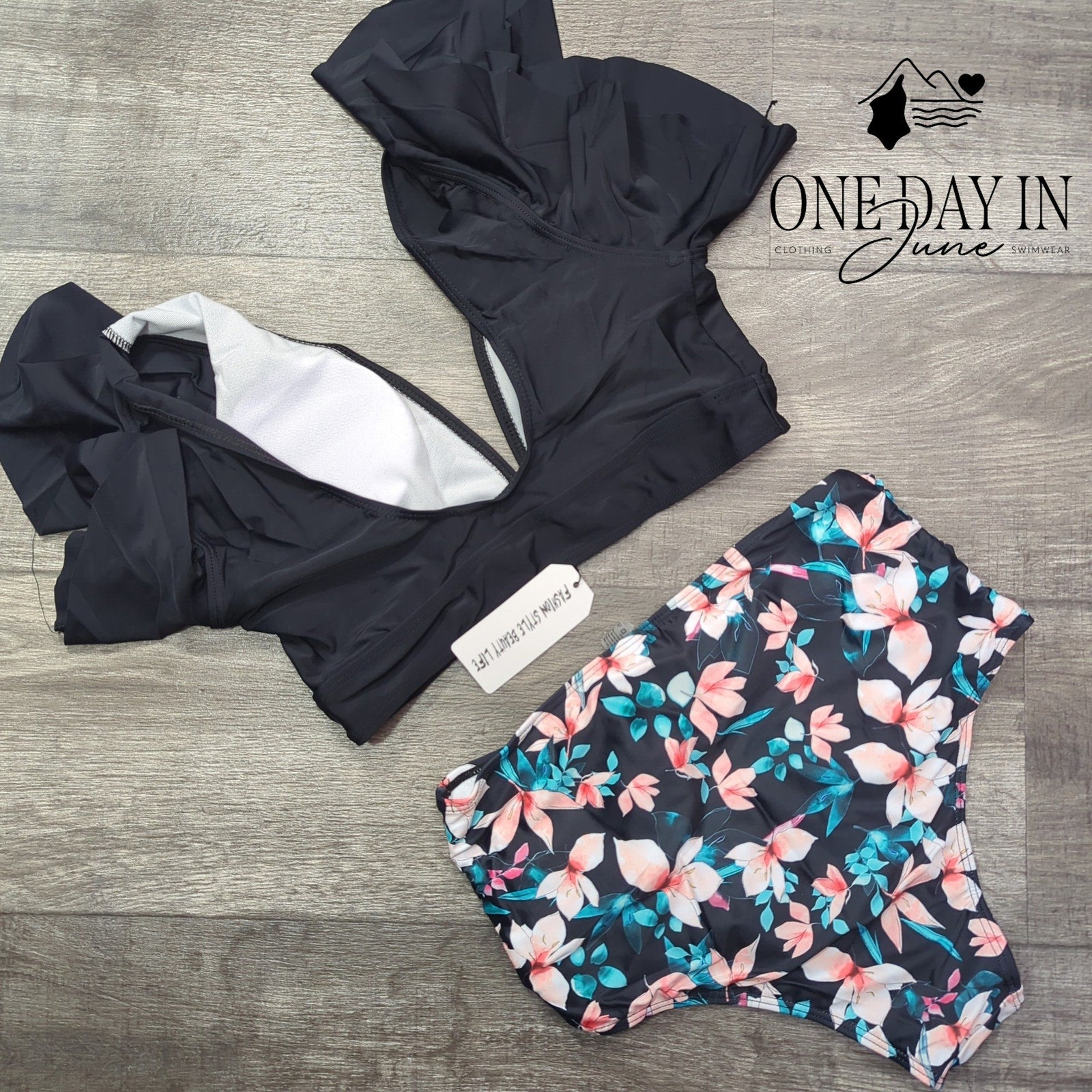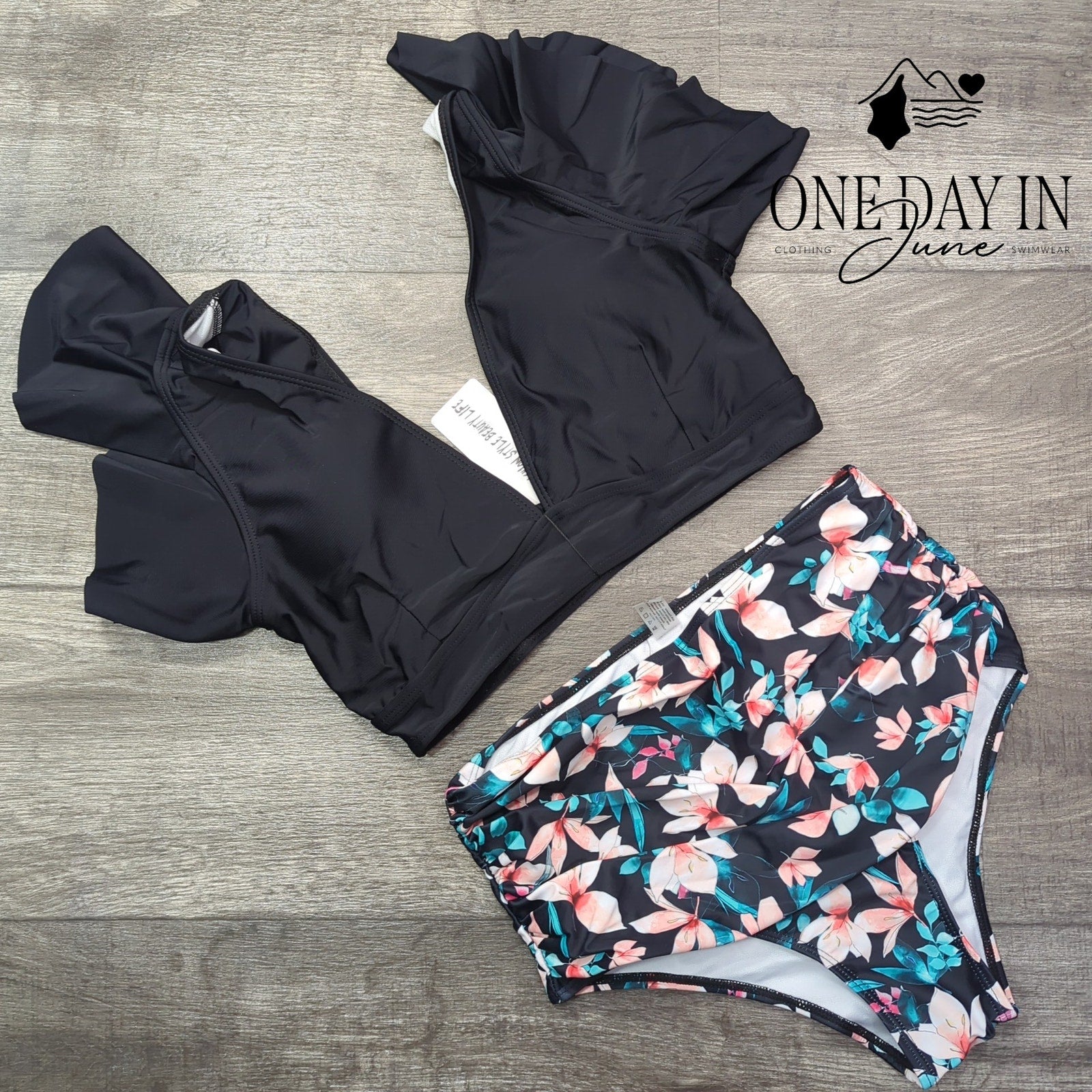 This splendid swimsuit with ruffles so neat will make your beach day oh-so-sweet! With high waist style and shoulders that flutter, this black beauty will make hearts aflutter!
