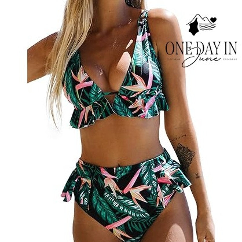 This triangle bikini with ruffles so neat will make your beach day oh-so-sweet! In black and green, it's quite the scene - a swimsuit fit for a summer queen!