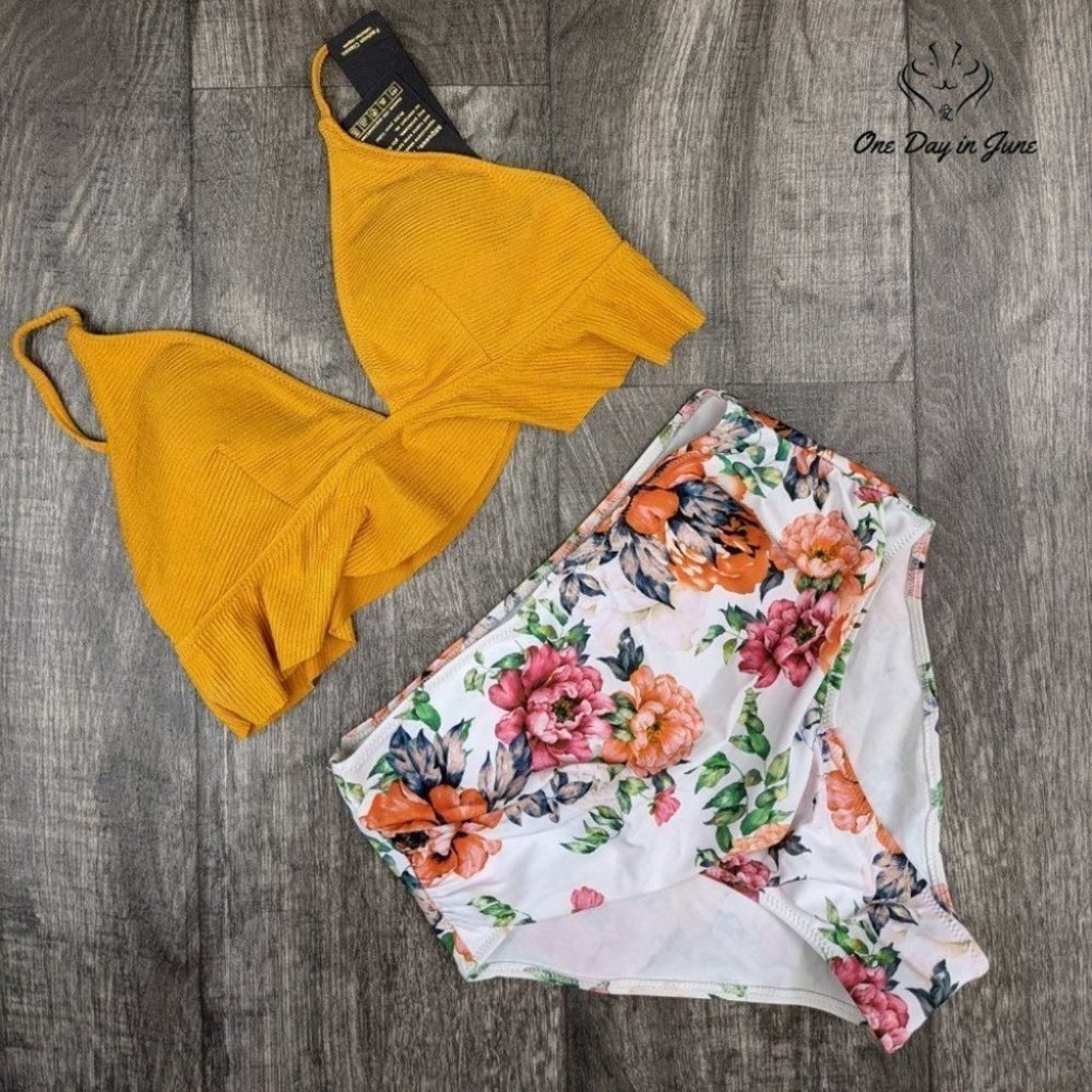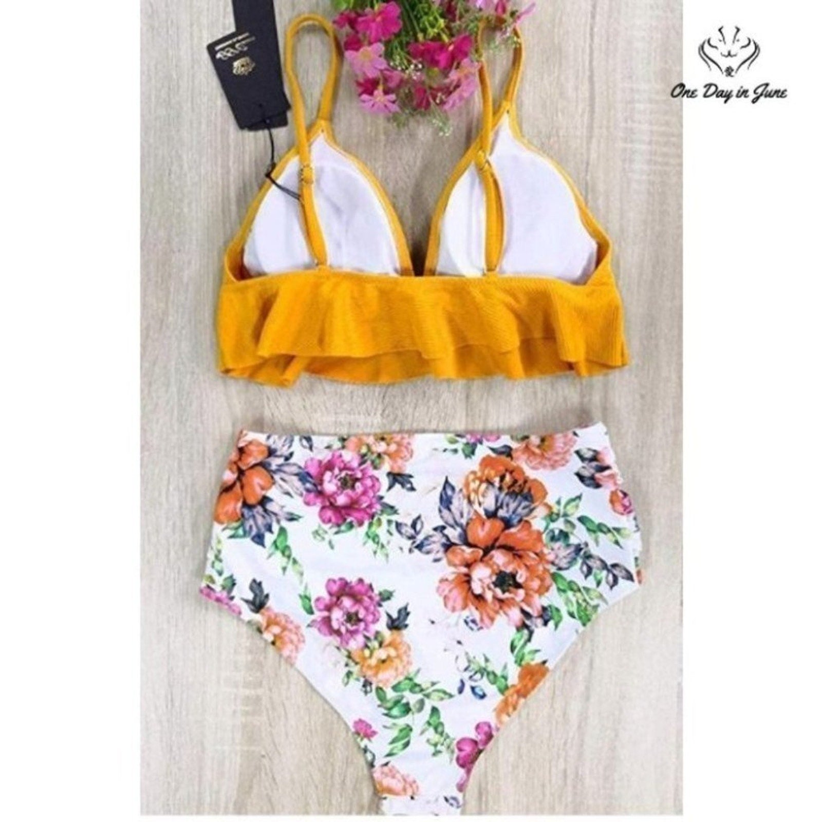 Summer enchants in this delightfully feminine ruffle bikini, where sunny yellow meets pristine white in a dance of colors reminiscent of Mediterranean afternoons. High-waisted elegance combines with playful ruffles to create a silhouette that captures both grace and whimsy, perfect for those endless days by sea or pool.