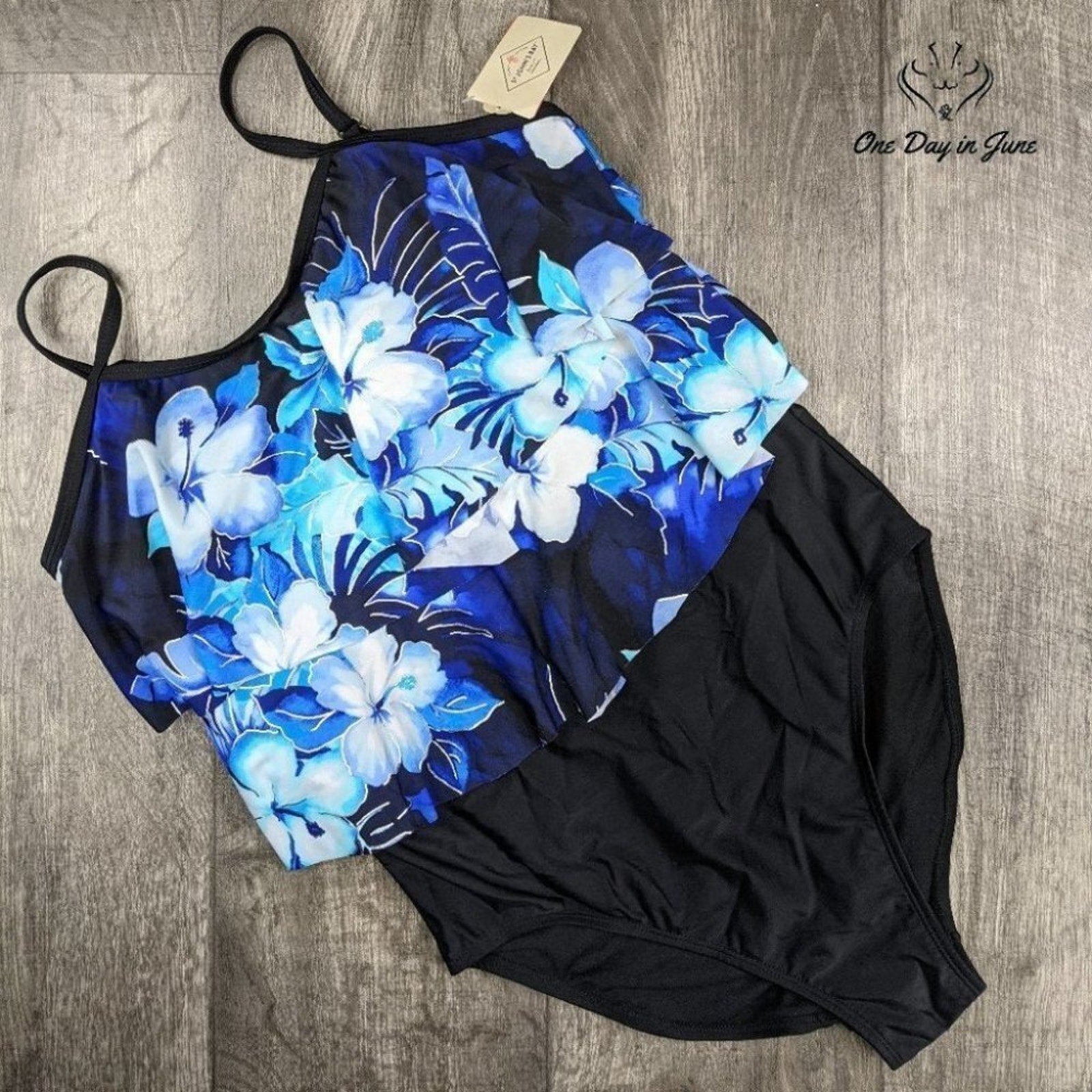 A graceful floral pattern dances across this sleek, oceanic blue and black swimsuit from St. John's Bay. Fresh from its debut with original tags attached, this flattering one-piece melds modern sophistication with timeless elegance, crafted from a luxuriant blend of stretchy fabric that promises both comfort and allure.