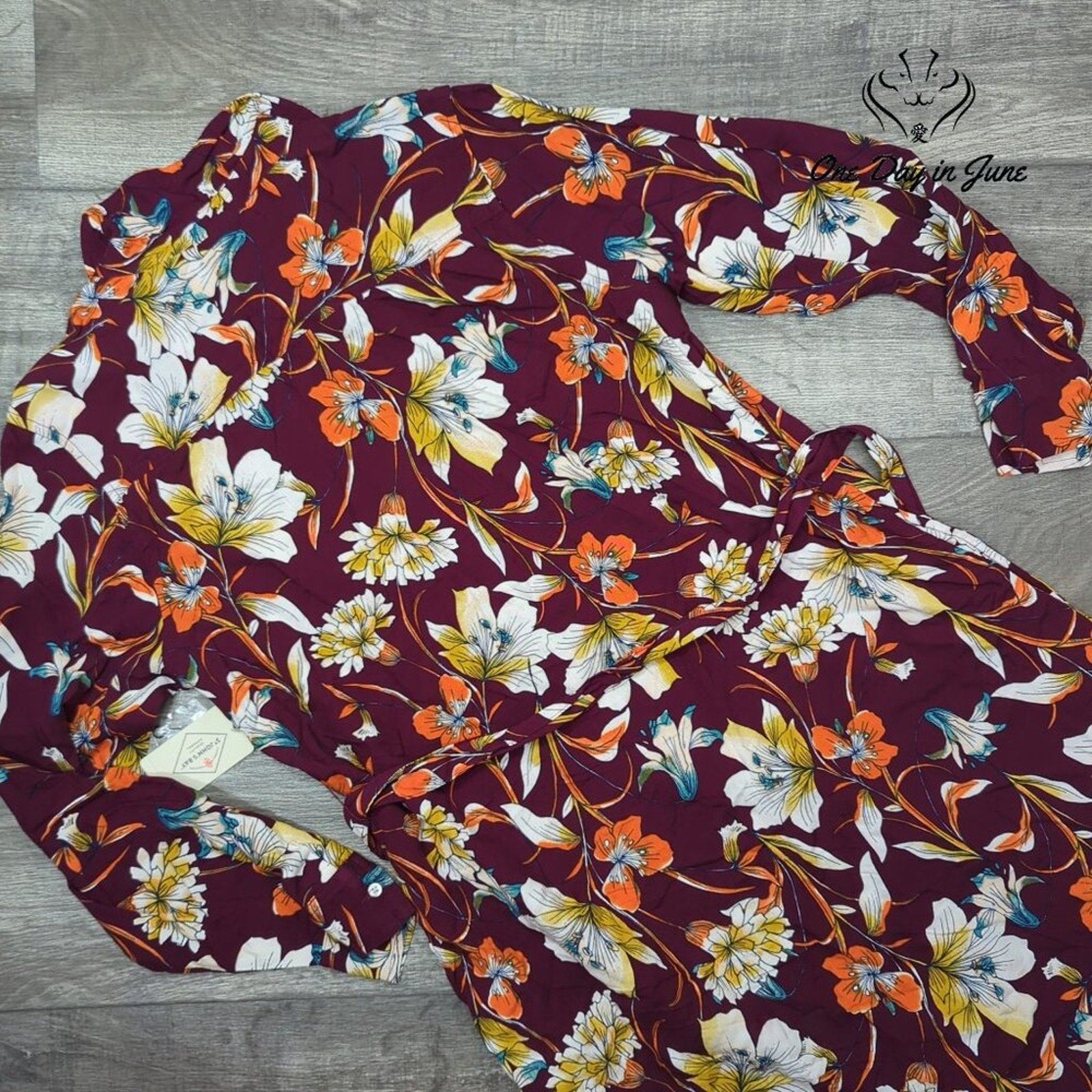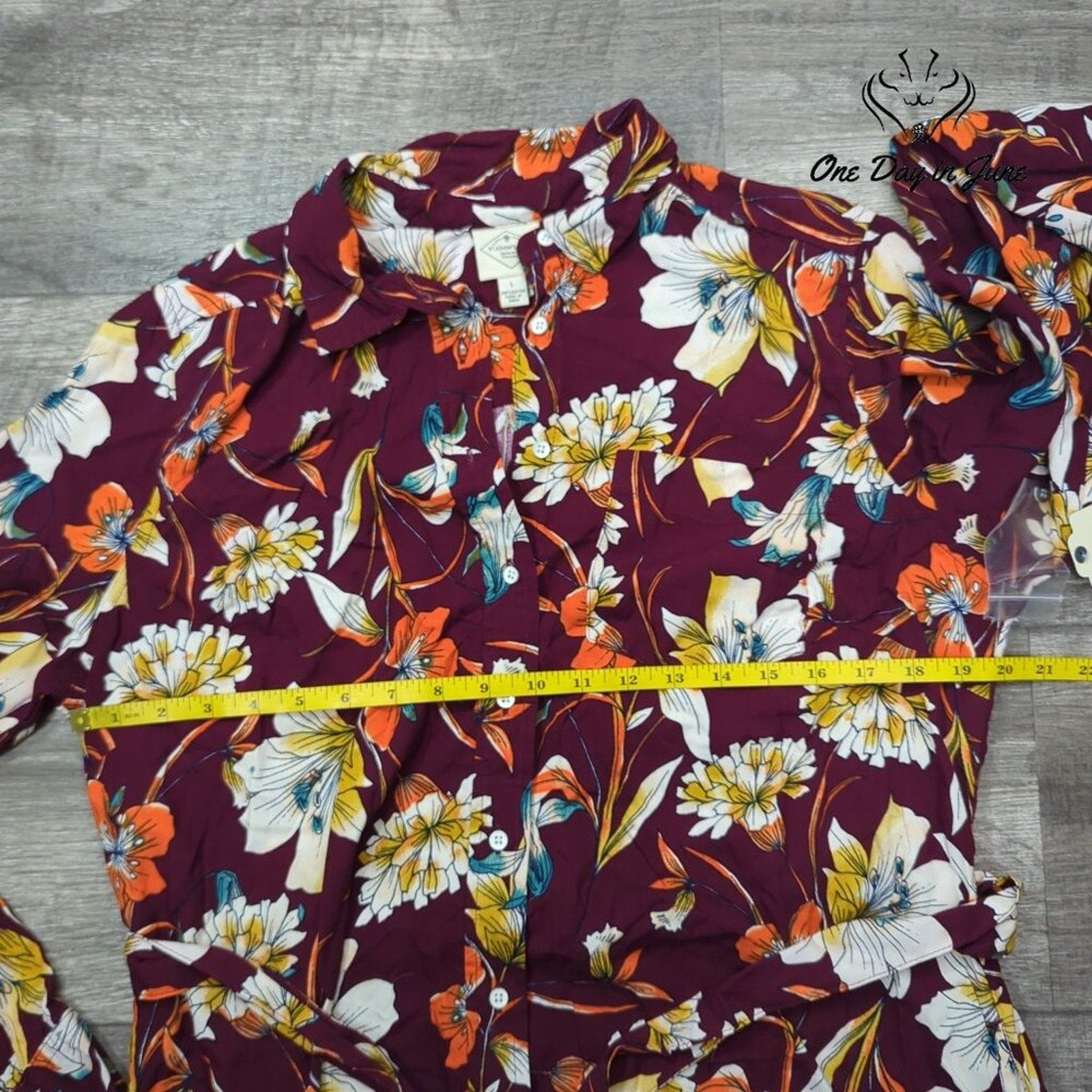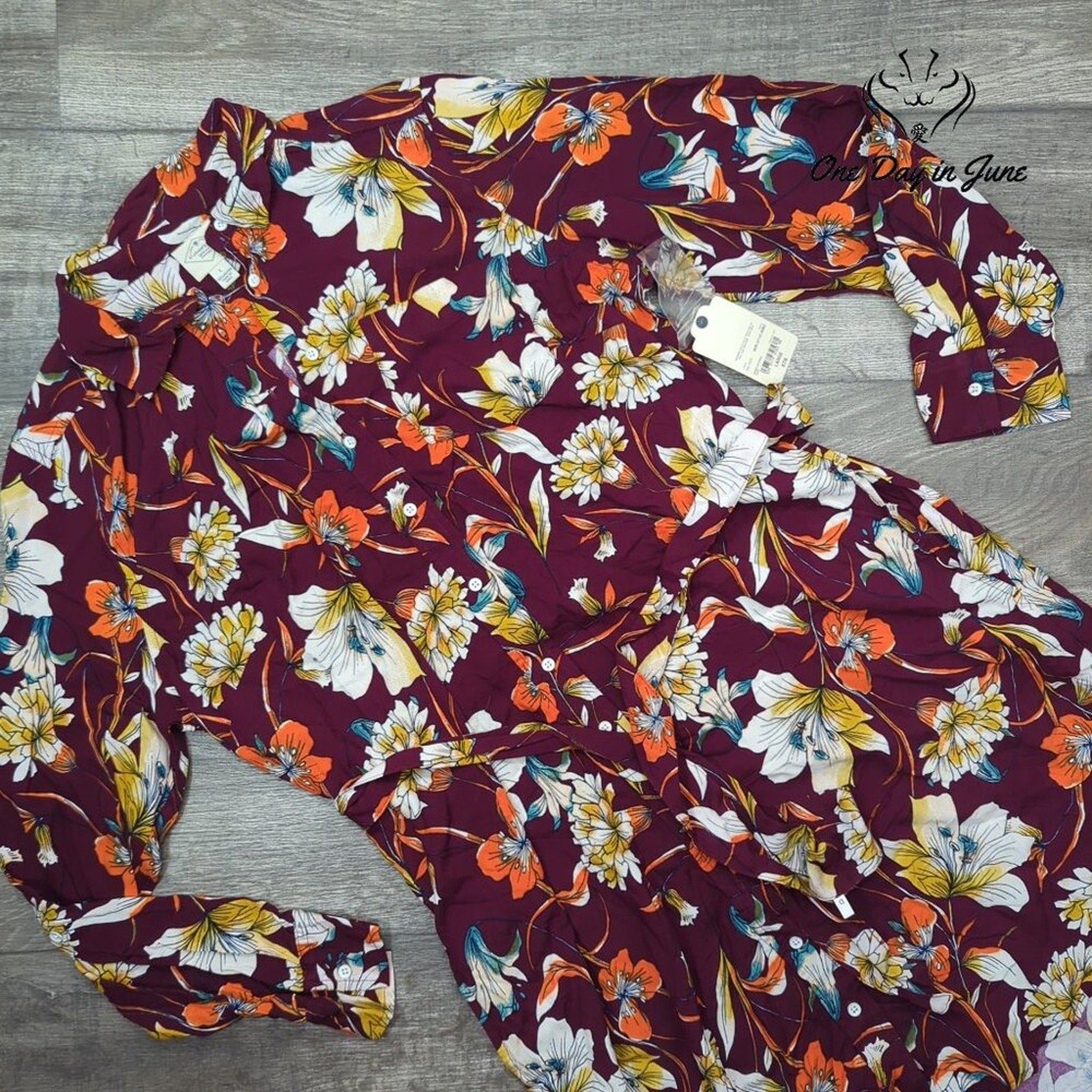 A fine dress from St. John's Bay, adorned in vibrant colors. Crafted from soft rayon, it stands new with tags. Long sleeves and a button front meet with a tie at the waist to complete your look with grace and ease.