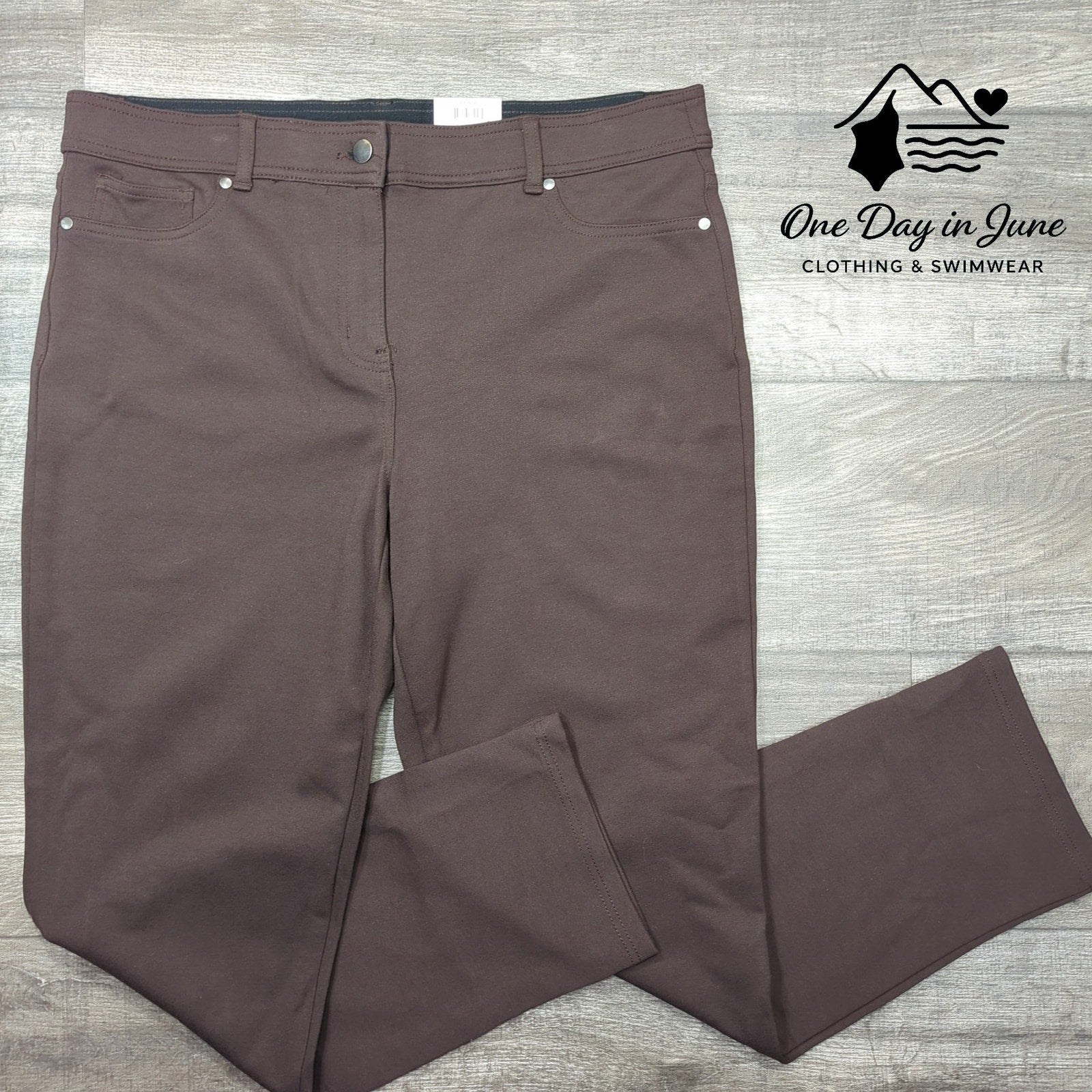 Luxurious and sleek, these brown ponte leggings from Style & Co offer unparalleled comfort with their mid-rise design and gentle waistband. Crafted from a supple blend of rayon, nylon, and spandex, they drape gracefully against the skin like the velvet shadows of a Manhattan evening.