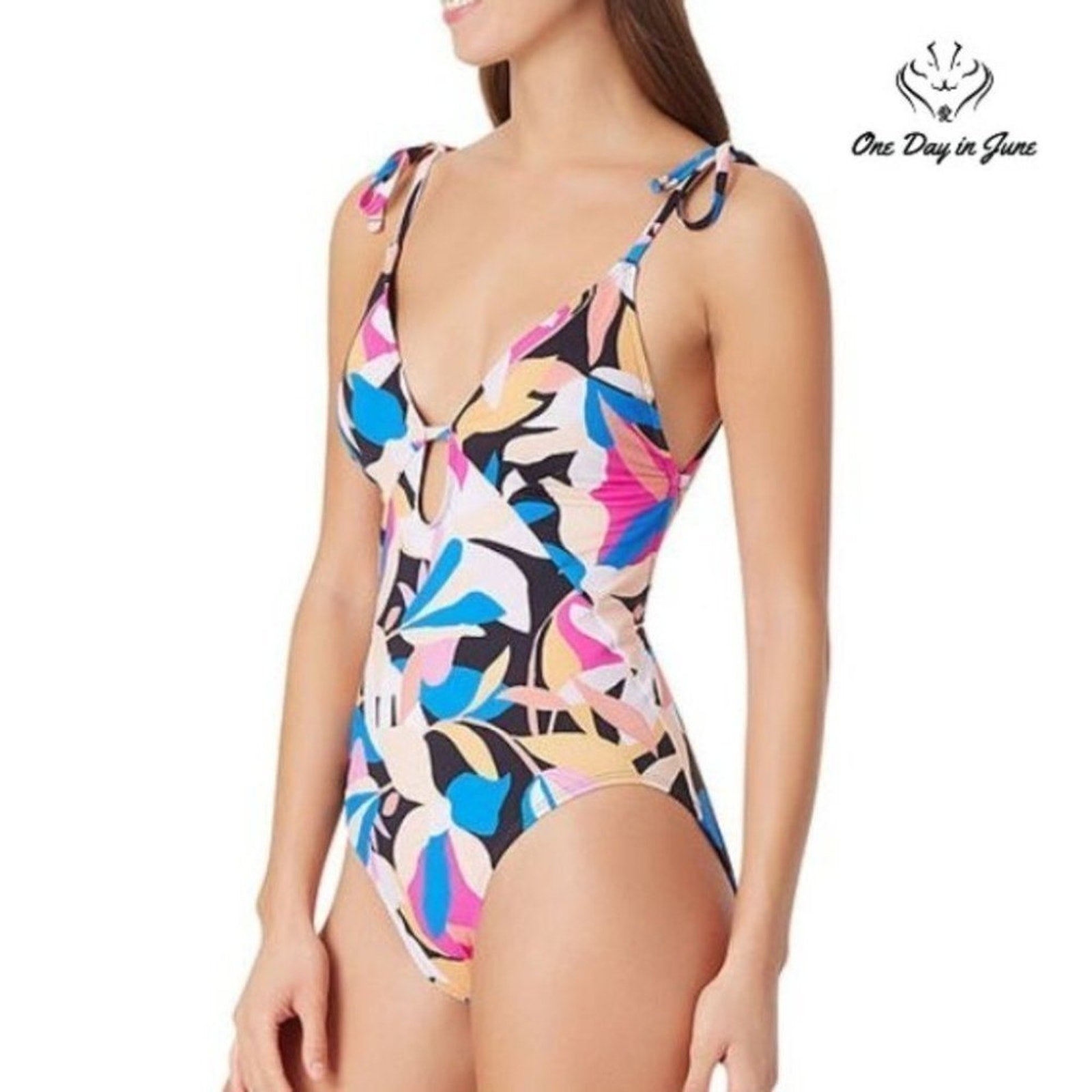 Dive into the kaleidoscopic frenzy of this Sugar Beach one-piece, a psychedelic swirl of orange and black that'll make your retinas dance like a Vegas showgirl on payday. This floral fever dream clings to your curves like a second skin, a polyester-spandex love child born from the union of comfort and style in some backroom beach cabana where the rules of fashion are rewritten by madmen and visionaries.