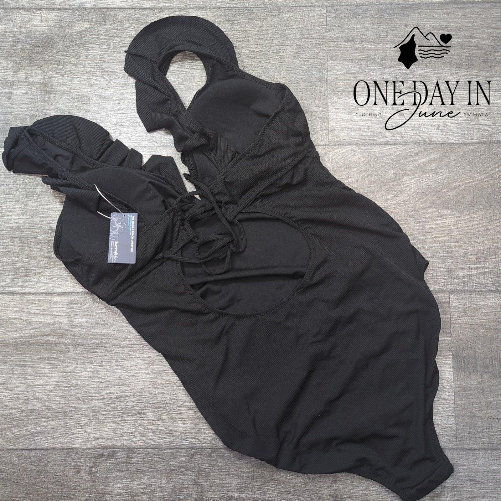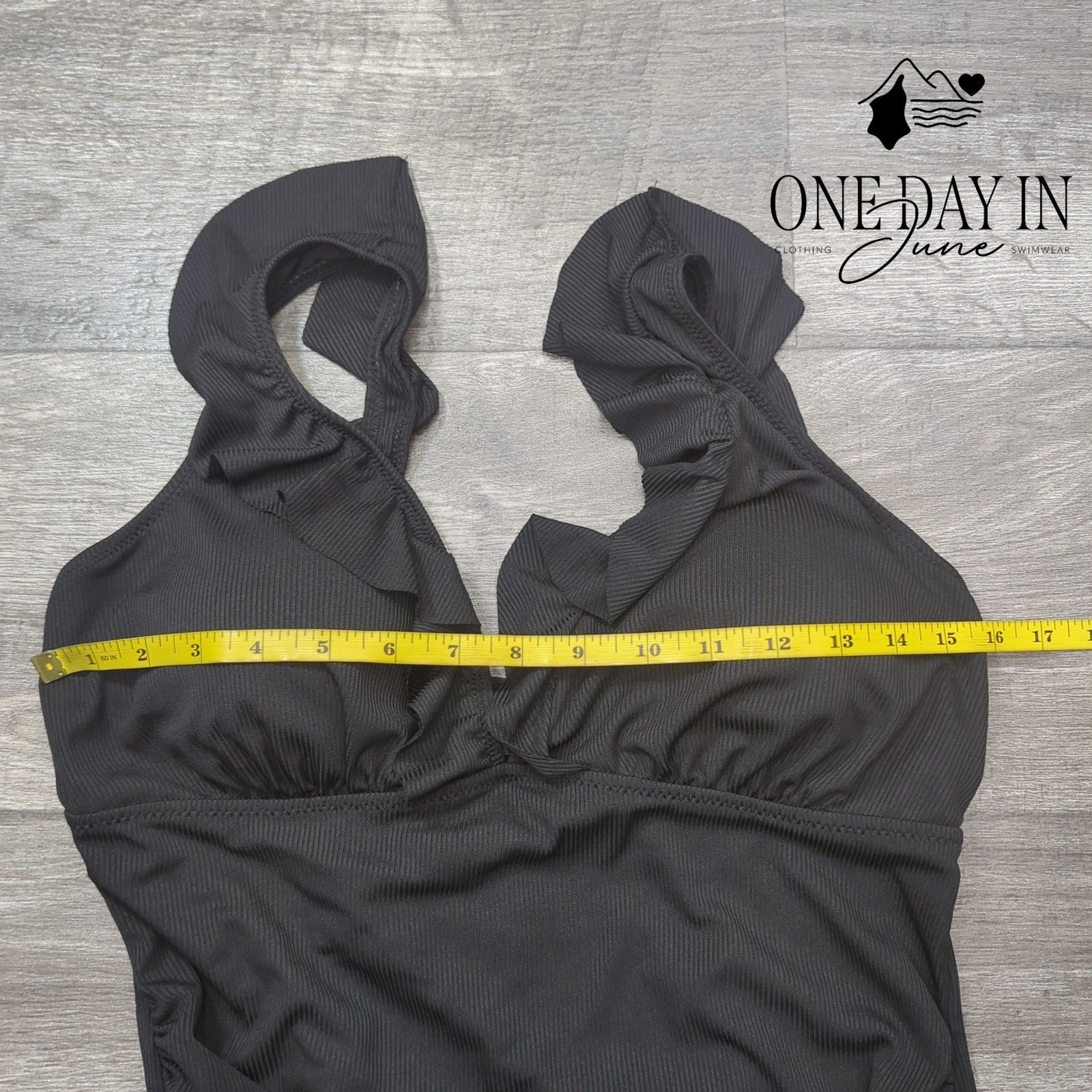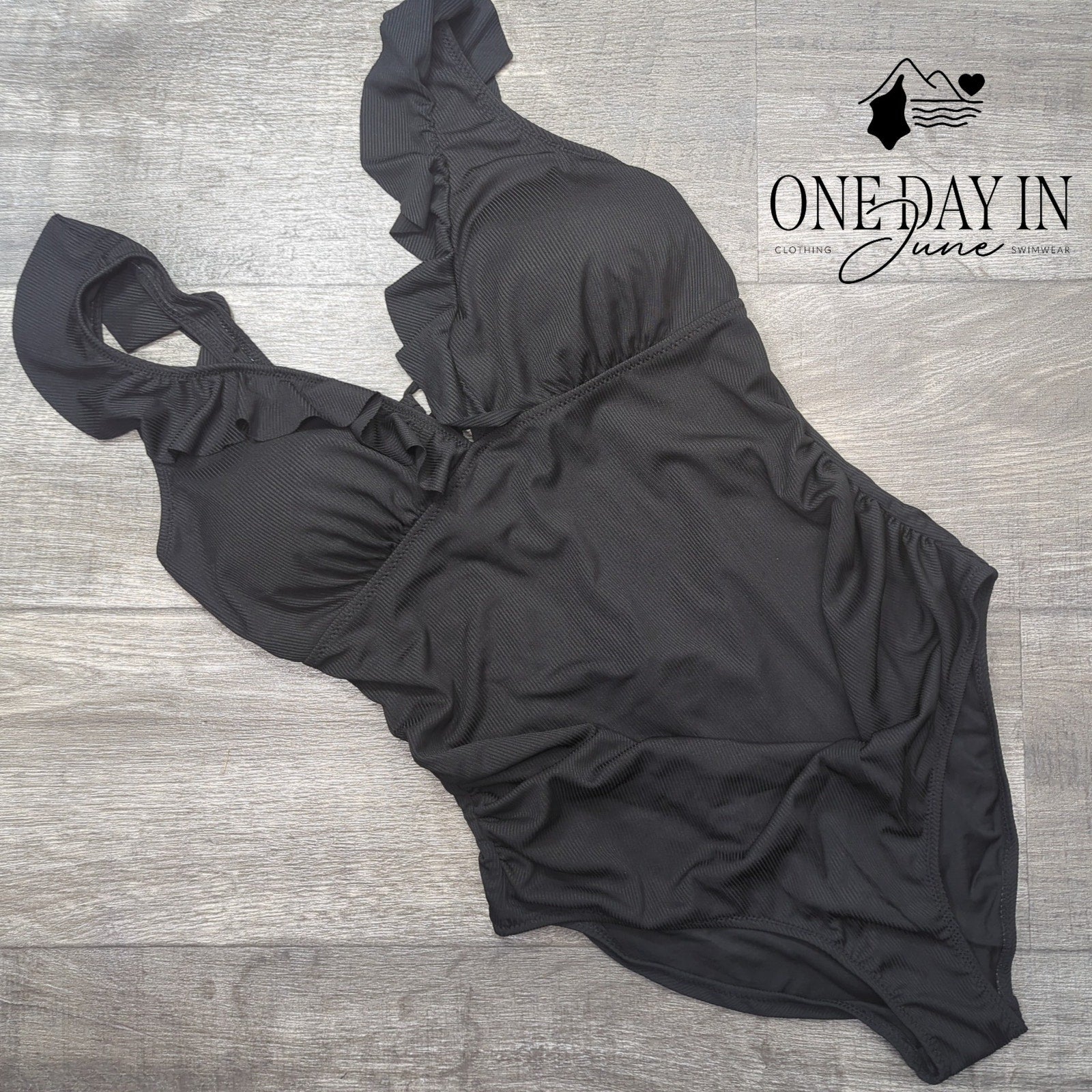 Behold this most charming black one-piece, designed with the greatest consideration for the expecting lady's comfort and modesty. The delightful ruffle shoulders lend an air of gentle femininity, while the ribbed construction promises both elegance and ease during those warm summer months. A most sensible addition to any discerning woman's wardrobe, crafted from the finest polyester and spandex blend.