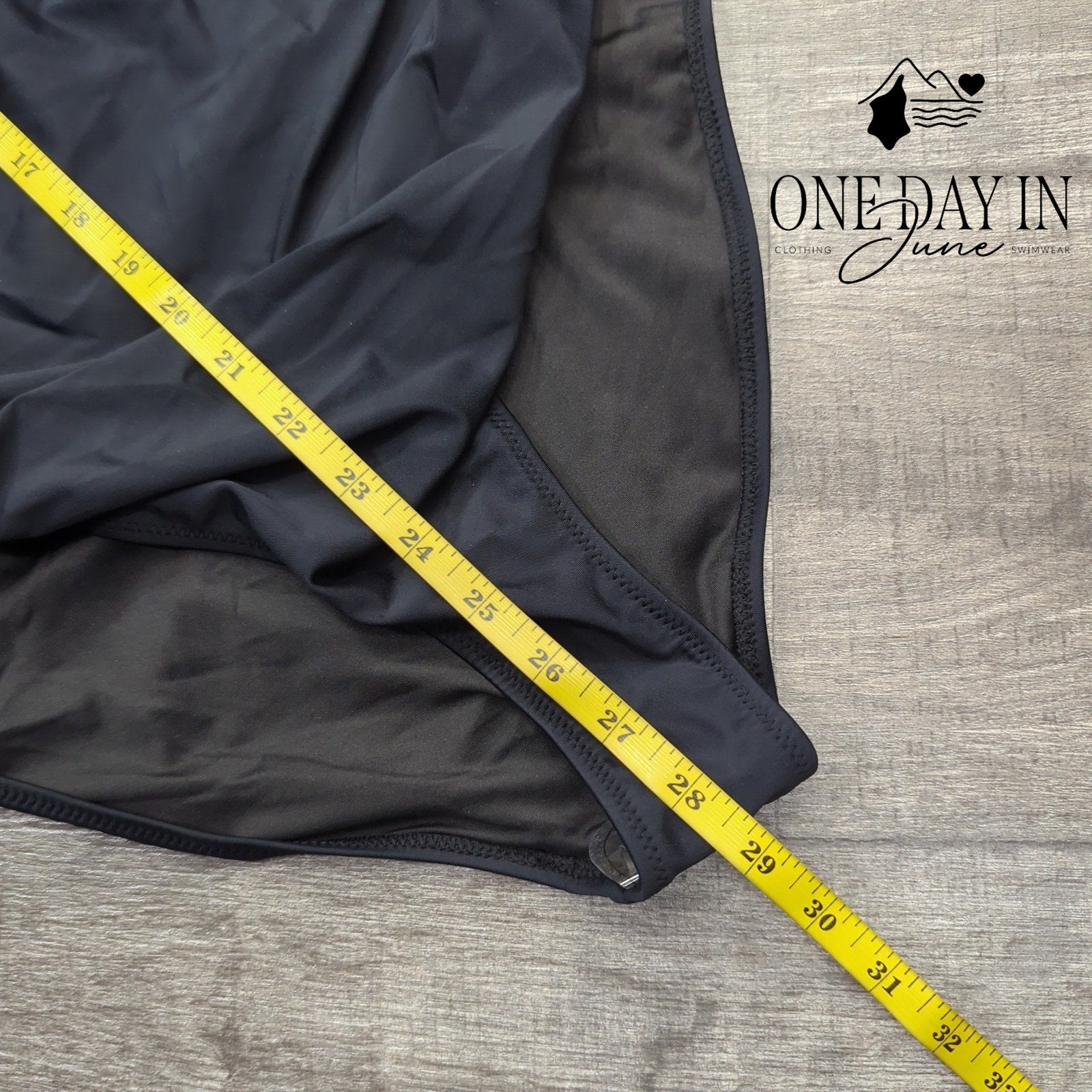 This halter cross-front beauty is sleek and black, with a fit that's snappy and never lacks! Made with stretchy materials that move and bend, it's a swimsuit sensation from beginning to end!