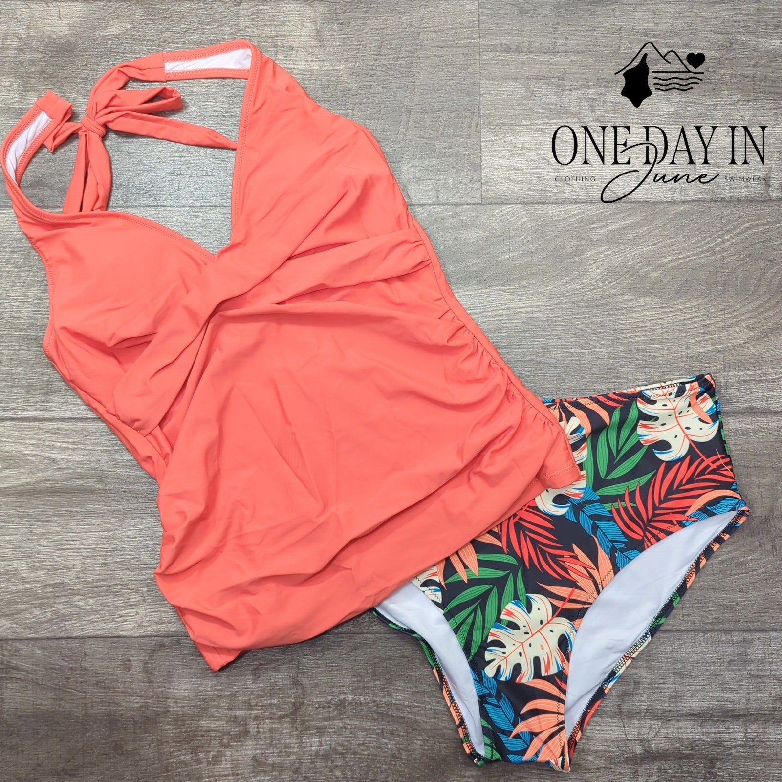 This halter cross-front tankini is orange and bright, perfect for swimming and looking just right! Made with stretchy materials that move and flow, this swimsuit will make your confidence glow!