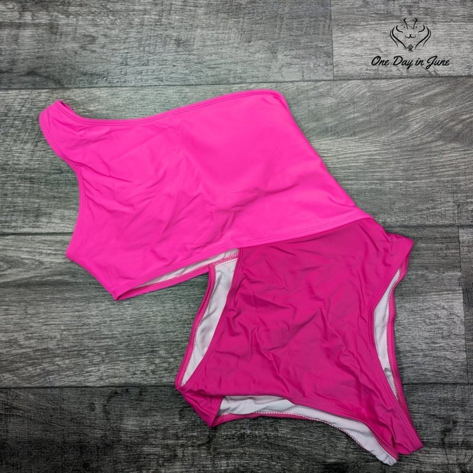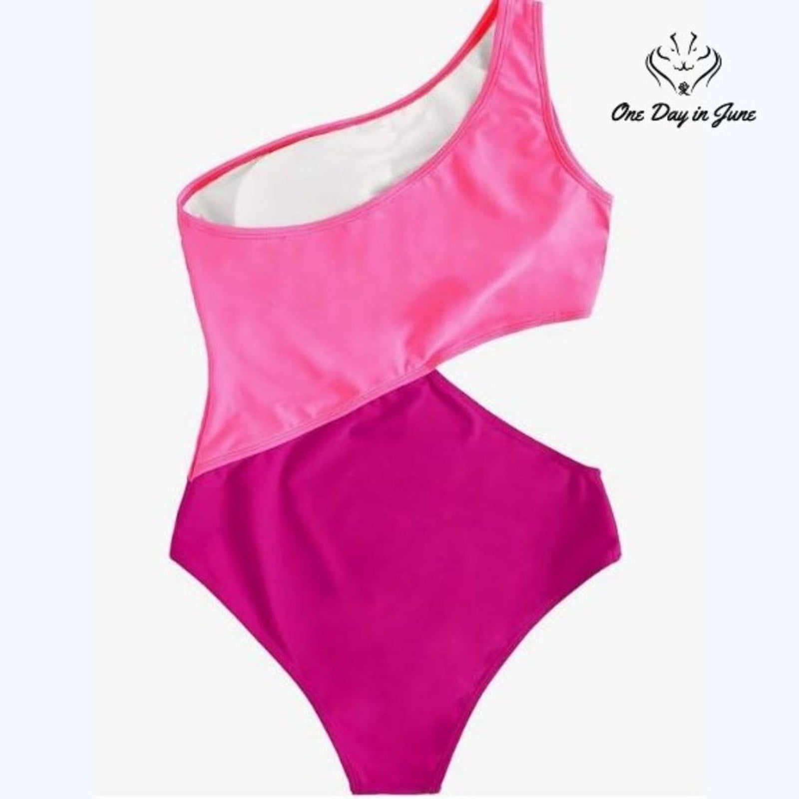 A most delightful one shoulder bathing costume in a fetching pink hue, adorned with charming color blocking that shall surely turn heads at any seaside gathering. Fashioned from a superior blend of materials that promises both comfort and a flattering silhouette. This fetching piece arrives in pristine condition, never yet worn, and ready to accompany its new mistress on her aquatic adventures.