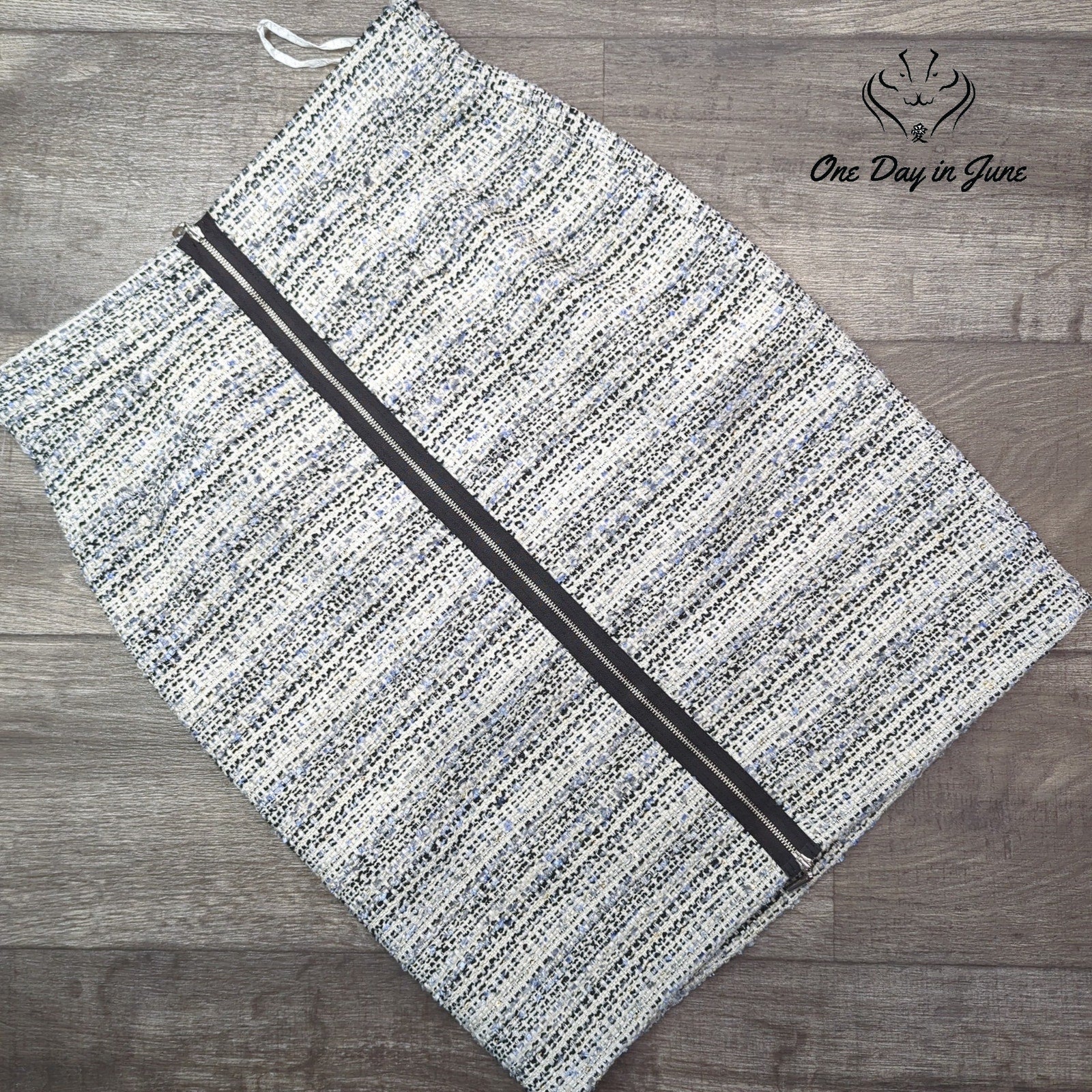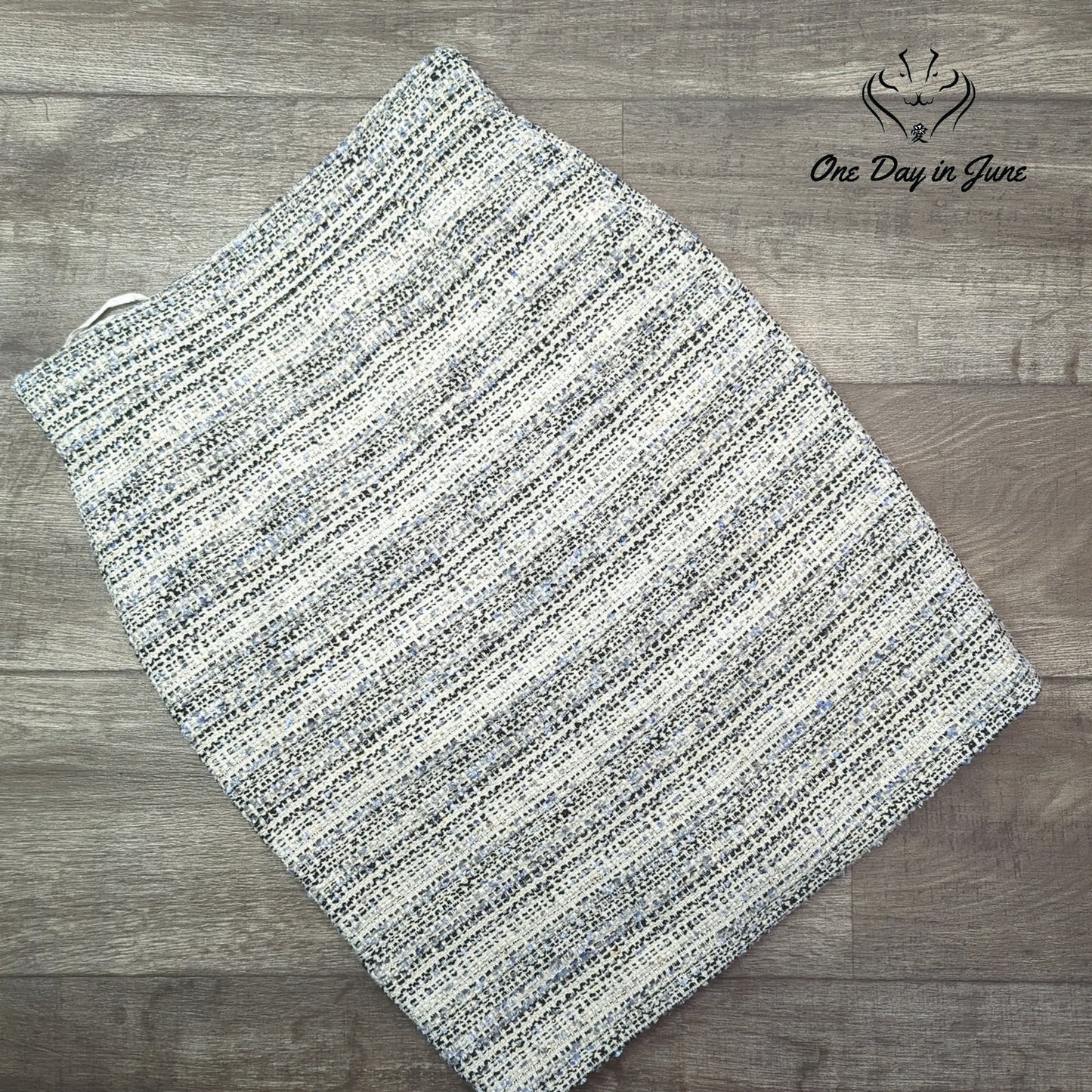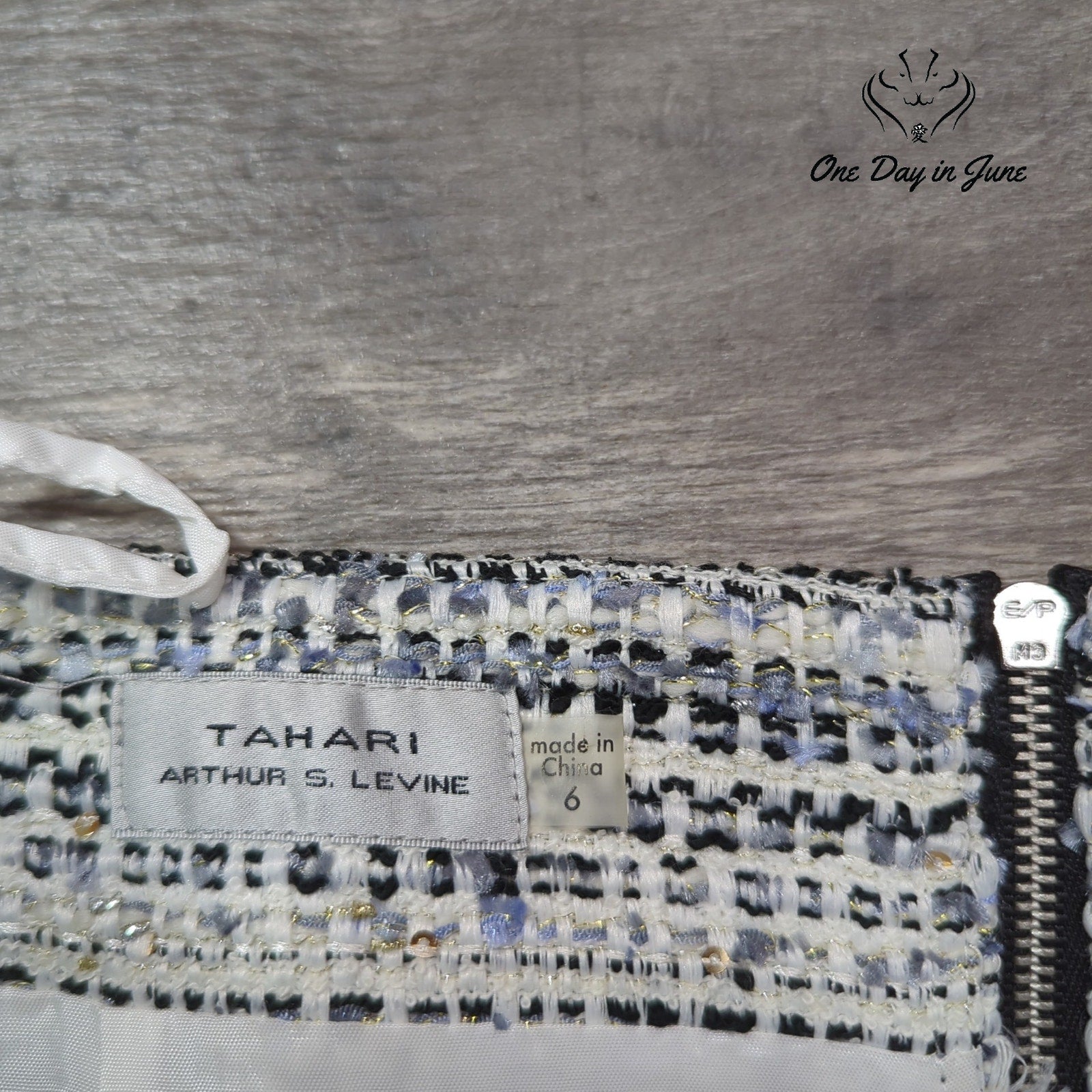 The savage geometry of this pristine Tahari masterpiece slashes through reality with its stark white-on-black pattern, a brutal reminder that fashion need not conform to the soft edges of conformity. Like a metallic dream woven from synthetic threads and nature's wool, this pencil skirt screams professional domination while whispering sweet nothings about cocktail parties and corner offices - lined in acetate because that's just how the madness rolls in this corporate circus.