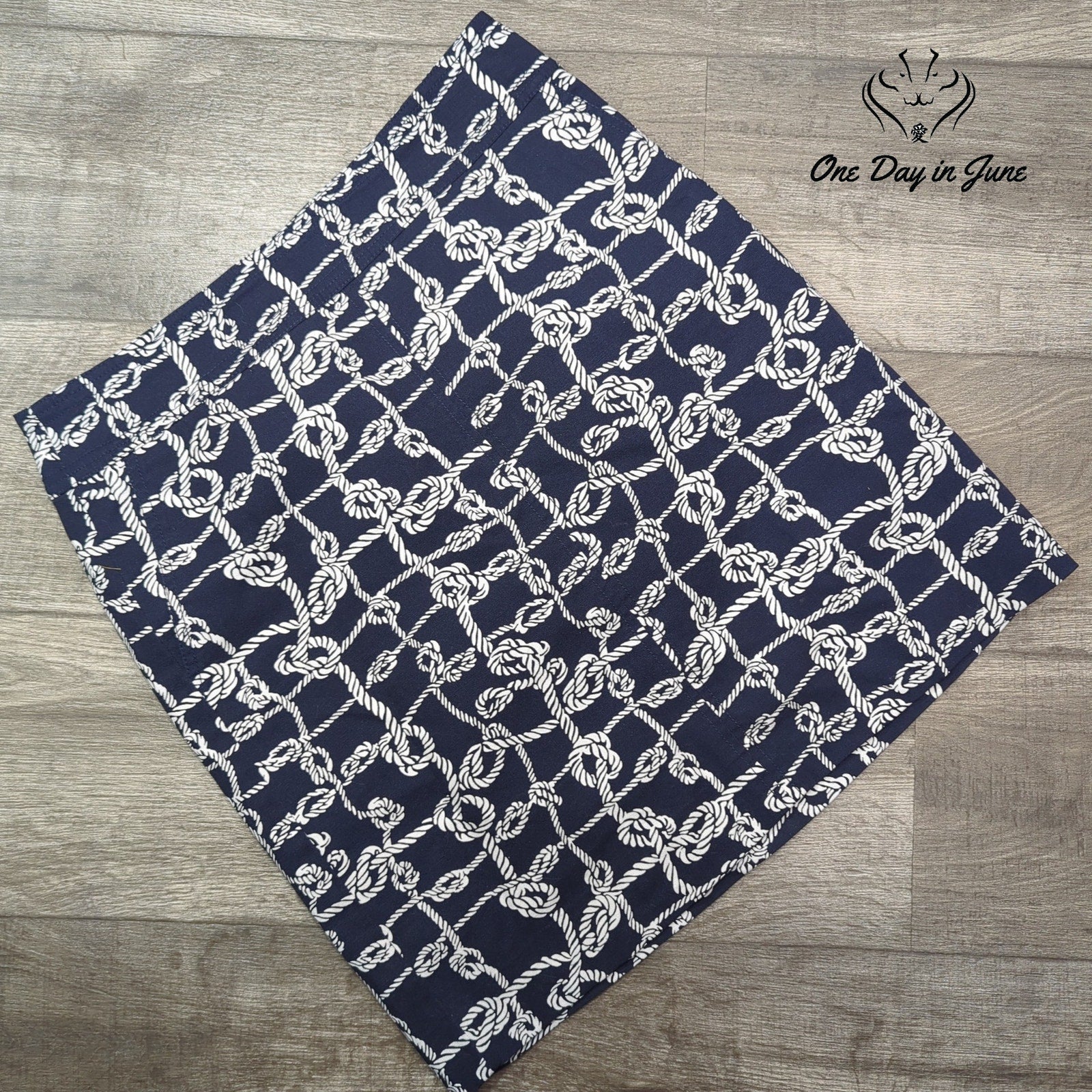 Drifting like a graceful summer sail, this pristine nautical skirt from Talbots captures the essence of seaside sophistication. Cotton-rich fabric with a touch of stretch ensures elegance in motion, while the classic blue hue and polished polyester lining evoke memories of moonlit nights along the coast.