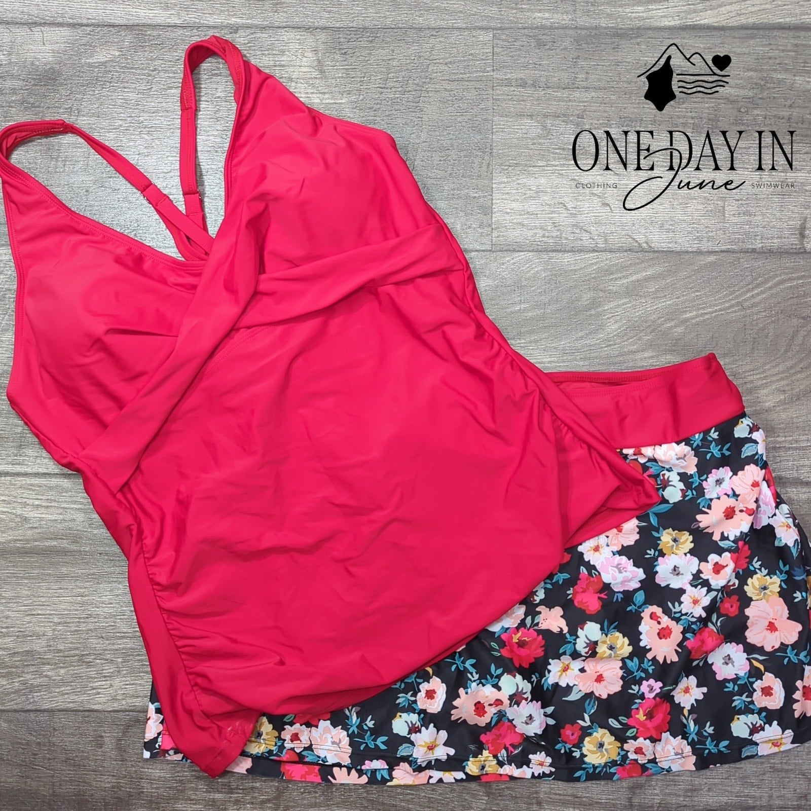 This red floral tankini will make you shine bright, with a skirted bottom that's such a delight! Made with stretchy fabric that fits just right, you'll splash and swim from morning to night!