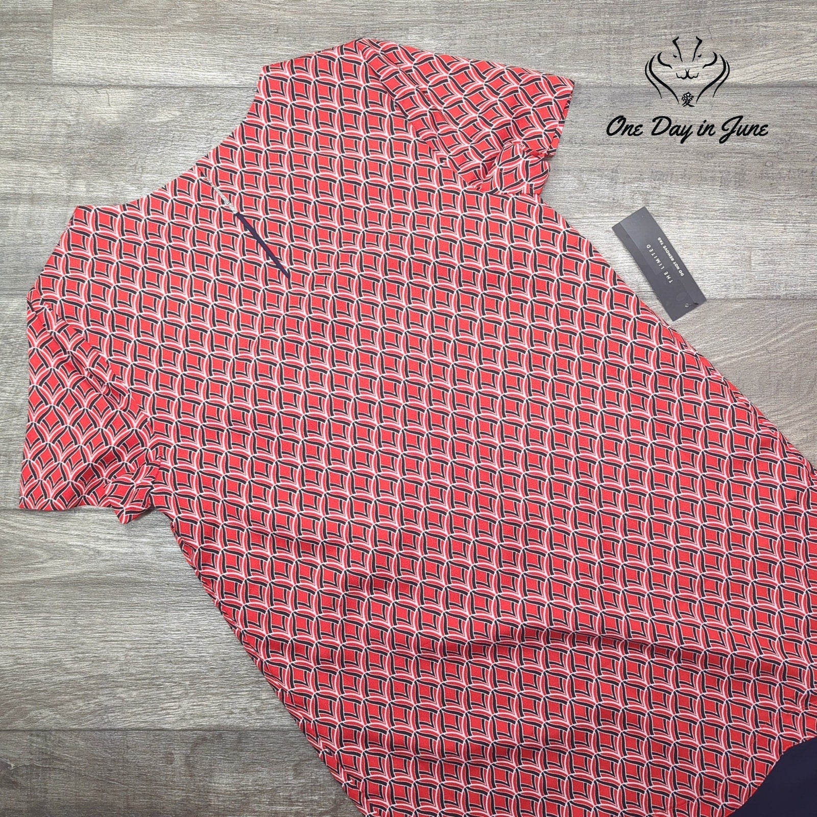 A most becoming crimson frock, fresh from the dressmaker's establishment with its original proclamation of worth still affixed. This charming short-sleeved creation boasts a becoming abbreviated length, with a delightful polyester construction and matching lining that ensures both comfort and elegance for any occasion.