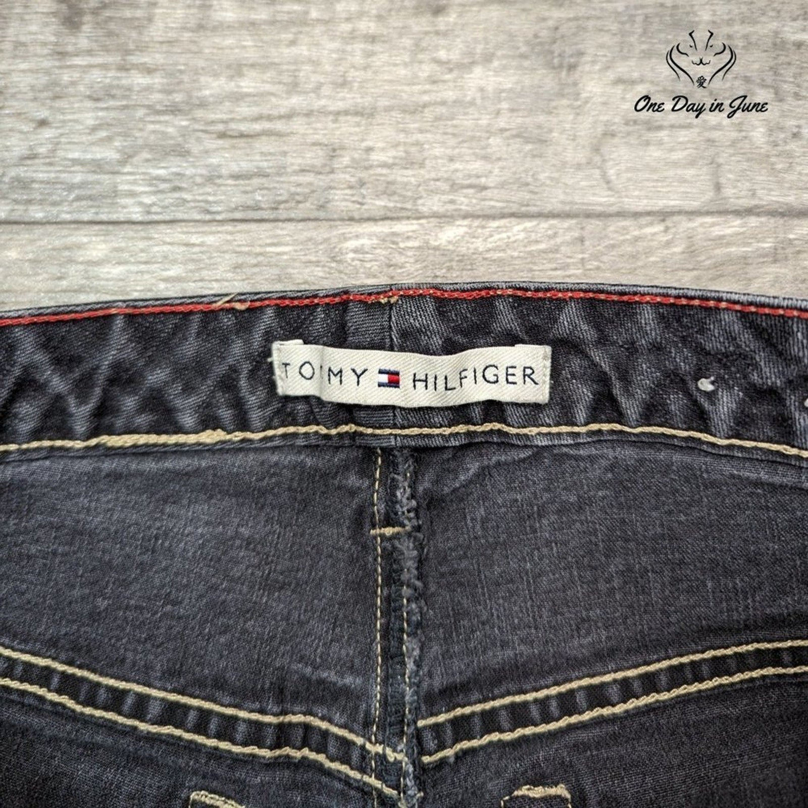 In sleek black, a pair of jeans that gleams, these Tommy Hilfiger denims are as cool as ice creams. Gently used, with a cotton/spandex blend to infuse, they're the perfect straight-leg choice to amuse!