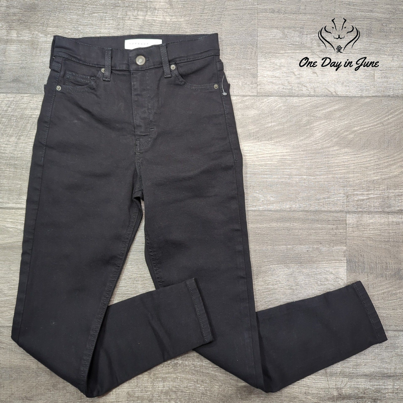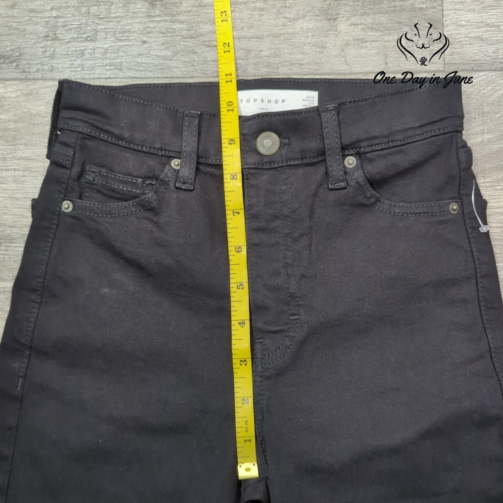 A most becoming pair of Jamie Skinny Jeans from the esteemed house of Topshop, these trousers are as dark as a moonless night and crafted with the utmost care. They are fashioned from a splendid blend of cotton and elastane, ensuring both comfort and a figure-flattering silhouette that would be the envy of any young lady at a country dance or promenade through town.