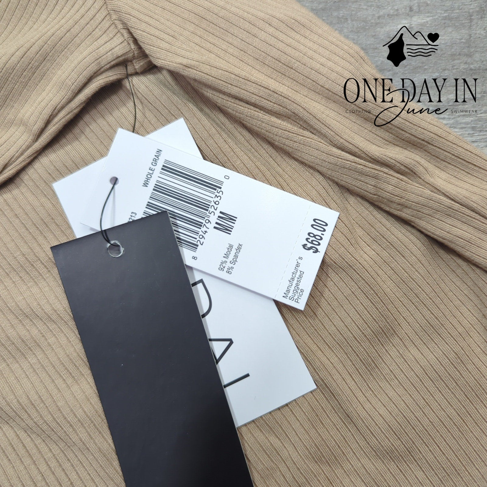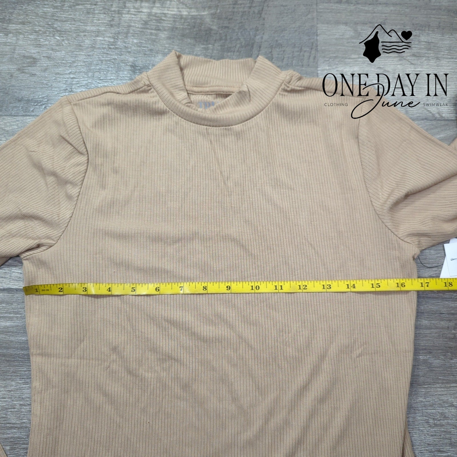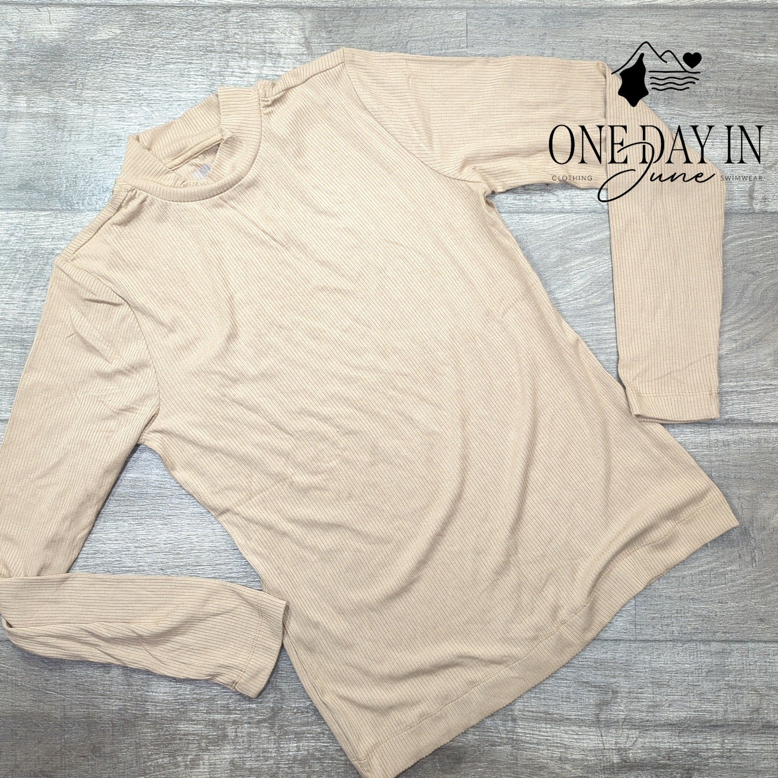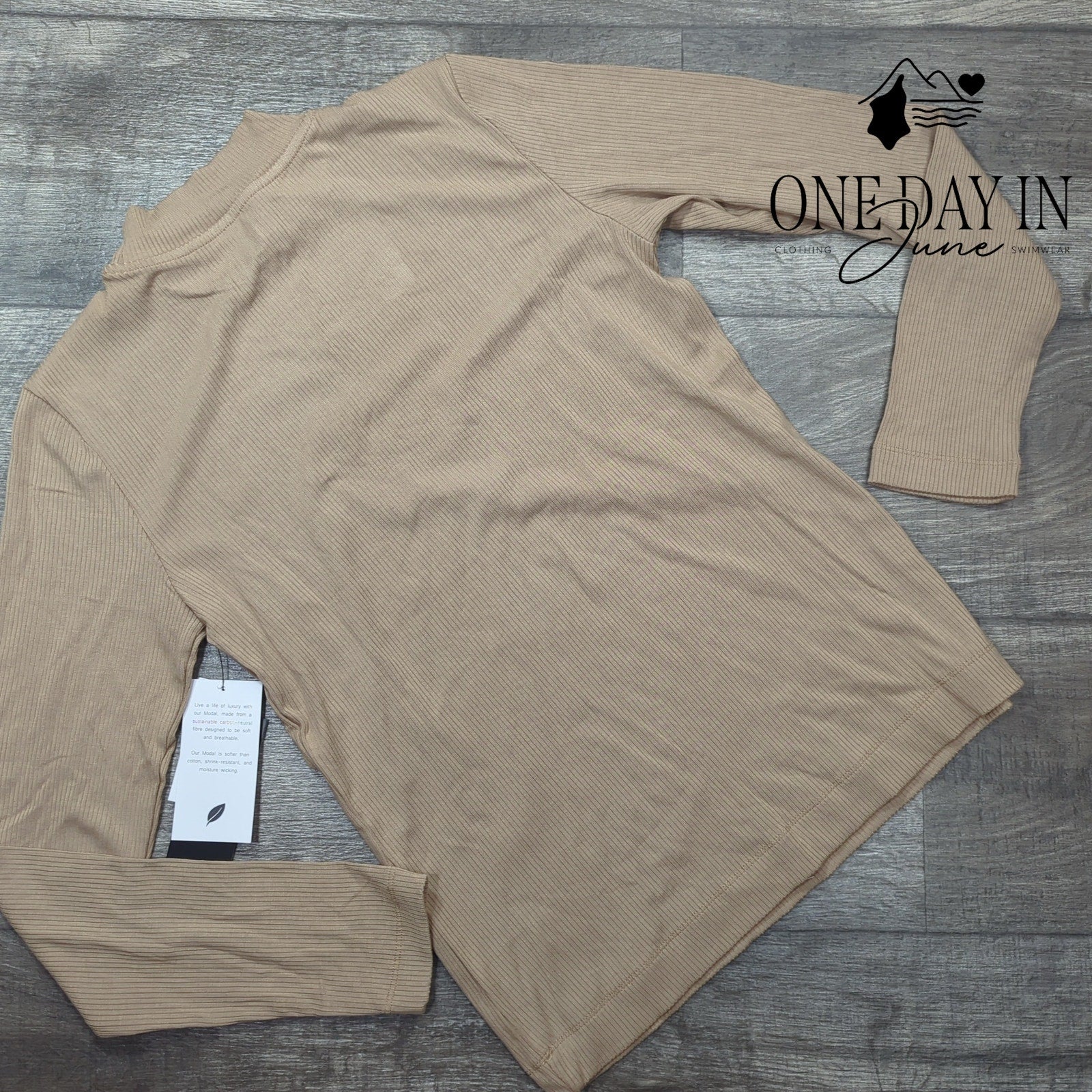 A most agreeable blouse in a becoming beige hue, fashioned with ribbed texture and long sleeves to suit the discerning lady's wardrobe. The fabric, being a blend of modal and spandex, offers both the softness of fine cloth and the practical advantage of ease in movement. New with tags, this Truth piece promises to be a versatile addition to one's collection, suitable for morning calls or afternoon engagements.