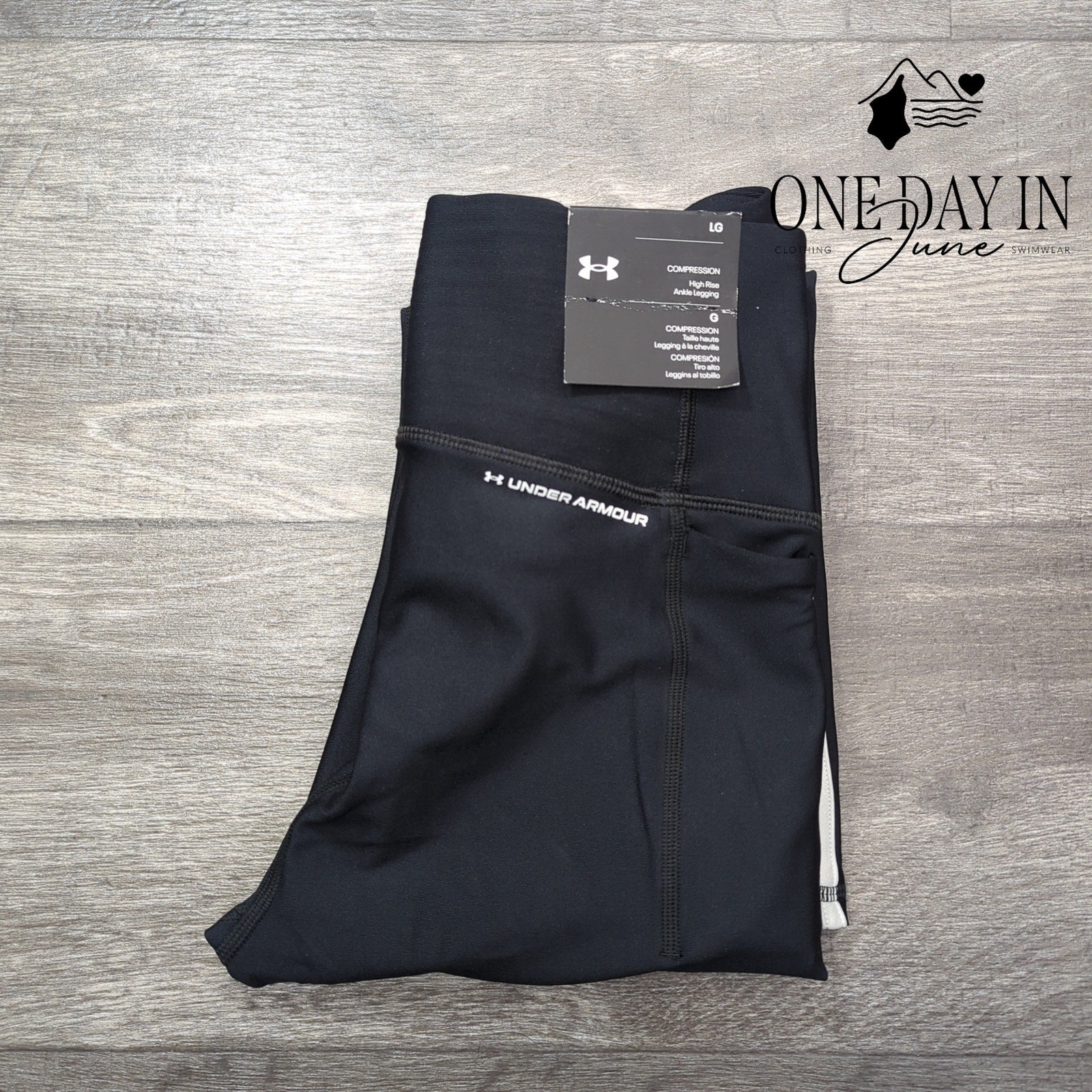 These sleek Under Armour leggings capture the essence of modern athleticism with their high-rise silhouette that flatters like moonlight on water. Crafted from a luxurious polyester and spandex blend, they move with the fluid grace of a Charleston dancer while maintaining their pristine black elegance. Perfect for the contemporary woman who demands both performance and style, these ankle-length beauties promise to elevate any workout or casual ensemble with effortless sophistication.