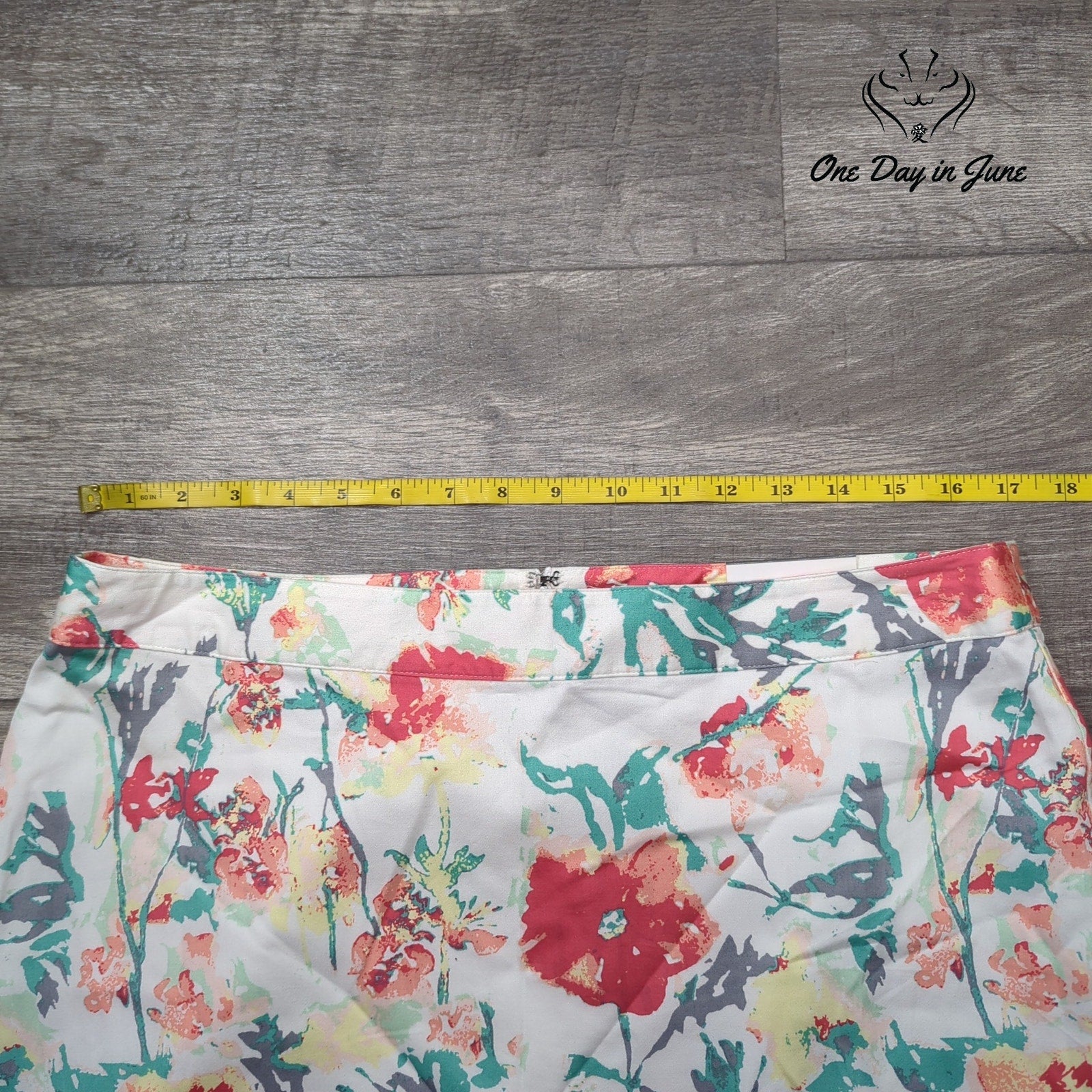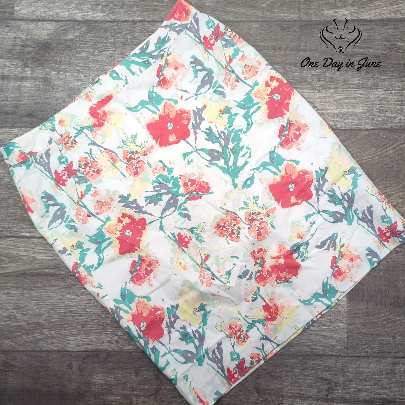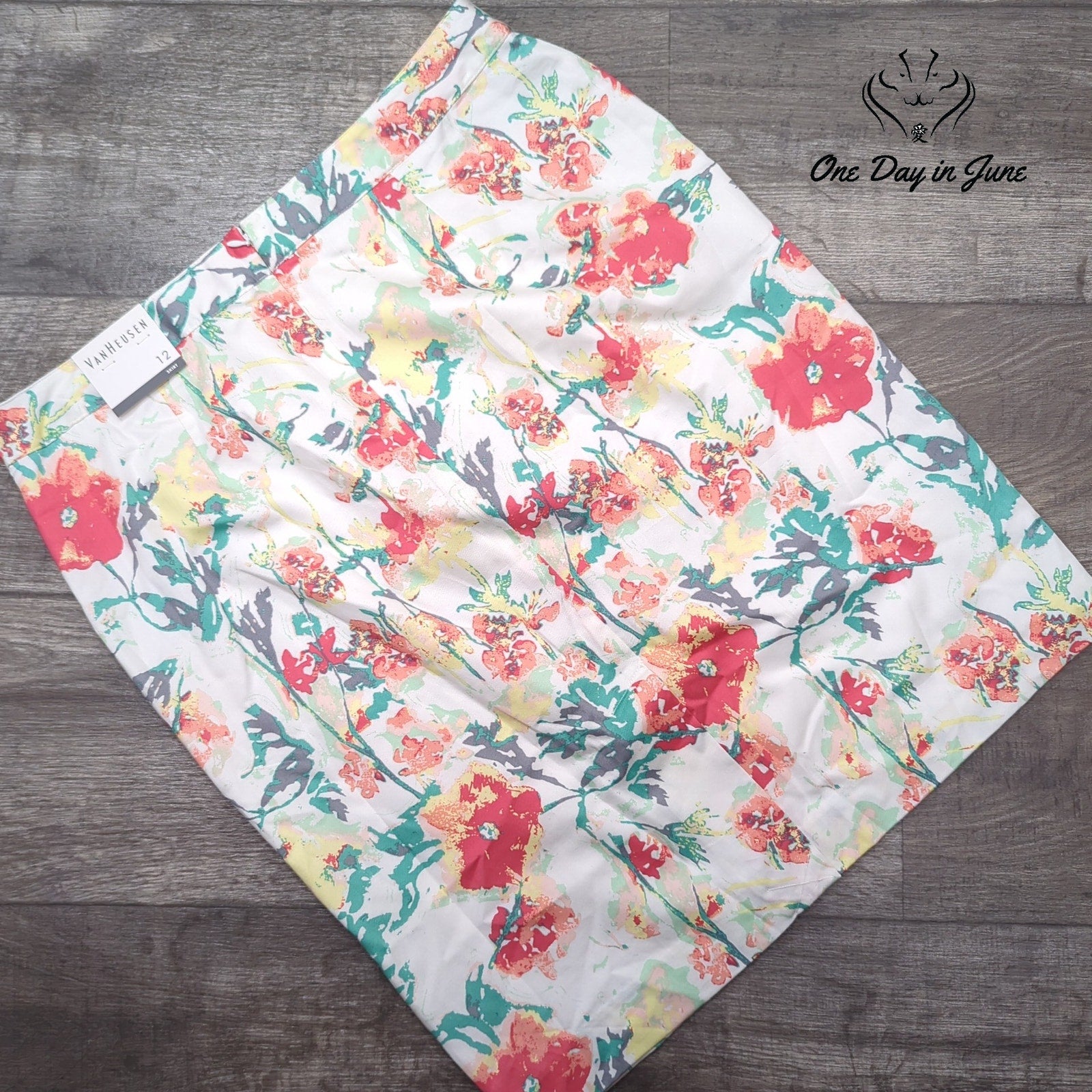 A most becoming floral skirt from the esteemed House of Van Heusen, crafted with the finest cotton and adorned with a delightful pattern upon pristine white fabric. This brand new garment, still bearing its original proclamation of worth, features a tasteful knee-length silhouette and is thoughtfully lined in cotton for the utmost comfort and propriety.
