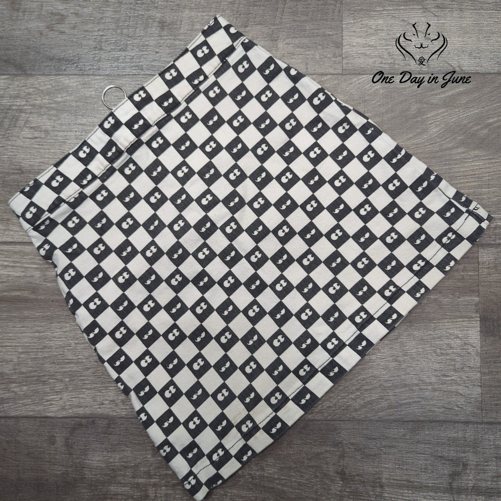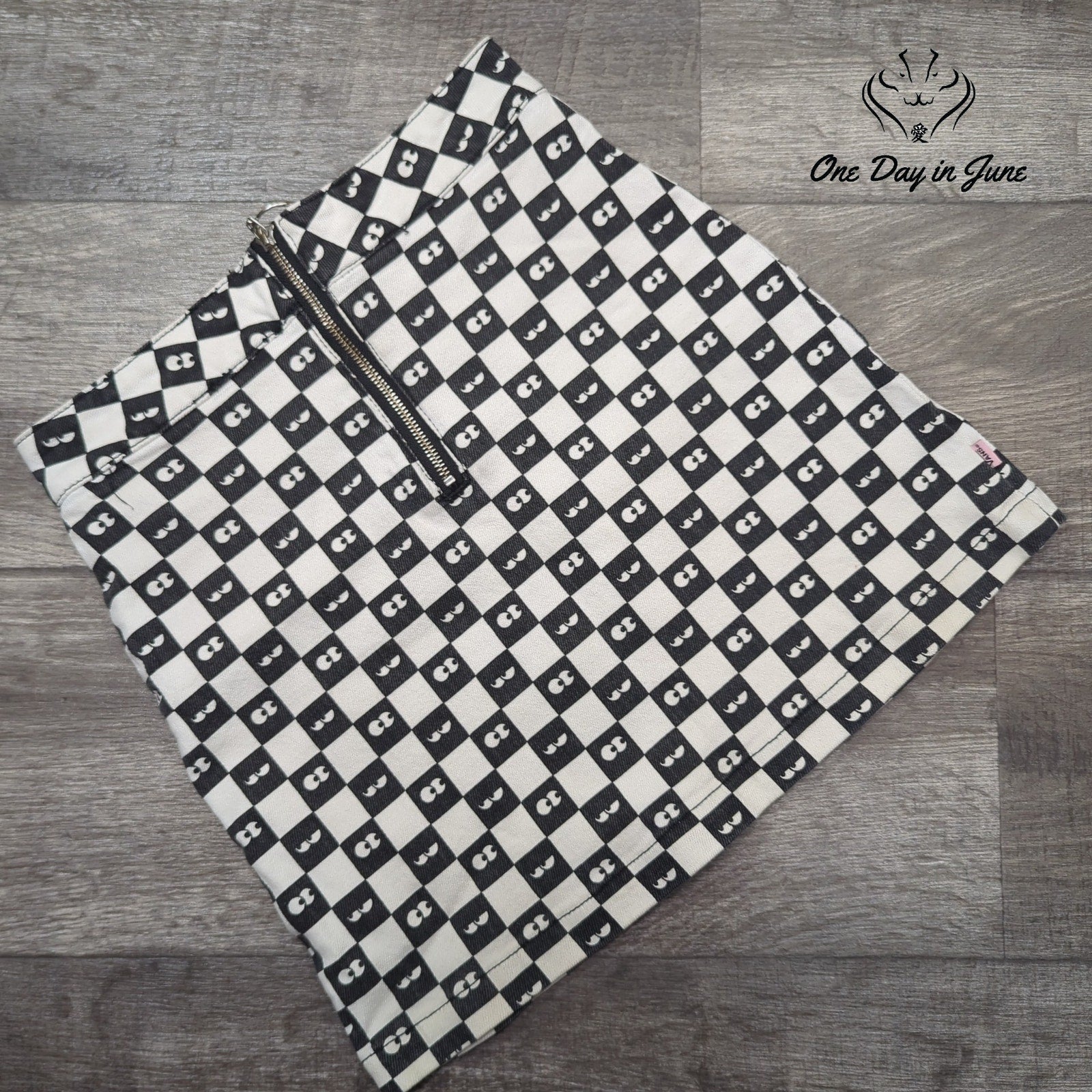 A vision in monochrome, this Vans Lazy Oaf denim mini skirt captures the essence of carefree youth. Its pristine white canvas, adorned with stark black accents, evokes the jazz-filled nights of a bygone era, while its cotton-rich fabric promises comfort for the modern adventurer.