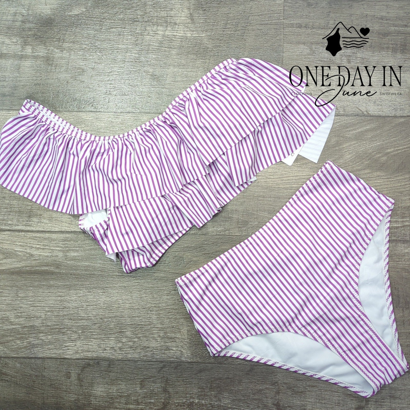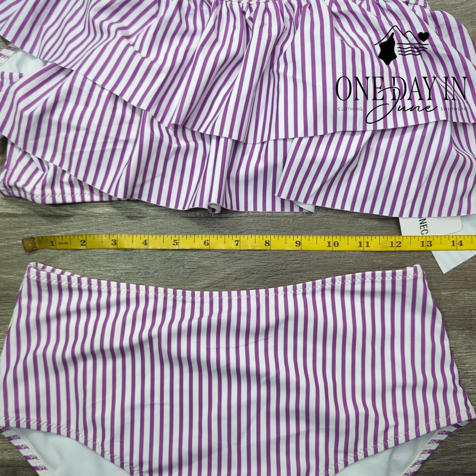 A most charming one-shoulder confection in delightful purple and white, this ruffle-adorned bikini possesses all the elegance required for a lady's aquatic pursuits. The asymmetrical design speaks to a refined taste for the fashionably unconventional, while the fluttering ruffles add a touch of romantic whimsy to one's seaside ensemble. Crafted from a blend of polyester and spandex, it promises both comfort and a most flattering silhouette for the discerning lady of leisure.