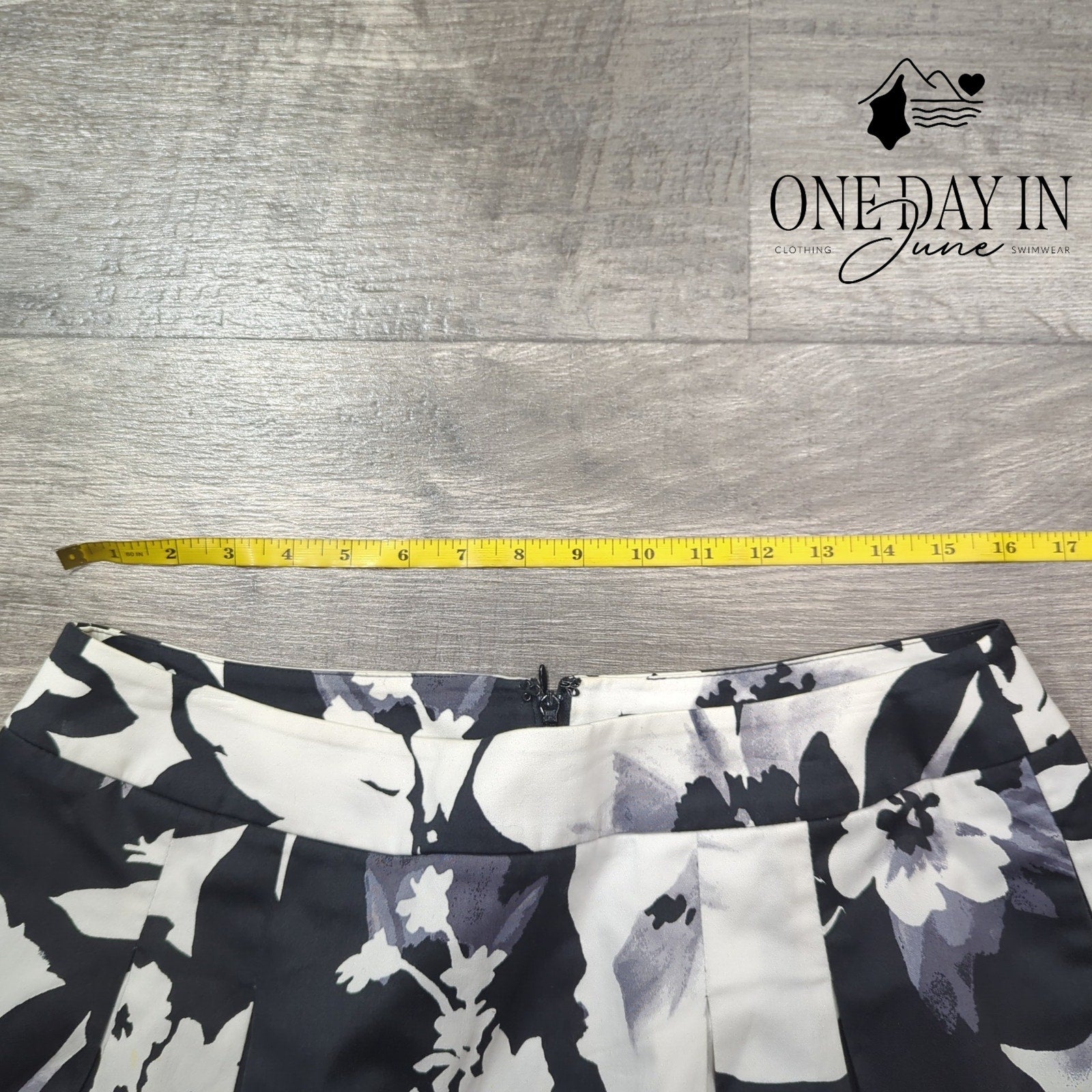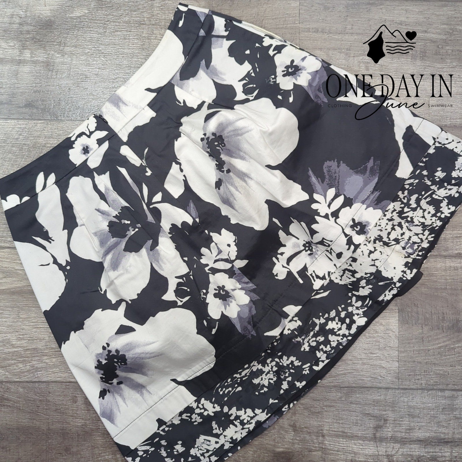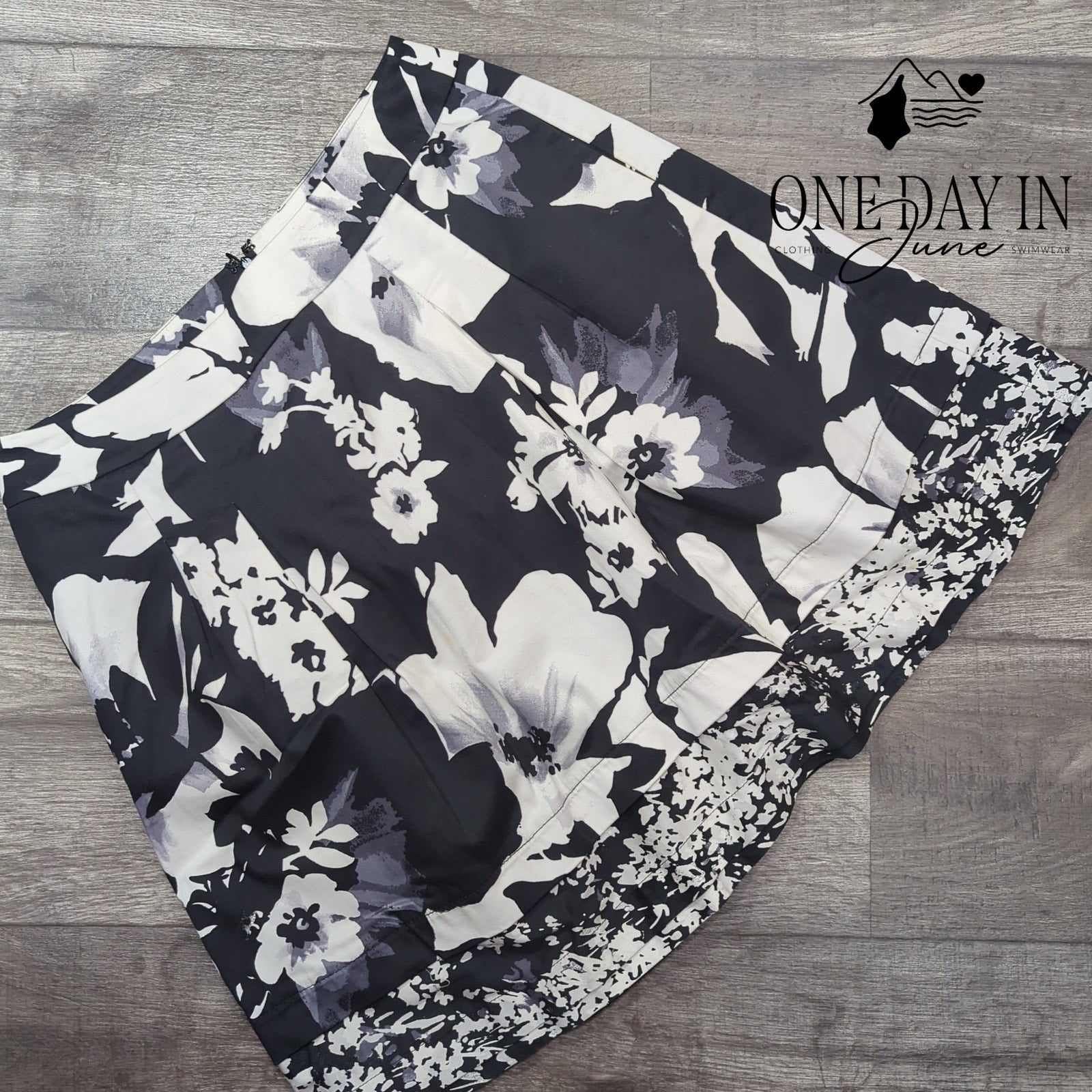 This delightful A-line skirt swirls and twirls in black and white, oh what a sight! Made with cotton so soft and fine, with just a stretch to make you shine!