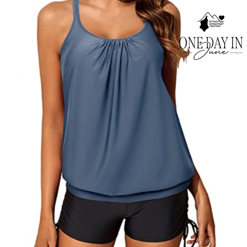This exquisite blouson tankini captures the essence of summer elegance with its sophisticated blue and grey palette, reminiscent of twilight skies over the Riviera. The drawstring boy short design offers both comfort and grace, crafted from a luxurious polyester-spandex blend that moves like silk against sun-kissed skin. A timeless piece that whispers of lazy afternoons by crystalline waters and the promise of endless summer days.